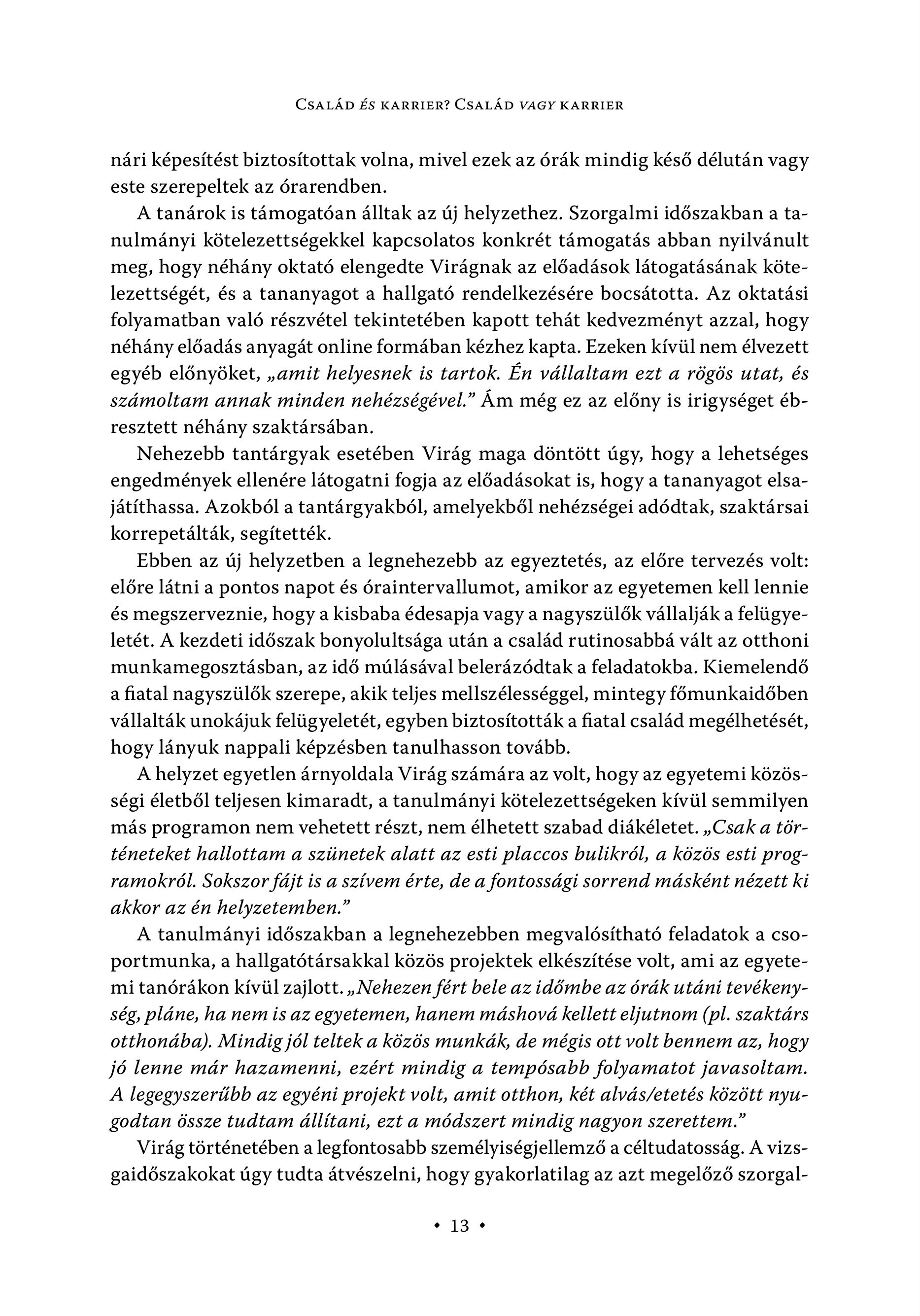 CSALÁD ÉS KARRIER? CSALÁD VAGY KARRIER nári képesítést biztosítottak volna, mivel ezek az órák mindig késő délután vagy este szerepeltek az órarendben. A tanárok is támogatóan álltak az új helyzethez. Szorgalmi időszakban a tanulmányi kötelezettségekkel kapcsolatos konkrét támogatás abban nyilvánult meg, hogy néhány oktató elengedte Virágnak az előadások látogatásának kötelezettségét, és a tananyagot a hallgató rendelkezésére bocsátotta. Az oktatási folyamatban való részvétel tekintetében kapott tehát kedvezményt azzal, hogy néhány előadás anyagát online formában kézhez kapta. Ezeken kívül nem élvezett egyéb előnyöket, , amit helyesnek is tartok. Én vállaltam ezt a rögös utat, és számoltam annak minden nehézségével." Ám még ez az előny is irigységet ébresztett néhány szaktársában. Nehezebb tantárgyak esetében Virág maga döntött úgy, hogy a lehetséges engedmények ellenére látogatni fogja az előadásokat is, hogy a tananyagot elsajátíthassa. Azokból a tantárgyakból, amelyekből nehézségei adódtak, szaktársai korrepetálták, segítették. Ebben az új helyzetben a legnehezebb az egyeztetés, az előre tervezés volt: előre látni a pontos napot és óraintervallumot, amikor az egyetemen kell lennie és megszerveznie, hogy a kisbaba édesapja vagy a nagyszülők vállalják a felügyeletét. A kezdeti időszak bonyolultsága után a család rutinosabbá vált az otthoni munkamegosztásban, az idő múlásával belerázódtak a feladatokba. Kiemelendő a fiatal nagyszülők szerepe, akik teljes mellszélességgel, mintegy főmunkaidőben vállalták unokájuk felügyeletét, egyben biztosították a fiatal család megélhetését, hogy lányuk nappali képzésben tanulhasson tovább. A helyzet egyetlen árnyoldala Virág számára az volt, hogy az egyetemi közösségi életből teljesen kimaradt, a tanulmányi kötelezettségeken kívül semmilyen más programon nem vehetett részt, nem élhetett szabad diákéletet. , Csak a történeteket hallottam a szünetek alatt az esti placcos bulikról, a közös esti programokról. Sokszor fájt is a szívem érte, de a fontossági sorrend másként nézett ki akkor az én helyzetemben." A tanulmányi időszakban a legnehezebben megvalósítható feladatok a csoportmunka, a hallgatótársakkal közös projektek elkészítése volt, ami az egyetemi tanórákon kívül zajlott. , Nehezen fért bele az időmbe az órák utáni tevékenység, pláne, ha nem is az egyetemen, hanem máshová kellett eljutnom (pl. szaktárs otthonába). Mindig jól teltek a közös munkák, de mégis ott volt bennem az, hogy jó lenne már hazamenni, ezért mindig a tempósabb folyamatot javasoltam. A legegyszerűbb az egyéni projekt volt, amit otthon, két alvás/etetés között nyugodtan össze tudtam állítani, ezt a módszert mindig nagyon szerettem." Virág történetében a legfontosabb személyiségjellemző a céltudatosság. A vizsgaidőszakokat úgy tudta átvészelni, hogy gyakorlatilag az azt megelőző szorgals 13 e