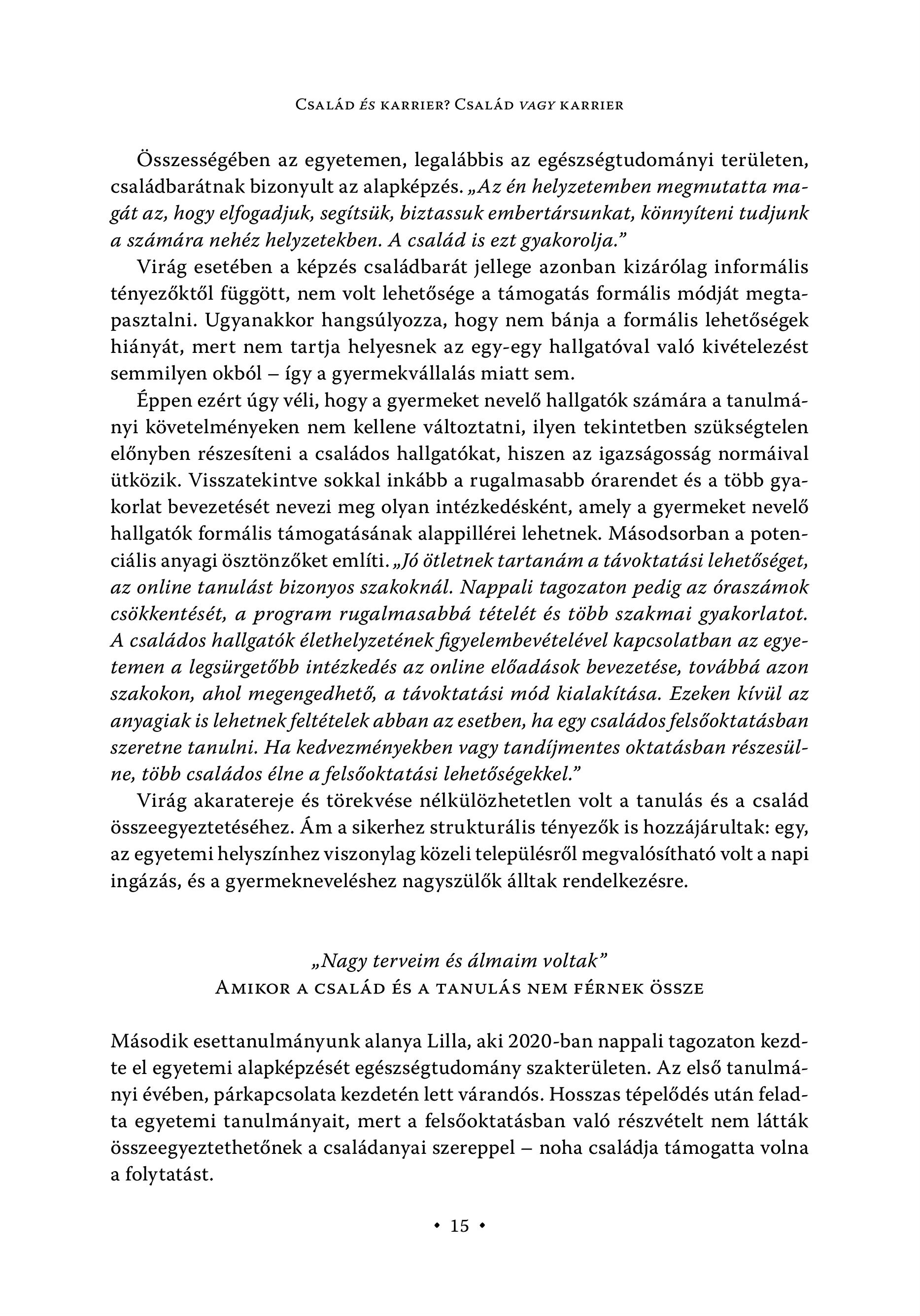 CSALÁD ÉS KARRIER? CSALÁD VAGY KARRIER Összességében az egyetemen, legalábbis az egészségtudományi területen, családbarátnak bizonyult az alapképzés. , Az én helyzetemben megmutatta magát az, hogy elfogadjuk, segítsük, biztassuk embertársunkat, könnyíteni tudjunk a számára nehéz helyzetekben. A család is ezt gyakorolja." Virág esetében a képzés családbarát jellege azonban kizárólag informális tényezőktől függött, nem volt lehetősége a támogatás formális módját megtapasztalni. Ugyanakkor hangsúlyozza, hogy nem bánja a formális lehetőségek hiányát, mert nem tartja helyesnek az egy-egy hallgatóval való kivételezést semmilyen okból - így a gyermekvállalás miatt sem. Éppen ezért úgy véli, hogy a gyermeket nevelő hallgatók számára a tanulmányi követelményeken nem kellene változtatni, ilyen tekintetben szükségtelen előnyben részesíteni a családos hallgatókat, hiszen az igazságosság normáival ütközik. Visszatekintve sokkal inkább a rugalmasabb órarendet és a több gyakorlat bevezetését nevezi meg olyan intézkedésként, amely a gyermeket nevelő hallgatók formális támogatásának alappillérei lehetnek. Másodsorban a potenciális anyagi ösztönzőket említi. , Jó ötletnek tartanám a távoktatási lehetőséget, az online tanulást bizonyos szakoknál. Nappali tagozaton pedig az óraszámok csökkentését, a program rugalmasabbá tételét és több szakmai gyakorlatot. A családos hallgatók élethelyzetének figyelembevételével kapcsolatban az egyetemen a legsürgetőbb intézkedés az online előadások bevezetése, továbbá azon szakokon, ahol megengedhető, a távoktatási mód kialakítása. Ezeken kívül az anyagiak is lehetnek feltételek abban az esetben, ha egy családos felsőoktatásban szeretne tanulni. Ha kedvezményekben vagy tandíjmentes oktatásban részesülne, több családos élne a felsőoktatási lehetőségekkel." Virág akaratereje és törekvése nélkülözhetetlen volt a tanulás és a család összeegyeztetéséhez. Ám a sikerhez strukturális tényezők is hozzájárultak: egy, az egyetemi helyszínhez viszonylag közeli településről megvalósítható volt a napi ingázás, és a gyermekneveléshez nagyszülők álltak rendelkezésre. s Nagy terveim és álmaim voltak" AMIKOR A CSALÁD ÉS A TANULÁS NEM FÉRNEK ÖSSZE Második esettanulmányunk alanya Lilla, aki 2020-ban nappali tagozaton kezdte el egyetemi alapképzését egészségtudomány szakterületen. Az első tanulmänyi évében, párkapcsolata kezdetén lett várandós. Hosszas tépelődés után feladta egyetemi tanulmányait, mert a felsőoktatásban való részvételt nem látták összeegyeztethetőnek a családanyai szereppel — noha családja támogatta volna a folytatást. + 15 +