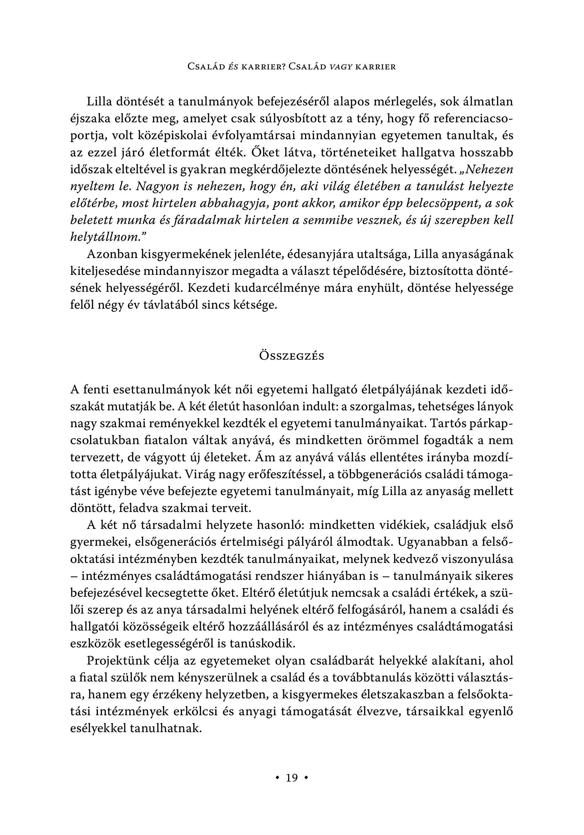 CSALÁD ÉS KARRIER? CSALÁD VAGY KARRIER Lilla döntését a tanulmányok befejezéséről alapos mérlegelés, sok álmatlan éjszaka előzte meg, amelyet csak súlyosbított az a tény, hogy fő referenciacsoportja, volt középiskolai évfolyamtársai mindannyian egyetemen tanultak, és az ezzel járó életformát élték. Őket látva, történeteiket hallgatva hosszabb időszak elteltével is gyakran megkérdőjelezte döntésének helyességét. , Nehezen nyeltem le. Nagyon is nehezen, hogy én, aki világ életében a tanulást helyezte előtérbe, most hirtelen abbahagyja, pont akkor, amikor épp belecsöppent, a sok beletett munka és fáradalmak hirtelen a semmibe vesznek, és új szerepben kell helytállnom." Azonban kisgyermekének jelenléte, édesanyjára utaltsága, Lilla anyaságának kiteljesedése mindannyiszor megadta a választ tépelődésére, biztosította döntésének helyességéről. Kezdeti kudarcélménye mára enyhült, döntése helyessége felől négy év távlatából sincs kétsége. ÖSSZEGZÉS A fenti esettanulmányok két női egyetemi hallgató életpályájának kezdeti időszakát mutatják be. A két életút hasonlóan indult: a szorgalmas, tehetséges lányok nagy szakmai reményekkel kezdték el egyetemi tanulmányaikat. Tartós párkapcsolatukban fiatalon váltak anyává, és mindketten örömmel fogadták a nem tervezett, de vágyott új életeket. Ám az anyává válás ellentétes irányba mozdította életpályájukat. Virág nagy erőfeszítéssel, a többgenerációs családi támogatást igénybe véve befejezte egyetemi tanulmányait, míg Lilla az anyaság mellett döntött, feladva szakmai terveit. A két nő társadalmi helyzete hasonló: mindketten vidékiek, családjuk első gyermekei, elsőgenerációs értelmiségi pályáról álmodtak. Ugyanabban a felsőoktatási intézményben kezdték tanulmányaikat, melynek kedvező viszonyulása — intézményes családtámogatási rendszer hiányában is — tanulmányaik sikeres befejezésével kecsegtette őket. Eltérő életútjuk nemcsak a családi értékek, a szülői szerep és az anya társadalmi helyének eltérő felfogásáról, hanem a családi és hallgatói közösségeik eltérő hozzáállásáról és az intézményes családtámogatási eszközök esetlegességéről is tanúskodik. Projektünk célja az egyetemeket olyan családbarát helyekké alakítani, ahol a fiatal szülők nem kényszerülnek a család és a továbbtanulás közötti választásra, hanem egy érzékeny helyzetben, a kisgyermekes életszakaszban a felsőoktatási intézmények erkölcsi és anyagi támogatását élvezve, társaikkal egyenlő esélyekkel tanulhatnak. s ]9 e