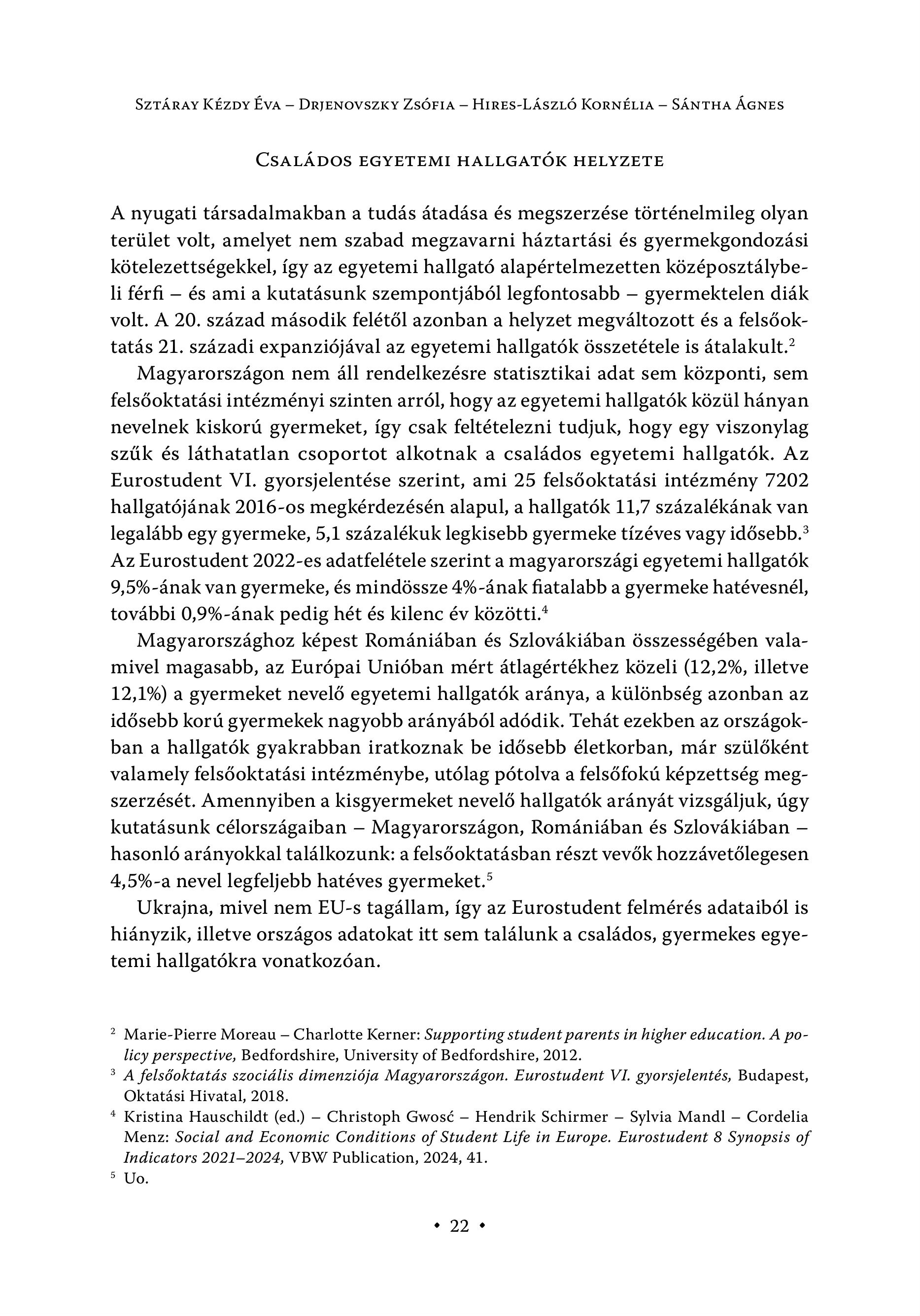 SZTÁRAY KÉZDY ÉvA — DRJENOVSZKY ZSÓFIA — HIRES-LÁSZLÓ KORNÉLIA — SÁNTHA ÁGNES CSALÁDOS EGYETEMI HALLGATÓK HELYZETE A nyugati társadalmakban a tudás átadása és megszerzése történelmileg olyan terület volt, amelyet nem szabad megzavarni háztartási és gyermekgondozási kötelezettségekkel, így az egyetemi hallgató alapértelmezetten középosztálybeli férfi — és ami a kutatásunk szempontjából legfontosabb — gyermektelen diák volt. A 20. század második felétől azonban a helyzet megváltozott és a felsőoktatás 21. századi expanziójával az egyetemi hallgatók összetétele is átalakult.? Magyarországon nem áll rendelkezésre statisztikai adat sem központi, sem felsőoktatási intézményi szinten arról, hogy az egyetemi hallgatók közül hányan nevelnek kiskorú gyermeket, így csak feltételezni tudjuk, hogy egy viszonylag szűk és láthatatlan csoportot alkotnak a családos egyetemi hallgatók. Az Eurostudent VI. gyorsjelentése szerint, ami 25 felsőoktatási intézmény 7202 hallgatójának 2016-os megkérdezésén alapul, a hallgatók 11,7 százalékának van legalább egy gyermeke, 5,1 százalékuk legkisebb gyermeke tízéves vagy idősebb.? Az Eurostudent 2022-es adatfelétele szerint a magyarországi egyetemi hallgatók 9,5%-änak van gyermeke, es mindössze 496-ának fiatalabb a gyermeke hatévesnél, toväbbi 0,9%-änak pedig hét és kilenc év közötti." Magyarországhoz képest Romániában és Szlovákiában összességében valamivel magasabb, az Európai Unióban mért átlagértékhez közeli (12,296, illetve 12,1%) a gyermeket nevelő egyetemi hallgatók aránya, a különbség azonban az idősebb korú gyermekek nagyobb arányából adódik. Tehát ezekben az országokban a hallgatók gyakrabban iratkoznak be idősebb életkorban, már szülőként valamely felsőoktatási intézménybe, utólag pótolva a felsőfokú képzettség megszerzését. Amennyiben a kisgyermeket nevelő hallgatók arányát vizsgáljuk, úgy kutatásunk célországaiban — Magyarországon, Romániában és Szlovákiában — hasonló arányokkal találkozunk: a felsőoktatásban részt vevők hozzávetőlegesen 4,5%-a nevel legfeljebb hatéves gyermeket." Ukrajna, mivel nem EU-s tagállam, így az Eurostudent felmérés adataiból is hiányzik, illetve országos adatokat itt sem találunk a családos, gyermekes egyetemi hallgatókra vonatkozóan. ? Marie-Pierre Moreau — Charlotte Kerner: Supporting student parents in higher education. A policy perspective, Bedfordshire, University of Bedfordshire, 2012. A felsőoktatás szociális dimenziója Magyarországon. Eurostudent VI. gyorsjelentés, Budapest, Oktatási Hivatal, 2018. * Kristina Hauschildt (ed.) — Christoph Gwos€ - Hendrik Schirmer — Sylvia Mandl — Cordelia Menz: Social and Economic Conditions of Student Life in Europe. Eurostudent 8 Synopsis of Indicators 2021-2024, VBW Publication, 2024, 41. 5 Uo. 3 s 22 e
