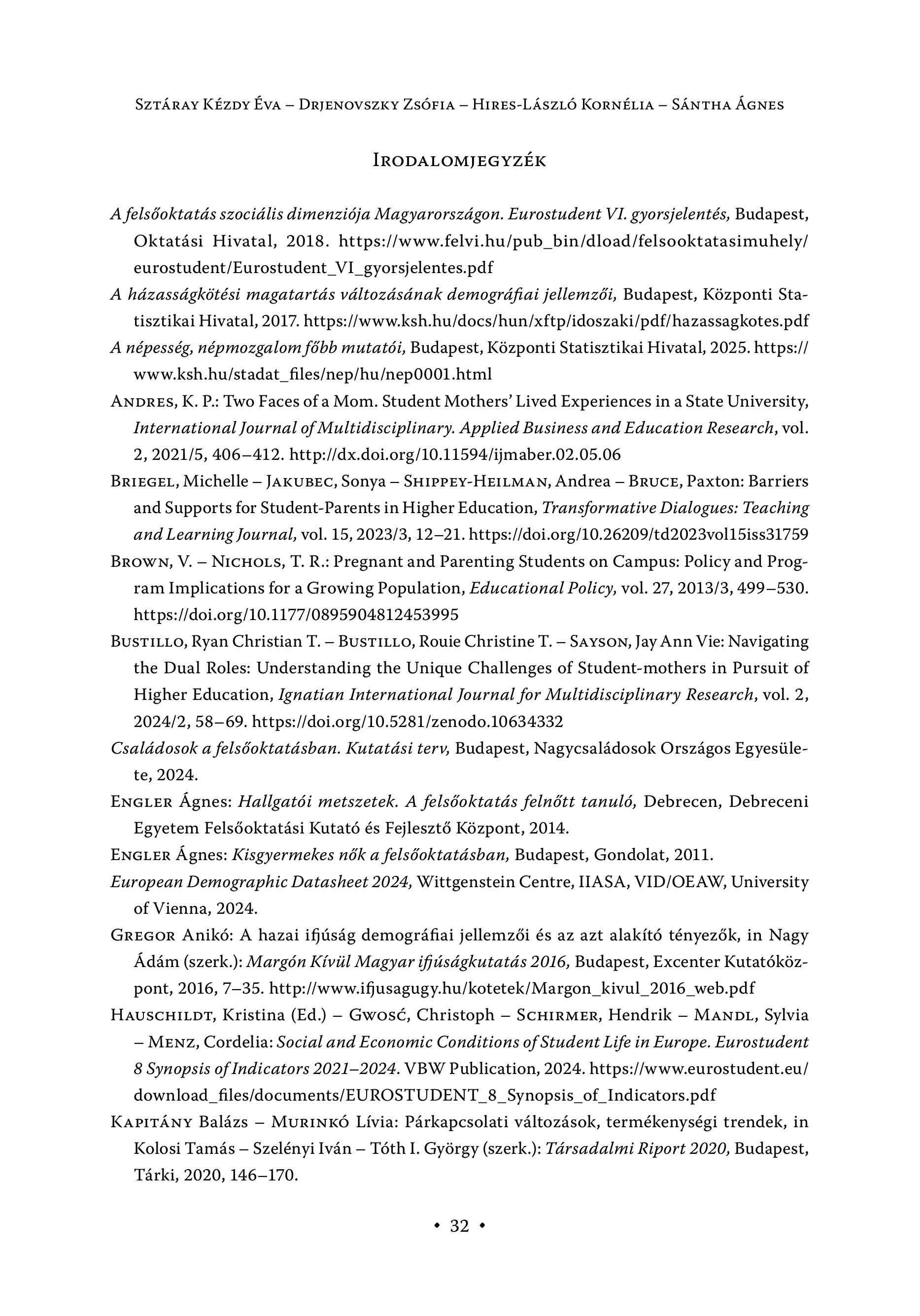 SZTÁRAY KÉZDY ÉvA — DRJENOVSZKY ZSÓFIA — HIRES-LÁSZLÓ KORNÉLIA — SÁNTHA ÁGNES IRODALOMJEGYZÉK A felsőoktatás szociális dimenziója Magyarországon. Eurostudent VI. gyorsjelentés, Budapest, Oktatäsi Hivatal, 2018. https://www.felvi.hu/pub_bin/dload/felsooktatasimuhely/ eurostudent/Eurostudent_VI_gyorsjelentes.pdf A házasságkötési magatartás változásának demográfiai jellemzői, Budapest, Központi Statisztikai Hivatal, 2017. https://www.ksh.hu/docs/hun/xftp/idoszaki/pdf/hazassagkotes.pdf A népesség, népmozgalom főbb mutatói, Budapest, Központi Statisztikai Hivatal, 2025. https:// www.ksh.hu/stadat_files/nep/hu/nep0001.html ANDRES, K. P.: Two Faces ofa Mom. Student Mothers’ Lived Experiences in a State University, International Journal of Multidisciplinary. Applied Business and Education Research, vol. 2, 2021/5, 406-412. http://dx.doi.org/10.11594/ijmaber.02.05.06 BRIEGEL, Michelle - JAKUBEC, Sonya — SHIPPEY-HEILMAN, Andrea — BRUCE, Paxton: Barriers and Supports for Student-Parents in Higher Education, Transformative Dialogues: Teaching and Learning Journal, vol. 15, 2023/3, 12-21. https://doi.org/10.26209/td2023vol15iss31759 BROWN, V. — NICHOLS, T. R.: Pregnant and Parenting Students on Campus: Policy and Program Implications for a Growing Population, Educational Policy, vol. 27, 2013/3, 499-530. https://doi.org/10.1177/0895904812453995 BusTILLo, Ryan Christian T. - BUSTILLO, Rouie Christine T. - Sayson, Jay Ann Vie: Navigating the Dual Roles: Understanding the Unique Challenges of Student-mothers in Pursuit of Higher Education, Ignatian International Journal for Multidisciplinary Research, vol. 2, 2024/2, 58-69. https://doi.org/10.5281/zenodo.10634332 Családosok a felsőoktatásban. Kutatási terv, Budapest, Nagycsaládosok Országos Egyesülete, 2024. ENGLER Ágnes: Hallgatói metszetek. A felsőoktatás felnőtt tanuló, Debrecen, Debreceni Egyetem Felsőoktatási Kutató és Fejlesztő Központ, 2014. ENGLER Ágnes: Kisgyermekes nők a felsőoktatásban, Budapest, Gondolat, 2011. European Demographic Datasheet 2024, Wittgenstein Centre, IIASA, VID/OEAW, University of Vienna, 2024. GREGOR Anikó: A hazai ifúság demográfiai jellemzői és az azt alakító tényezők, in Nagy Adam (szerk.): Margón Kívül Magyar ifjúságkutatás 2016, Budapest, Excenter Kutatóközpont, 2016, 7—35. http://www.ifjusagugy.hu/kotetek/Margon kivul 2016 web.pdf HAUSCHILDT, Kristina (Ed.) - Gwosé, Christoph — SCHIRMER, Hendrik — MANDL, Sylvia — MENZ, Cordelia: Social and Economic Conditions of Student Life in Europe. Eurostudent 8 Synopsis of Indicators 2021-2024. VBW Publication, 2024. https://www.eurostudent.eu/ download_files/documents/EUROSTUDENT_8_Synopsis_of_Indicators.pdf KAPITÁNY Balázs — MURINKÓ Lívia: Párkapcsolati változások, termékenységi trendek, in Kolosi Tamás - Szelényi Iván — Tóth I. György (szerk.): Társadalmi Riport 2020, Budapest, Tarki, 2020, 146-170. + 32e