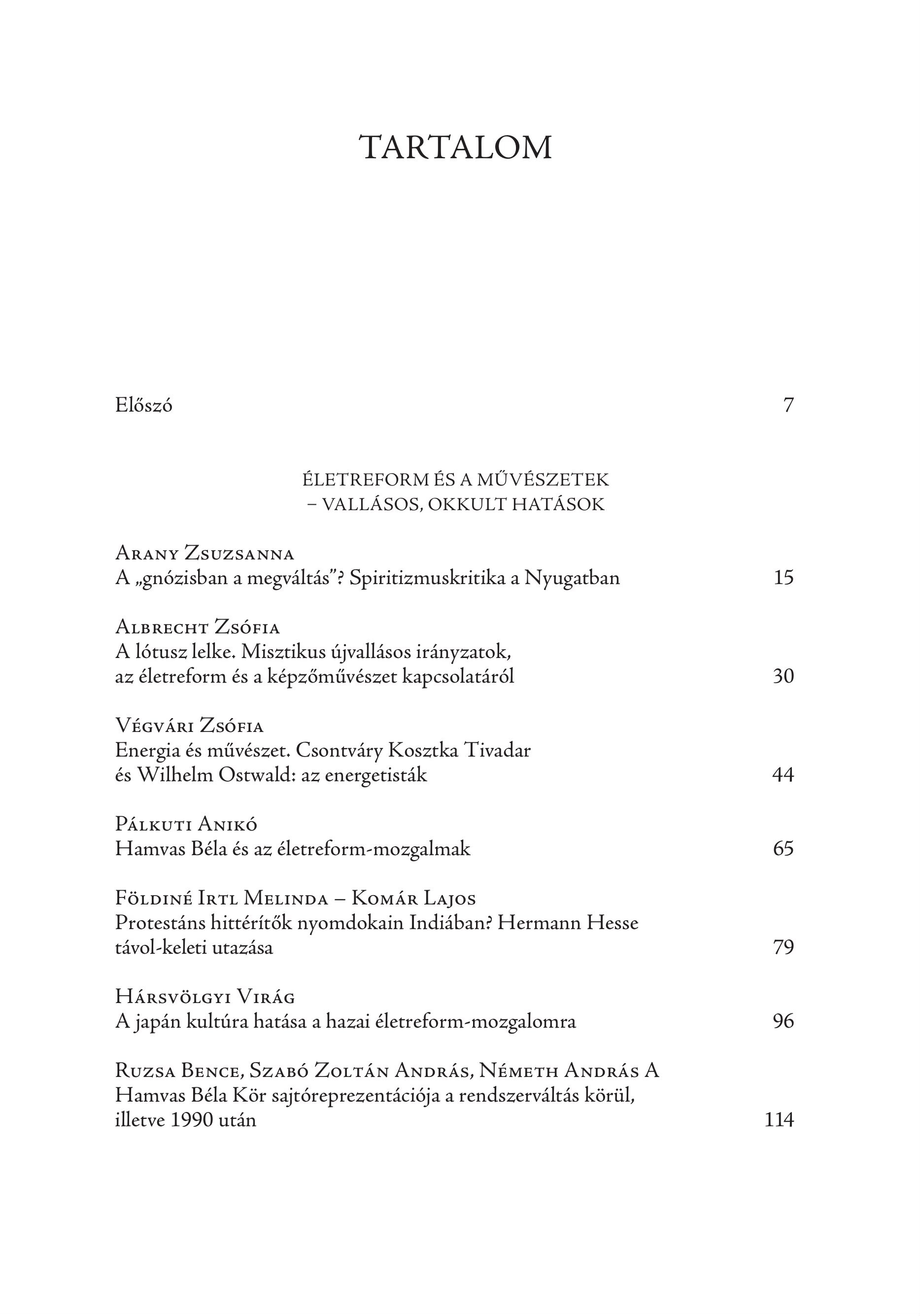 TARIALOM Előszó ÉLETREFORM ÉS A MŰVÉSZETEK - VALLÁSOS, OKKULTI HATÁSOK ÁRANY ZSUZSANNA A „gnözisban a megvältäs”? Spiritizmuskritika a Nyugatban ALBRECHT ZSOFIA A lótusz lelke. Misztikus újvallásos irányzatok, az életreform és a képzőművészet kapcsolatáról VÉGVÁRI ZSÓFIA Energia és művészet. Csontváry Kosztka Tivadar és Wilhelm Ostwald: az energetisták PALKUTI ANIKÖ Hamvas Béla és az életreform-mozgalmak FÖLDINÉ IRTL MELINDA — KoMÁR Lajos Protestáns hittérítők nyomdokain Indiában? Hermann Hesse távol-keleti utazása HÁRSVÖLGYI VIRÁG A japán kultúra hatdsa a hazai életreform-mozgalomra Ruzsa BENCE, SZABÓ ZOLTÁN ANDRAS, NEMETH ANDRAS A Hamvas Béla Kör sajtóreprezentációja a rendszerváltás körül, illetve 1990 után 15 30 44 65 79 96 114