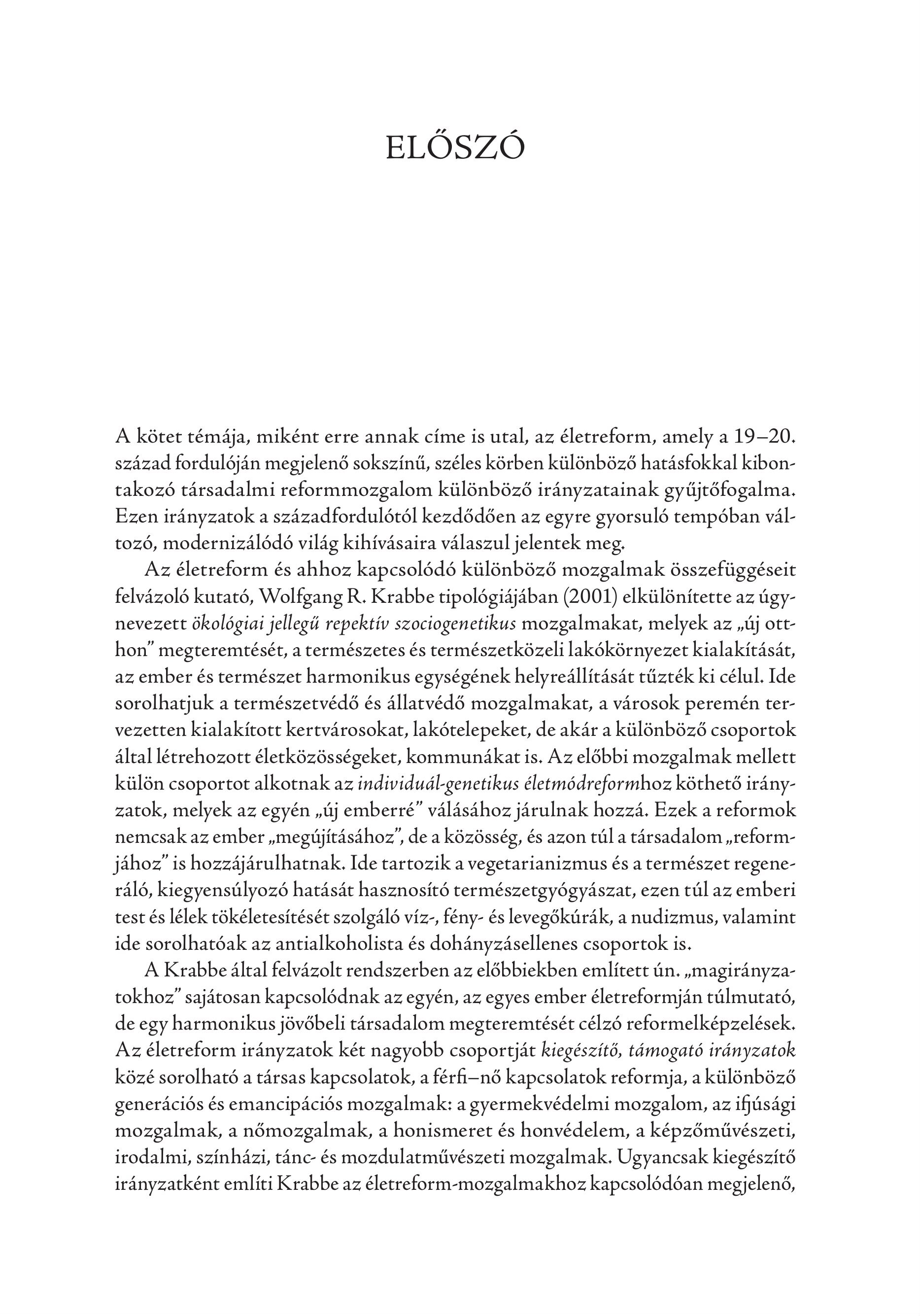 ELŐSZÓ A kötet témája, miként erre annak címe is utal, az életreform, amely a 19—20. század fordulóján megjelenő sokszínű, széles körben különböző hatásfokkal kibontakozó társadalmi reformmozgalom különböző irányzatainak gyűjtőfogalma. Ezen irányzatok a századfordulótól kezdődően az egyre gyorsuló tempóban változó, modernizálódó világ kihívásaira válaszul jelentek meg. Az életreform és ahhoz kapcsolódó különböző mozgalmak összefüggéseit felvázoló kutató, Wolfgang R. Krabbe tipológiájában (2001) elkülönítette az úgynevezett ökológiai jellegű repektiv szociogenetikus mozgalmakat, melyek az ,új otthon" megteremtését, a természetes és természetközeli lakókörnyezet kialakítását, az ember és természet harmonikus egységének helyreállítását tűzték ki célul. Ide sorolhatjuk a természetvédő és állatvédő mozgalmakat, a városok peremén tervezetten kialakított kertvárosokat, lakótelepeket, de akár a különböző csoportok által létrehozott életközösségeket, kommunákat is. Az előbbi mozgalmak mellett külön csoportot alkotnak az individuál-genetikus életmódreformhoz köthető irányzatok, melyek az egyén , új emberré" válásához járulnak hozzá. Ezek a reformok nemcsak az ember , megújításához" de a közösség, és azon túl a társadalom , reformjához" is hozzájárulhatnak. Ide tartozik a vegetarianizmus és a természet regeneráló, kiegyensúlyozó hatását hasznosító természetgyógyászat, ezen túl az emberi test és lélek tökéletesítését szolgáló víz-, fény- és levegőkúrák, a nudizmus, valamint ide sorolhatóak az antialkoholista és dohányzásellenes csoportok is. A Krabbe által felvázolt rendszerben az előbbiekben említett ún. ,magirányzatokhoz" sajátosan kapcsolódnak az egyén, az egyes ember életreformján túlmutató, de egy harmonikus jövőbeli társadalom megteremtését célzó reformelképzelések. Az életreform irányzatok két nagyobb csoportját kiegészítő, támogató irányzatok közé sorolható a társas kapcsolatok, a férfi—nő kapcsolatok reformja, a különböző generációs és emancipációs mozgalmak: a gyermekvédelmi mozgalom, az ifjúsági mozgalmak, a nőmozgalmak, a honismeret és honvédelem, a képzőművészeti, irodalmi, színházi, tánc- és mozdulatművészeti mozgalmak. Ugyancsak kiegészítő irányzatként emliti Krabbe az életreform-mozgalmakhoz kapcsolédéan megjelenő,