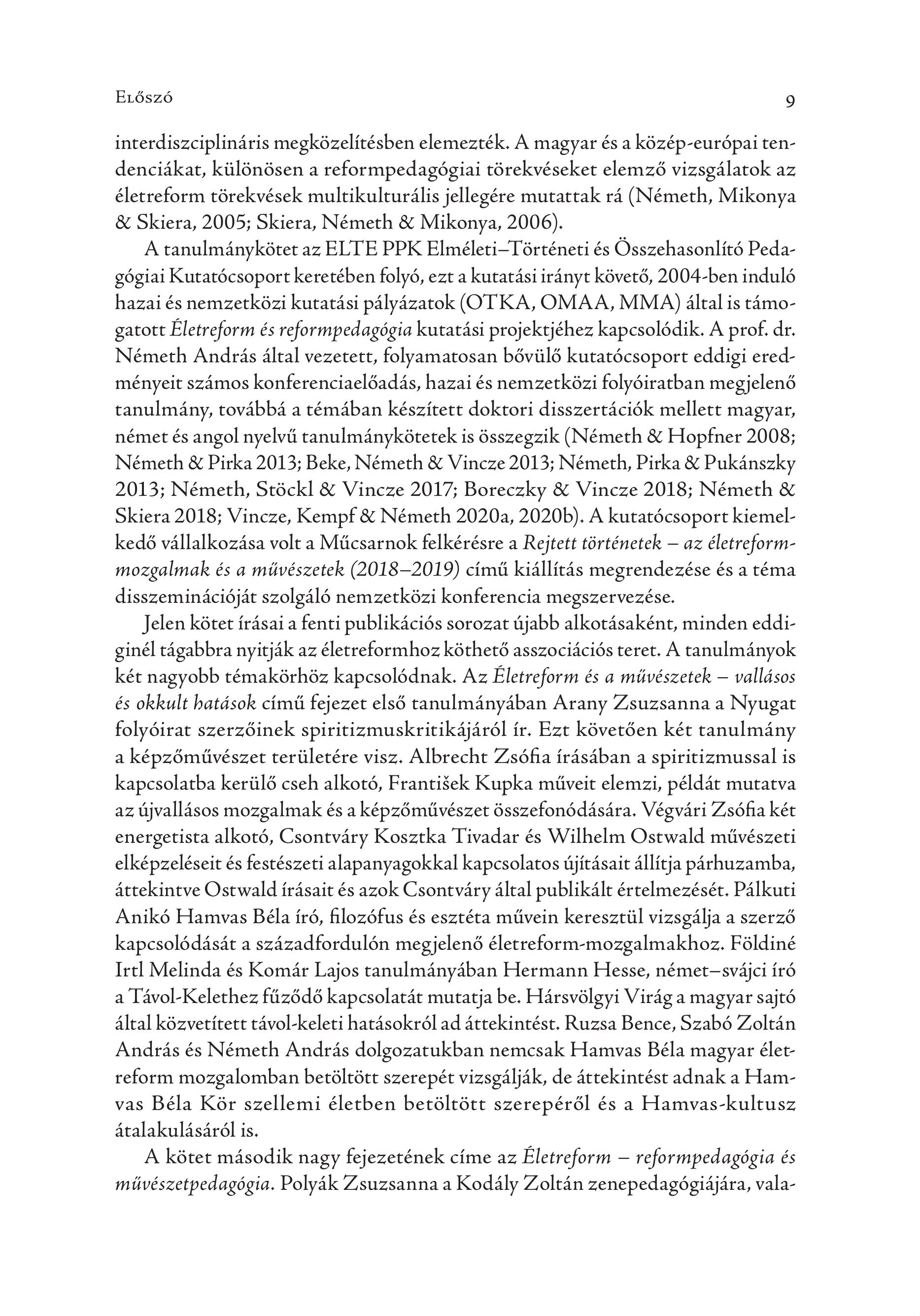 ELöszö 9 interdiszciplináris megközelítésben elemezték. A magyar és a közép-európai tendenciákat, különösen a reformpedagógiai törekvéseket elemző vizsgálatok az életreform törekvések multikulturális jellegére mutattak rá (Németh, Mikonya & Skiera, 2005; Skiera, Németh & Mikonya, 2006). A tanulmanykétet az ELTE PPK Elmeleti-Tört£neti és Osszehasonlité Pedagógiai Kutatócsoport keretében folyó, ezt a kutatási irányt követő, 2004-ben induló hazai és nemzetközi kutatási pályázatok (OTKA, OMAA, MMA,) által is támogatott Életreform és reformpedagógia kutatási projektjéhez kapcsolódik. A prof. dr. Németh András által vezetett, folyamatosan bővülő kutatócsoport eddigi eredményeit számos konferenciaelőadás, hazai és nemzetközi folyóiratban megjelenő tanulmány, továbbá a témában készített doktori disszertációk mellett magyar, német és angol nyelvű tanulmánykötetek is összegzik (Németh & Hopfner 2008; Németh & Pirka 2013; Beke, Németh & Vincze 2013; Németh, Pirka & Pukänszky 2013; Nemeth, Stöckl & Vincze 2017; Boreczky & Vincze 2018; Németh & Skiera 2018; Vincze, Kempf & Németh 2020a, 2020b). A kutatócsoport kiemelkedő vállalkozása volt a Műcsarnok felkérésre a Rejtett történetek — az eletreformmozgalmak és a művészetek (2018—2019) című kiállítás megrendezése és a téma disszeminációját szolgáló nemzetközi konferencia megszervezése. Jelen kötet írásai a fenti publikációs sorozat újabb alkotásaként, minden eddiginél tágabbra nyitják az életreformhoz köthető asszociációs teret. A tanulmányok két nagyobb témakörhöz kapcsolódnak. Az Életreform és a művészetek — vallásos és okkult hatások című fejezet első tanulmányában Arany Zsuzsanna a Nyugat folyóirat szerzőinek spiritizmuskritikájáról ír. Ezt követően két tanulmány a képzőművészet területére visz. Albrecht Zsófia írásában a spiritizmussal is kapcsolatba kerülő cseh alkotó, Frantisek Kupka műveit elemzi, példát mutatva az újvallásos mozgalmak és a képzőművészet összefonódására. Végvári Zsófia két energetista alkotó, Csontváry Kosztka Tivadar és Wilhelm Ostwald művészeti elképzeléseit és festészeti alapanyagokkal kapcsolatos újításait állítja párhuzamba, áttekintve Ostwald írásait és azok Csontváry által publikált értelmezését. Pálkuti Anikó Hamvas Béla író, filozófus és esztéta művein keresztül vizsgálja a szerző kapcsolódását a századfordulón megjelenő életreform-mozgalmakhoz. Földiné Irtl Melinda &s Komär Lajos tanulmányában Hermann Hesse, nemet-sväjci ir6 a TávolKelethez fűződő kapcsolatát mutatja be. Hársvölgyi Virág a magyar sajtó által közvetített távol-keleti hatásokról ad áttekintést. Ruzsa Bence, Szabó Zoltán András és Németh András dolgozatukban nemcsak Hamvas Béla magyar életreform mozgalomban betöltött szerepét vizsgálják, de áttekintést adnak a Hamvas Béla Kör szellemi életben betöltött szerepéről és a Hamvas-kultusz átalakulásáról is. A kötet második nagy fejezetének címe az Életreform — reformpedagógia és művészetpedagógia. Polyák Zsuzsanna a Kodály Zoltán zenepedagógiájára, vala