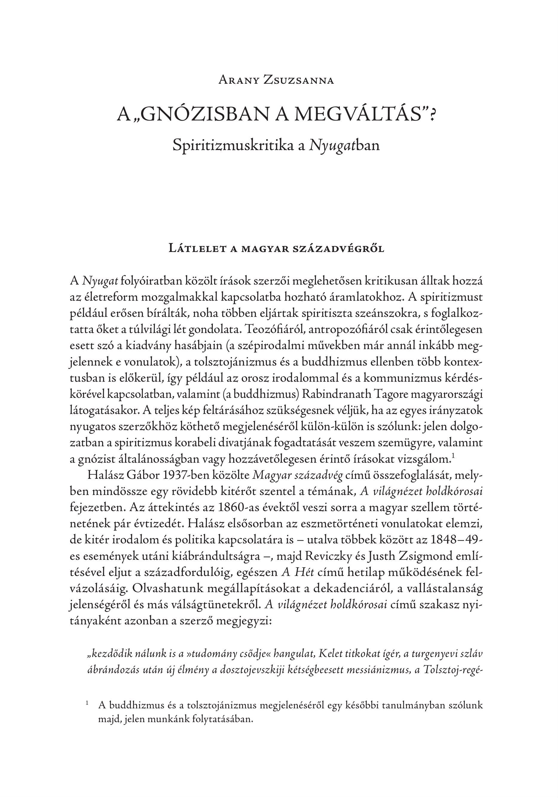 ÁRANY ZSUZSANNA A,GNOZISBAN A MEGVALTAS”? Spiritizmuskritika a Nyugatban LATLELET A MAGYAR SZAZADVEGROL A Nyugat folyóiratban közölt írások szerzői meglehetősen kritikusan álltak hozzá az életreform mozgalmakkal kapcsolatba hozhaté äramlatokhoz. A spiritizmust például erősen bírálták, noha többen eljártak spiritiszta szeánszokra, s foglalkoztatta őket a túlvilági lét gondolata. Teozófiáról, antropozófiáról csak érintőlegesen esett szó a kiadvány hasábjain (a szépirodalmi művekben már annál inkább megjelennek e vonulatok), a tolsztojänizmus és a buddhizmus ellenben több kontextusban is előkerül, így például az orosz irodalommal és a kommunizmus kérdéskörével kapcsolatban, valamint (a buddhizmus) Rabindranath Tagore magyarországi látogatásakor. A teljes kép feltárásához szükségesnek véljük, ha az egyes irányzatok nyugatos szerzőkhöz köthető megjelenéséről külön-külön is szólunk: jelen dolgozatban a spiritizmus korabeli divatjának fogadtatását veszem szemügyre, valamint a gnózist általánosságban vagy hozzávetőlegesen érintő írásokat vizsgálom." Halász Gábor 1937-ben közölte Magyar századvég című összefoglalását, melyben mindössze egy rövidebb kitérőt szentel a témának, A világnézet boldkórosai fejezetben. Az áttekintés az 1860-as évektől veszi sorra a magyar szellem történetének pár évtizedét. Halász elsősorban az eszmetörténeti vonulatokat elemzi, de kitér irodalom és politika kapcsolatára is — utalva többek között az 1848—49es események utáni kiábrándultságra —, majd Reviczky és Justh Zsigmond említésével eljut a századfordulóig, egészen A Hét című hetilap működésének felväzoläsäig. Olvashatunk megällapitäsokat a dekadenciäröl, a vallästalansäg jelensegeröl &s mäs välsägtünetekröl. A vilägnezet holdkörosai cimü szakasz nyitányaként azonban a szerző megjegyzi: s kezdődik nálunk is a studomány csődjex hangulat, Kelet titkokat ígér, a turgenyevi szláv ábrándozás után új élmény a dosztojevszkiji kétségbeesett messiánizmus, a Tolsztoj-regé! A buddhizmus és a tolsztojánizmus megjelenéséről egy későbbi tanulmányban szólunk majd, jelen munkánk folytatásában.