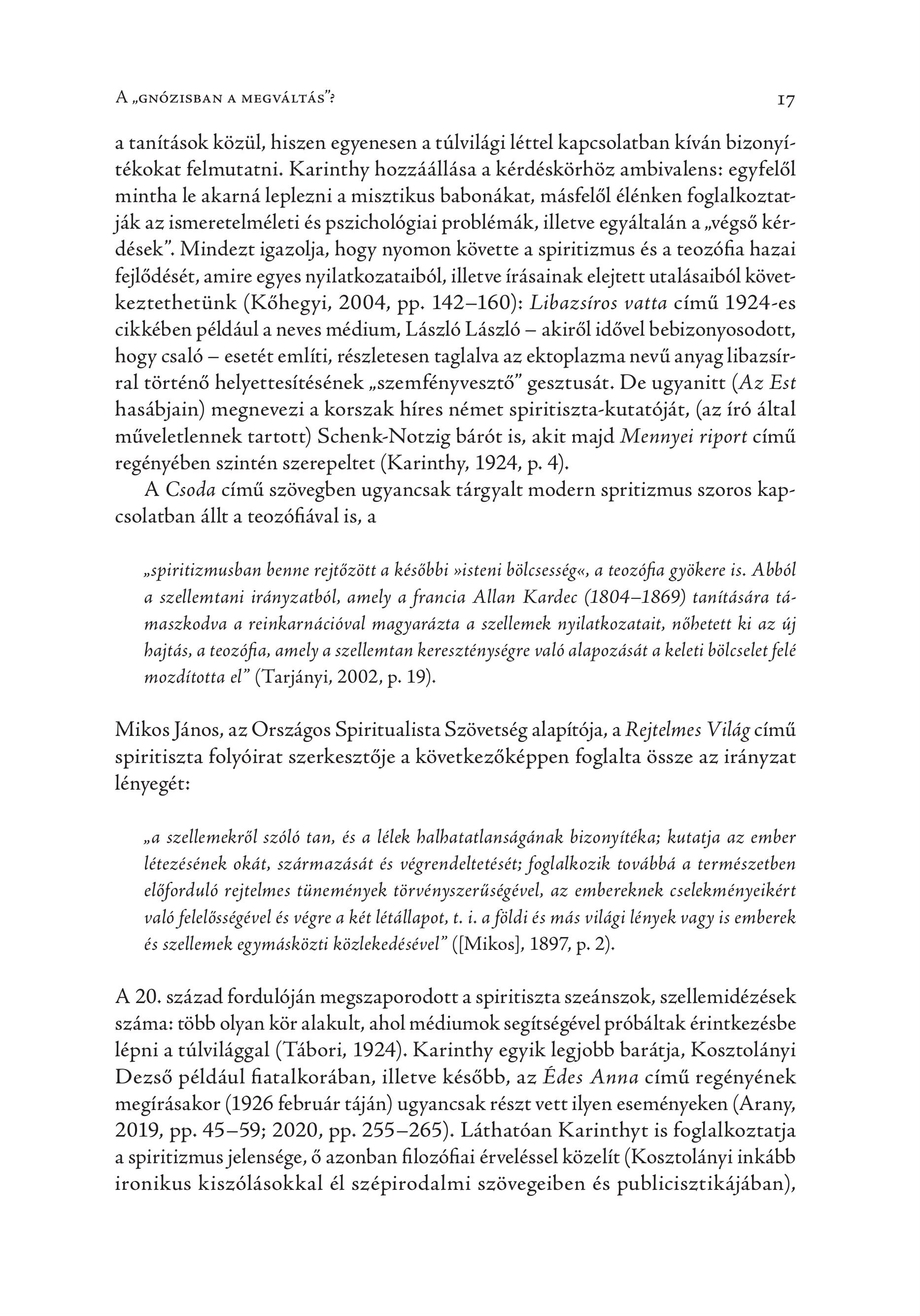 A „GNÖZISBAN A MEGVÄLTÄS”? 17 a tanítások közül, hiszen egyenesen a túlvilági léttel kapcsolatban kíván bizonyítékokat felmutatni. Karinthy hozzáállása a kérdéskörhöz ambivalens: egyfelől mintha le akarná leplezni a misztikus babonákat, másfelől élénken foglalkoztatják az ismeretelméleti és pszichológiai problémák, illetve egyáltalán a ,végső kérdések". Mindezt igazolja, hogy nyomon követte a spiritizmus és a teozófia hazai fejlődését, amire egyes nyilatkozataiból, illetve írásainak elejtett utalásaiból következtethetünk (Köhegyi, 2004, pp. 142-160): Libazsiros vatta cimü 1924-es cikkében például a neves médium, László László — akiről idővel bebizonyosodott, hogy csaló — esetét említi, részletesen taglalva az ektoplazma nevű anyag libazsirral történő helyettesítésének , szemfényvesztő" gesztusát. De ugyanitt (Az Est hasábjain) megnevezi a korszak híres német spiritiszta-kutatóját, (az író által műveletlennek tartott) Schenk-Notzig bárót is, akit majd Mennyei riport című regényében szintén szerepeltet (Karinthy, 1924, p. 4). A Csoda című szövegben ugyancsak tárgyalt modern spritizmus szoros kapcsolatban állt a teozófiával is, a sspiritizmusban benne rejtőzött a későbbi visteni bölcsessége, a teozófia gyökere is. Abból a szellemtani irányzatból, amely a francia Allan Kardec (1804-1869) tanitäsdra tdmaszkodva a reinkarnációval magyarázta a szellemek nyilatkozatait, nőbetett ki az új hajtás, a teozófia, amely a szellemtan kereszténységre való alapozását a keleti bölcselet felé mozdította el" ( Tarjányi, 2002, p. 19). Mikos János, az Országos Spiritualista Szövetség alapítója, a Rejtelmes Világ című spiritiszta folyóirat szerkesztője a következőképpen foglalta össze az irányzat lényegét: „a szellemekröl szölö tan, és a lelek halhatatlansagänak bizonyítéka; kutatja az ember létezésének okát, származását és végrendeltetését; foglalkozik továbbá a természetben előforduló rejtelmes tünemények törvényszerűségével, az embereknek cselekményeikért való felelősségével és végre a két létállapot, t. i. a földi és más világi lények vagy is emberek és szellemek egymásközti közlekedésével" (lMikos)], 1897, p. 2). A 20. század fordulóján megszaporodott a spiritiszta szeánszok, szellemidézések száma: több olyan kör alakult, ahol médiumok segítségével próbáltak érintkezésbe lépni a túlvilággal ( Tábori, 1924). Karinthy egyik legjobb barátja, Kosztolányi Dezső például fiatalkorában, illetve később, az Édes Anna című regényének megírásakor (1926 február táján) ugyancsak részt vett ilyen eseményeken (Arany, 2019, pp. 45—59; 2020, pp. 255—265). Láthatóan Karinthyt is foglalkoztatja a spiritizmus jelensége, ő azonban filozófiai érveléssel közelít (Kosztolányi inkább ironikus kiszólásokkal él szépirodalmi szövegeiben és publicisztikájában),