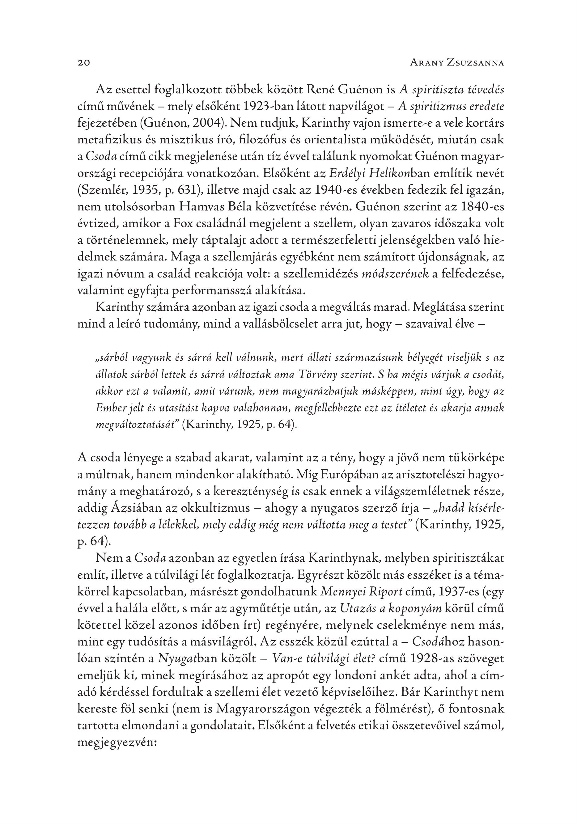 20 ÁRANY ZSUZSANNA Az esettel foglalkozott többek között René Guénon is A spiritiszta tévedés című művének — mely elsőként 1923-ban látott napvilágot — A spiritizmus eredete fejezetében (Guénon, 2004). Nem tudjuk, Karinthy vajon ismerte-e a vele kortárs metafizikus és misztikus író, filozófus és orientalista működését, miután csak a Csoda című cikk megjelenése után tíz évvel találunk nyomokat Guénon magyarországi recepciójára vonatkozóan. Elsőként az Erdélyi Helikonban említik nevét (Szemlér, 1935, p. 631), illetve majd csak az 1940-es években fedezik fel igazán, nem utolsósorban Hamvas Béla közvetítése révén. Guénon szerint az 1840-es évtized, amikor a Fox családnál megjelent a szellem, olyan zavaros időszaka volt a történelemnek, mely táptalajt adott a természetfeletti jelenségekben való hiedelmek számára. Maga a szellemjárás egyébként nem számított újdonságnak, az igazi nóvum a család reakciója volt: a szellemidézés módszerének a felfedezése, valamint egyfajta performansszá alakítása. Karinthy számára azonban az igazi csoda a megváltás marad. Meglátása szerint mind a leíró tudomány, mind a vallásbölcselet arra jut, hogy — szavaival élve — ssárból vagyunk és sárrá kell válnunk, mert állati származásunk bélyegét viseljük s az állatok sárból lettek és sárrá változtak ama Törvény szerint. S ba mégis várjuk a csodát, akkor ezt a valamit, amit várunk, nem magyarázbatjuk másképpen, mint úgy, hogy az Ember jelt és utasítást kapva valabonnan, megfellebbezte ezt az ítéletet és akarja annak megváltoztatását" (Karinthy, 1925, p. 64). A csoda lényege a szabad akarat, valamint az a tény, hogy a jövő nem tükörképe a múltnak, hanem mindenkor alakítható. Míg Európában az arisztotelészi hagyomány a meghatározó, s a kereszténység is csak ennek a világszemléletnek része, addig Ázsiában az okkultizmus — ahogy a nyugatos szerző írja — ,hadd kísérletezzen tovább a lélekkel, mely eddig még nem váltotta meg a testet" (Karinthy, 1925, p. 64). Nem a Csoda azonban az egyetlen írása Karinthynak, melyben spiritisztákat említ, illetve a túlvilági lét foglalkoztatja. Egyrészt közölt más esszéket is a témakörrel kapcsolatban, másrészt gondolhatunk Mennyei Riport című, 1937-es (egy évvel a halála előtt, s már az agyműtétje után, az Utazás a koponyám körül című kötettel közel azonos időben írt) regényére, melynek cselekménye nem más, mint egy tudósítás a másvilágról. Az esszék közül ezúttal a — Csodához hasonlóan szintén a Nyugatban közölt — Van-e túlvilági élet? című 1928-as szöveget emeljük ki, minek megírásához az apropót egy londoni ankét adta, ahol a címadó kérdéssel fordultak a szellemi élet vezető képviselőihez. Bár Karinthyt nem kereste föl senki (nem is Magyarországon végezték a fölmérést), ő fontosnak tartotta elmondani a gondolatait. Elsőként a felvetés etikai összetevőivel számol, megjegyezvén: