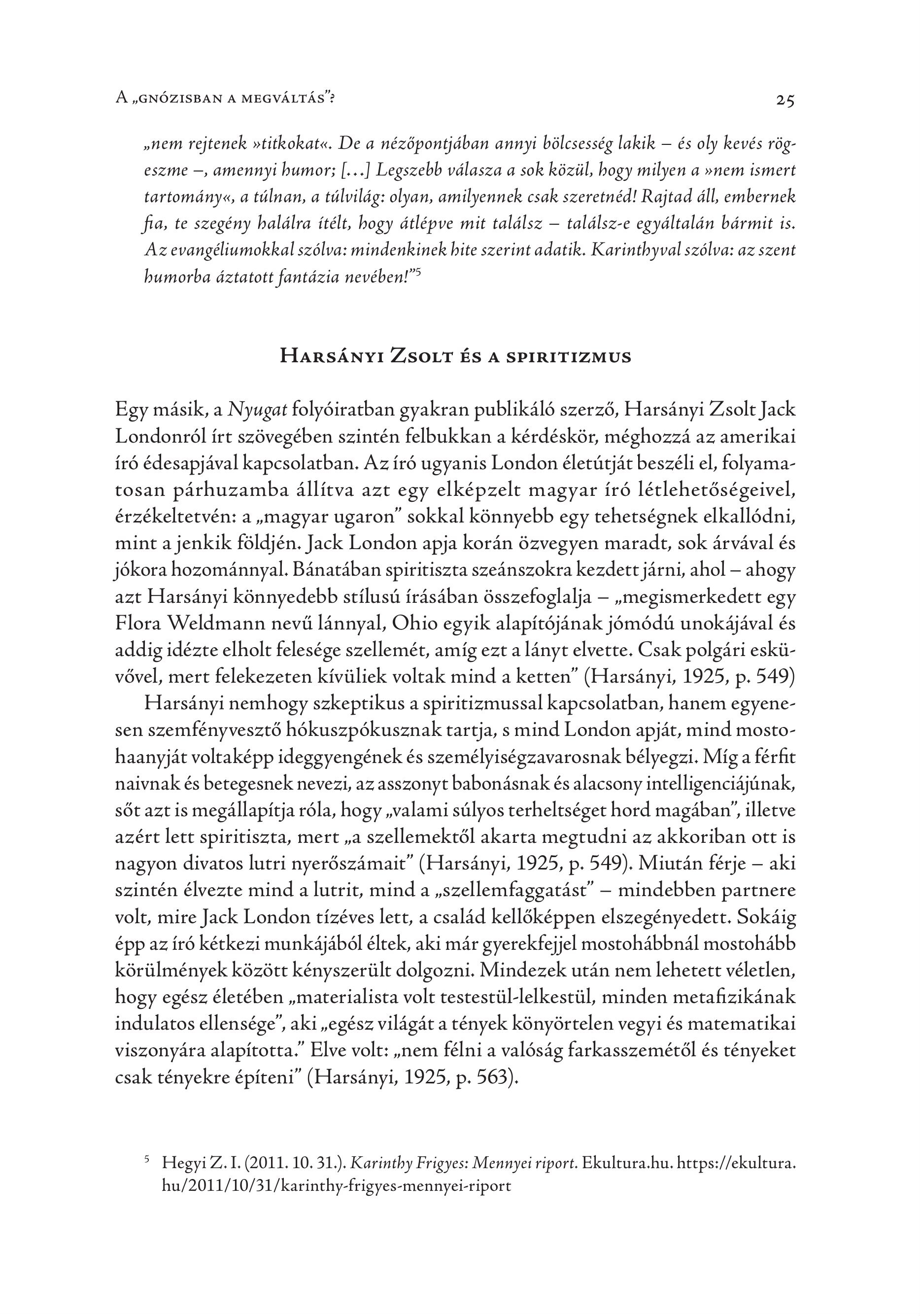 A „GNÖZISBAN A MEGVÄLTÄS”? 25 „nem rejtenek »titkokat«. De a nezöpontjäban annyi bölcsesség lakik — és oly kevés rögeszme —, amennyi bumor; [...] Legszebb válasza a sok közül, hogy milyen a snem ismert tartomany«, a túlnan, a túlvilág: olyan, amilyennek csak szeretnéd! Rajtad áll, embernek fia, te szegény balálra ítélt, hogy átlépve mit találsz — találsz-e egyáltalán bármit is. Az evangéliumokkal szólva: mindenkinek bite szerint adatik. Karinthyval szólva: az szent bumorba áztatott fantázia nevében!" HARSÁNYI ZSOLT ÉS A SPIRITIZMUS Egy másik, a Nyugat folyóiratban gyakran publikáló szerző, Harsányi Zsolt Jack Londonréól írt szövegében szintén felbukkan a kérdéskör, méghozzá az amerikai író édesapjával kapcsolatban. Az író ugyanis London életútját beszéli el, folyamatosan párhuzamba állítva azt egy elképzelt magyar író létlehetőségeivel, érzékeltetvén: a , magyar ugaron" sokkal könnyebb egy tehetségnek elkallödni, mint a jenkik földjén. Jack London apja korán özvegyen maradt, sok árvával és jókora hozománnyal. Bánatában spiritiszta szeánszokra kezdett járni, ahol — ahogy azt Harsányi könnyedebb stílusú írásában összefoglalja — , megismerkedett egy Flora Weldmann nevű lánnyal, Ohio egyik alapítójának jómódú unokájával és addig idézte elholt felesége szellemét, amíg ezt a lányt elvette. Csak polgári esküvővel, mert felekezeten kívüliek voltak mind a ketten" (Harsányi, 1925, p. 549) Harsányi nemhogy szkeptikus a spiritizmussal kapcsolatban, hanem egyenesen szemfényvesztő hókuszpókusznak tartja, s mind London apját, mind mostohaanyját voltaképp ideggyengének és személyiségzavarosnak bélyegzi. Míg a férfit naivnak és betegesnek nevezi, az asszonyt babonásnak és alacsony intelligenciájúnak, sőt azt is megállapítja róla, hogy , valami súlyos terheltséget hord magában ; illetve azért lett spiritiszta, mert ,a szellemektől akarta megtudni az akkoriban ott is nagyon divatos lutri nyerőszámait" (Harsányi, 1925, p. 549). Miután férje — aki szintén élvezte mind a lutrit, mind a ,,szellemfaggatast” — mindebben partnere volt, mire Jack London tízéves lett, a család kellőképpen elszegényedett. Sokáig épp az író kétkezi munkájából éltek, aki már gyerekfejjel mostohábbnál mostohább körülmények között kényszerült dolgozni. Mindezek után nem lehetett véletlen, hogy egész életében , materialista volt testestiil-lelkestiil, minden metafizikanak indulatos ellensége , aki ,egész világát a tények könyörtelen vegyi és matematikai viszonyára alapította." Elve volt: ,nem félni a valóság farkasszemétől és tényeket csak tényekre építeni" (Harsányi, 1925, p. 563). 5 Hegyi Z. I. (2011. 10. 31.). Karintby Frigyes: Mennyei riport. Ekultura.hu. https://ekultura. hu/2011/10/31/karinthy-frigyes-mennyei-riport