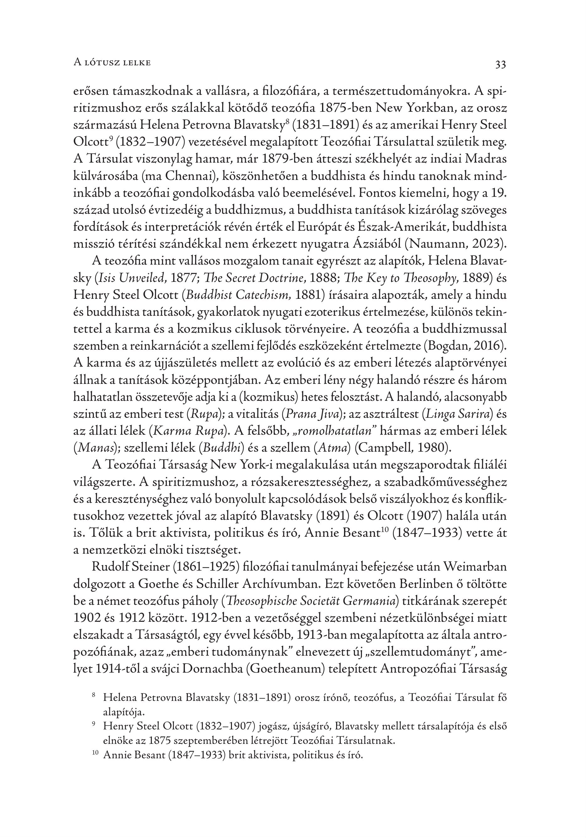 A LÓTUSZ LELKE 33 erősen támaszkodnak a vallásra, a filozófiára, a természettudományokra. A spiritizmushoz erős szálakkal kötődő teozófia 1875-ben New Yorkban, az orosz származású Helena Petrovna Blavatsky? (1831—1891) és az amerikai Henry Steel Olcott? (1832-1907) vezetésével megalapitott Teozéfiai Tarsulattal sziiletik meg. A Társulat viszonylag hamar, már 1879-ben átteszi székhelyét az indiai Madras külvárosába (ma Chennai), köszönhetően a buddhista és hindu tanoknak mindinkább a teozófiai gondolkodásba való beemelésével. Fontos kiemelni, hogy a 19. század utolsó évtizedéig a buddhizmus, a buddhista tanítások kizárólag szöveges fordítások és interpretációk révén érték el Európát és Észak-Amerikát, buddhista misszió térítési szándékkal nem érkezett nyugatra Ázsiából (Naumann, 2023). A teozófia mint vallásos mozgalom tanait egyrészt az alapítók, Helena Blavatsky (Isis Unveiled, 1877; The Secret Doctrine, 1888; The Key to Theosophy, 1889) és Henry Steel Olcott (Buddhist Catechism, 1881) írásaira alapozták, amely a hindu és buddhista tanítások, gyakorlatok nyugati ezoterikus értelmezése, különös tekintettel a karma és a kozmikus ciklusok törvényeire. A teozófia a buddhizmussal szemben a reinkarnációt a szellemi fejlődés eszközeként értelmezte (Bogdan, 2016). A karma és az újjászületés mellett az evolúció és az emberi létezés alaptörvényei állnak a tanítások középpontjában. Az emberi lény négy halandó részre és három halhatatlan összetevője adja ki a (kozmikus) hetes felosztást. A halandó, alacsonyabb szintü az emberi test (Rupa); a vitalitäs (Prana Jiva); az asztráltest (Linga Sarira) és az allati lélek (Karma Rupa). A felsöbb, „romolhatatlan” härmas az emberi lélek (Manas); szellemi lélek (Buddhi) és a szellem (Atma) (Campbell, 1980). A Teozófiai Társaság New York-i megalakulása után megszaporodtak filialéi világszerte. A spiritizmushoz, a rózsakeresztességhez, a szabadkőművességhez és a kereszténységhez való bonyolult kapcsolódások belső viszályokhoz és konfliktusokhoz vezettek jóval az alapító Blavatsky (1891) és Olcott (1907) halála után is. Tőlük a brit aktivista, politikus és író, Annie Besant" (1847—1933) vette át a nemzetközi elnöki tisztséget. Rudolf Steiner (1861-1925) filozófiai tanulmányai befejezése után Weimarban dolgozott a Goethe és Schiller Archívumban. Ezt követően Berlinben ő töltötte be a német teozófus päholy (Theosophische Societät Germania) titkárának szerepét 1902 és 1912 között. 1912-ben a vezetőséggel szembeni nézetkülönbségei miatt elszakadt a Társaságtól, egy évvel később, 1913-ban megalapította az általa antropozöfiänak, azaz „emberi tudomänynak” elnevezett üj „szellemtudomänyt”, amelyet 1914-töl a sväjci Dornachba (Goetheanum) telepitett Antropozófiai Társaság ® Helena Petrovna Blavatsky (1831-1891) orosz irönd, teozöfus, a Teozöfiai Tärsulat f6 alapitöja. Henry Steel Olcott (1832—1907) jogász, újságíró, Blavatsky mellett társalapítója és első elnöke az 1875 szeptemberében létrejött Teozófiai Társulatnak. 19 Annie Besant (1847-1933) brit aktivista, politikus és író.