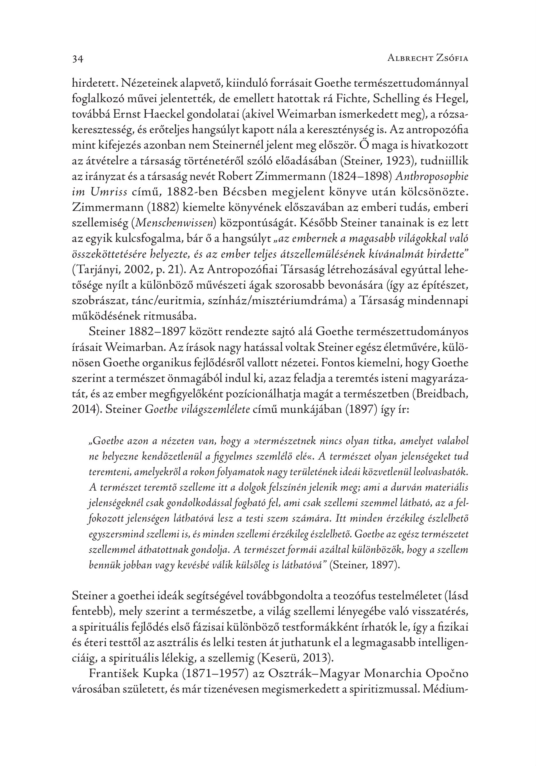 34 ÁLBRECHT ZSÓFIA hirdetett. Nézeteinek alapvető, kiinduló forrásait Goethe természettudománnyal foglalkozó művei jelentették, de emellett hatottak rá Fichte, Schelling és Hegel, továbbá Ernst Haeckel gondolatai (akivel Weimarban ismerkedett meg), a rózsakeresztesség, és erőteljes hangsúlyt kapott nála a kereszténység is. Az antropozófia mint kifejezés azonban nem Steinernél jelent meg először. Ő maga is hivatkozott az átvételre a társaság történetéről szóló előadásában (Steiner, 1923), tudniillik az iränyzat &s a tärsasäg nevet Robert Zimmermann (1824-1898) Anthroposophie im Umriss című, 1882-ben Bécsben megjelent könyve után kölcsönözte. Zimmermann (1882) kiemelte könyvének előszavában az emberi tudás, emberi szellemiség (Menscbenwissen) központúságát. Később Steiner tanainak is ez lett az egyik kulcsfogalma, bár ő a hangsúlyt , az embernek a magasabb világokkal való összeköttetésére belyezte, és az ember teljes átszellemülésének kívánalmát birdette" ( Tarjányi, 2002, p. 21). Az Antropozófiai Társaság létrehozásával egyúttal lehetősége nyílt a különböző művészeti ágak szorosabb bevonására (így az építészet, szobräszat, tänc/euritmia, szinhäz/miszteriumdräma) a Tärsasäg mindennapi müködesenek ritmusäba. Steiner 1882-1897 között rendezte sajtö alä Goethe termeszettudomänyos írásait Weimarban. Az írások nagy hatással voltak Steiner egész életművére, különösen Goethe organikus fejlődésről vallott nézetei. Fontos kiemelni, hogy Goethe szerint a természet önmagából indul ki, azaz feladja a teremtés isteni magyarázatát, és az ember megfigyelőként pozícionálhatja magát a természetben (Breidbach, 2014). Steiner Goetbe világszemlélete című munkájában (1897) így ír: »Goethe azon a nézeten van, hogy a »természetnek nincs olyan titka, amelyet valahol ne belyezne kendőzetlenül a figyelmes szemlélő eléx. A természet olyan jelenségeket tud teremteni, amelyekről a rokon folyamatok nagy területének ideái közvetlenül leolvashatók. A természet teremtő szelleme itt a dolgok felszínén jelenik meg; ami a durván materiális jelenségeknél csak gondolkodással fogbató fel, ami csak szellemi szemmel látható, az a felfokozott jelenségen láthatóvá lesz a testi szem számára. Itt minden érzékileg észlelhető egyszersmind szellemi is, és minden szellemi érzékileg észlelhető. Goethe az egész természetet szellemmel áthatottnak gondolja. A természet formái azáltal különbözők, hogy a szellem bennük jobban vagy kevésbé válik külsőleg is láthatóvá" (Steiner, 1897). Steiner a goethei ideák segítségével továbbgondolta a teozófus testelméletet (lásd fentebb), mely szerint a természetbe, a világ szellemi lényegébe való visszatérés, a spirituális fejlődés első fázisai különböző testformakként írhatók le, így a fizikai és éteri testtől az asztrális és lelki testen át juthatunk el a legmagasabb intelligenciáig, a spirituális lélekig, a szellemig (Keserü, 2013). Frantisek Kupka (1871-1957) az Osztrák-Magyar Monarchia Opocno városában született, és már tizenévesen megismerkedett a spiritizmussal. Médium