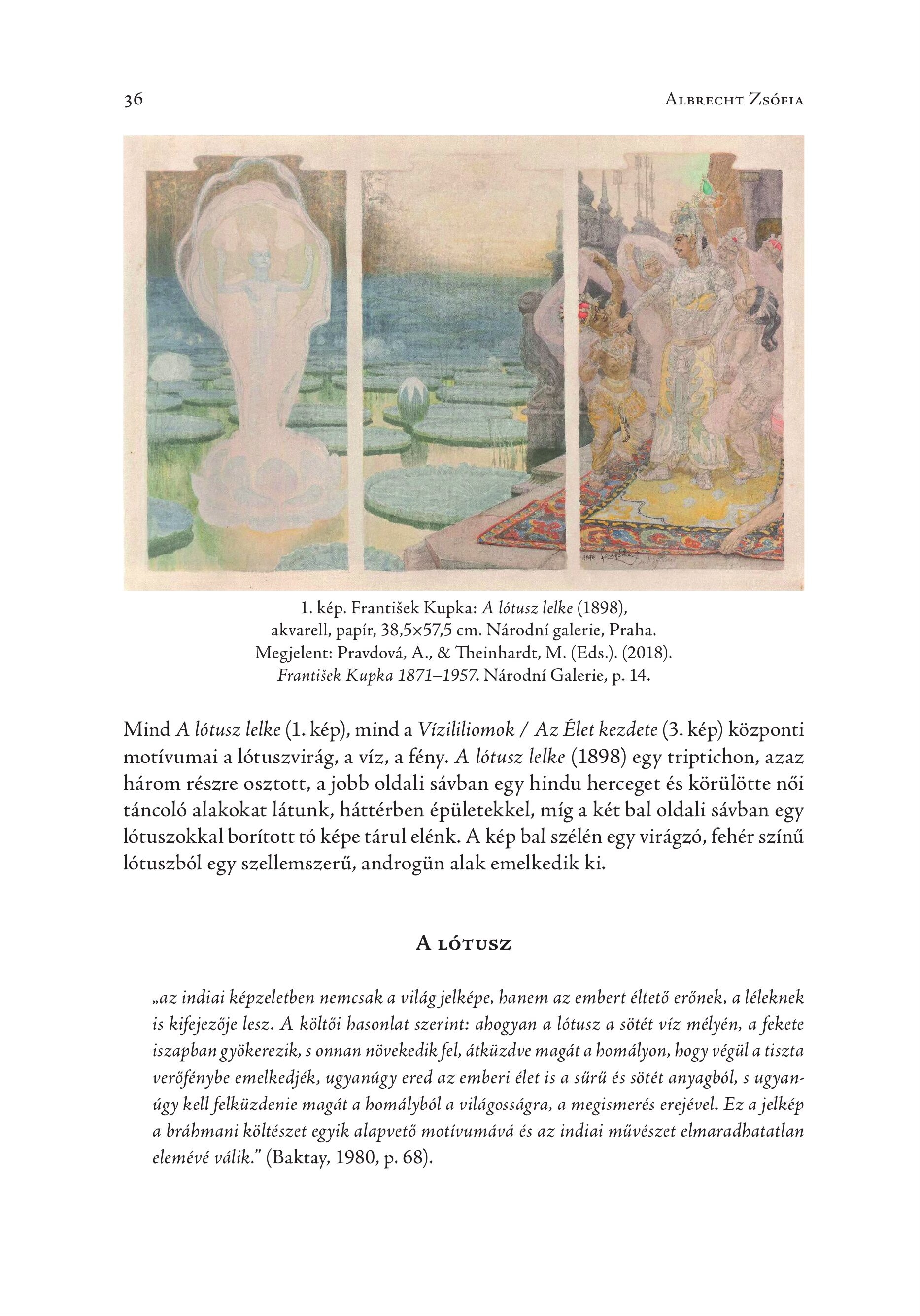 36 ALBRECHT ZSOFIA Mind A lötusz lelke (1. kép), mind a Vizililiomok / Az Elet kezdete (3. kép) központi motívumai a lótuszvirág, a viz, a fény. A lótusz lelke (1898) egy triptichon, azaz három részre osztott, a jobb oldali sávban egy hindu herceget és körülötte női táncoló alakokat látunk, háttérben épületekkel, míg a két bal oldali sávban egy lótuszokkal borított tó képe tárul elénk. A kép bal szélén egy virágzó, fehér színű lótuszból egy szellemszerű, androgün alak emelkedik ki. A LÓTUSZ „az indiai képzeletben nemcsak a világ jelképe, hanem az embert éltető erőnek, a léleknek is kifejezője lesz. A költői hasonlat szerint: ahogyan a lótusz a sötét víz mélyén, a fekete iszapban gyökerezik, s onnan növekedik fel, átküzdve magát a bomályon, hogy végül a tiszta verőfénybe emelkedjék, ugyanúgy ered az emberi élet is a sűrű és sötét anyagból, s ugyanúgy kell felküzdenie magát a bomályból a világosságra, a megismerés erejével. Ez a jelkép a brábmani költészet egyik alapvető motívumává és az indiai művészet elmaradbatatlan elemévé válik." (Baktay, 1980, p. 68).