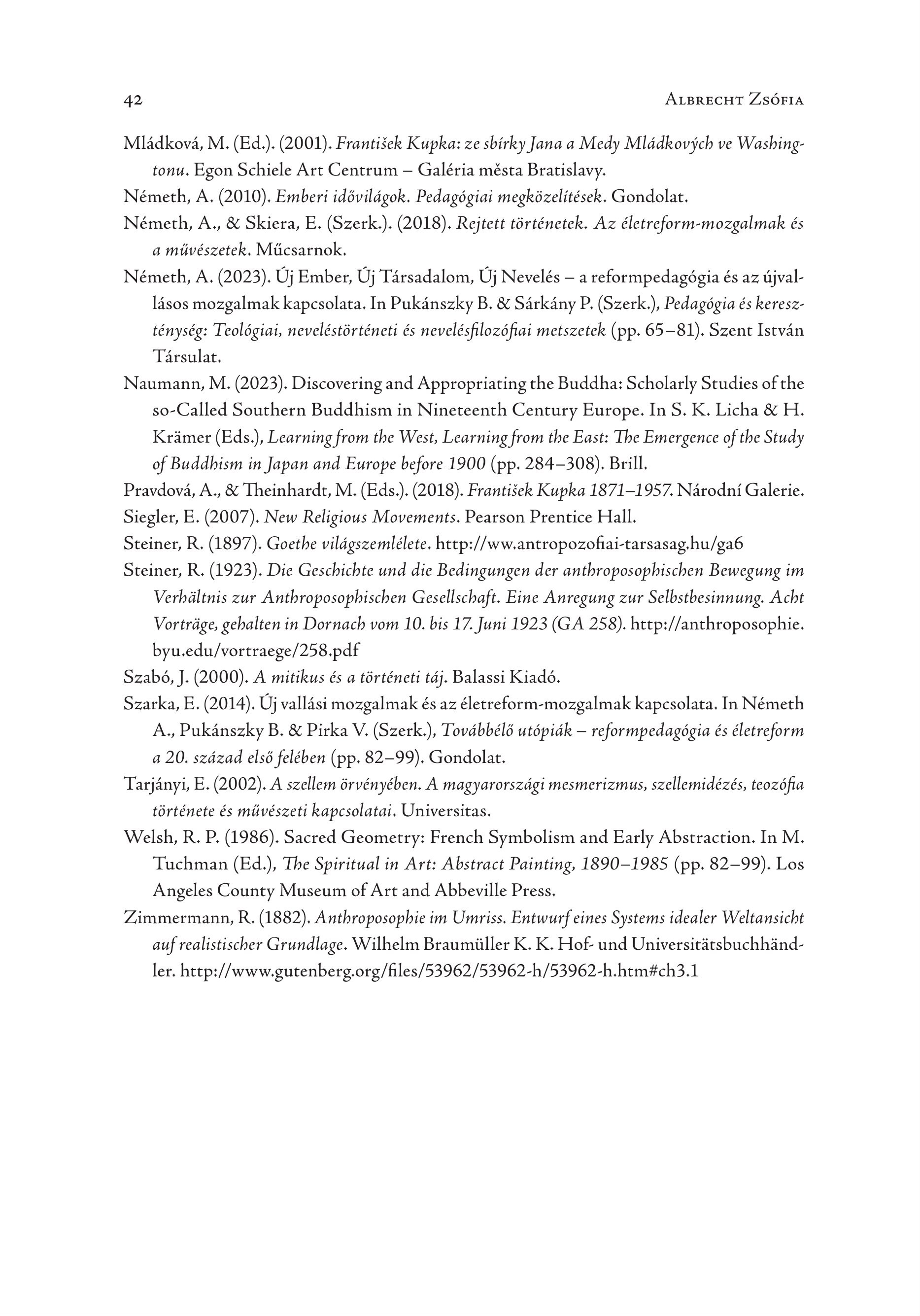 42 ALBRECHT ZSOFIA Mladkova, M. (Ed.). (2001). Frantisek Kupka: ze sbirky Jana a Medy Mlädkovych ve Washingtonu. Egon Schiele Art Centrum — Galéria mésta Bratislavy. Németh, A. (2010). Emberi idővilágok. Pedagógiai megközelítések. Gondolat. Nemeth, A., & Skiera, E. (Szerk.). (2018). Rejtett történetek. Az életreform-mozgalmak és a művészetek. Műcsarnok. Németh, A. (2023). Új Ember, Új Társadalom, Új Nevelés — a reformpedagégia és az üjvallásos mozgalmak kapcsolata. In Pukánszky B. g Sárkány P. (Szerk.), Pedagógia és kereszténység: Teológiai, neveléstörténeti és nevelésfilozófiai metszetek (pp. 65—81). Szent István Társulat. Naumann, M. (2023). Discovering and Appropriating the Buddha: Scholarly Studies of the so-Called Southern Buddhism in Nineteenth Century Europe. In S. K. Licha & H. Kramer (Eds.), Learning from the West, Learning from the East: The Emergence of the Study of Buddhism in Japan and Europe before 1900 (pp. 284-308). Brill. Pravdova, A., & Theinhardt, M. (Eds.). (2018). Frantisek Kupka 1871-1957. Narodni Galerie. Siegler, E. (2007). New Religious Movements. Pearson Prentice Hall. Steiner, R. (1897). Goethe vilägszemlelete. http://ww.antropozofiai-tarsasag.hu/ga6 Steiner, R. (1923). Die Geschichte und die Bedingungen der anthroposophischen Bewegung im Verhältnis zur Anthroposophischen Gesellschaft. Eine Anregung zur Selbstbesinnung. Acht Vorträge, gehalten in Dornach vom 10. bis 17. Juni 1923 (GA 258). http://anthroposophie. byu.edu/vortraege/258.pdf Szabó, J. (2000). A mitikus és a történeti táj. Balassi Kiadó. Szarka, E. (2014). Új vallási mozgalmak és az életreform-mozgalmak kapcsolata. In Németh A., Pukänszky B. & Pirka V. (Szerk.), Tovabbelö utöpiäk - reformpedagögia és életreform a 20. szdzad elsé feleben (pp. 82-99). Gondolat. Tarjänyi, E. (2002). A szellem örvényében. A magyarországi mesmerizmus, szellemidézés, teozófia története és művészeti kapcsolatai. Universitas, Welsh, R. P. (1986). Sacred Geometry: French Symbolism and Early Abstraction. In M. Tuchman (Ed.), The Spiritual in Art: Abstract Painting, 1890-1985 (pp. 82-99). Los Angeles County Museum of Art and Abbeville Press. Zimmermann, R. (1882). Anthroposophie im Umriss. Entwurf eines Systems idealer Weltansicht auf realistischer Grundlage. Wilhelm Braumüller K. K. Hof- und Universitätsbuchhändler. http://www.gutenberg.org/files/53962/53962-h/53962-h.htm#ch3.1