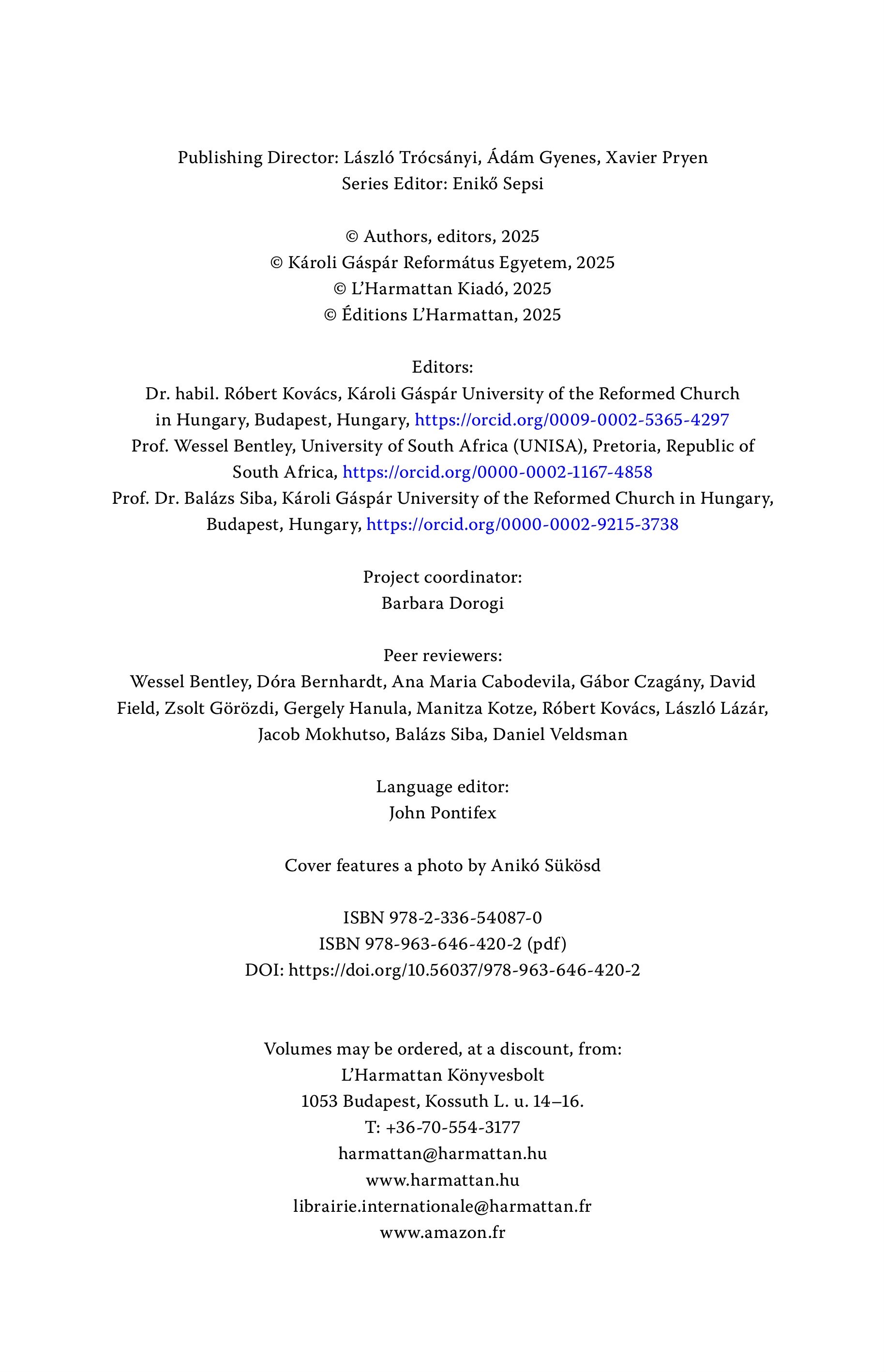 Publishing Director: László Trócsányi, Ádám Gyenes, Xavier Pryen Series Editor: Enikő Sepsi 9 Authors, editors, 2025 0 Károli Gáspár Református Egyetem, 2025 9 LHarmattan Kiadó, 2025 © Éditions L'Harmattan, 2025 Editors: Dr. habil. Róbert Kovács, Károli Gáspár University of the Reformed Church in Hungary, Budapest, Hungary, https://orcid.org/0009-0002-5365-4297 Prof. Wessel Bentley, University of South Africa (UNISA), Pretoria, Republic of South Africa, https://orcid.org/0000-0002-1167-4858 Prof. Dr. Balazs Siba, Karoli Gaspar University of the Reformed Church in Hungary, Budapest, Hungary, https://orcid.org/0000-0002-9215-3738 Project coordinator: Barbara Dorogi Peer reviewers: Wessel Bentley, Dora Bernhardt, Ana Maria Cabodevila, Gabor Czagany, David Field, Zsolt G6r6ézdi, Gergely Hanula, Manitza Kotze, Robert Kovacs, Laszlé Lazar, Jacob Mokhutso, Balazs Siba, Daniel Veldsman Language editor: John Pontifex Cover features a photo by Anikó Sükösd ISBN 978-2-336-54087-0 ISBN 978-963-646-420-2 (pdf) DOI: https://doi.org/10.56037/978-963-646-420-2 Volumes may be ordered, at a discount, from: LHarmattan Könyvesbolt 1053 Budapest, Kossuth L. u. 14-16. T: +36-70-554-3177 harmattan@harmattan.hu www.harmattan.hu librairie.internationale@harmattan.fr www.amazon.fr