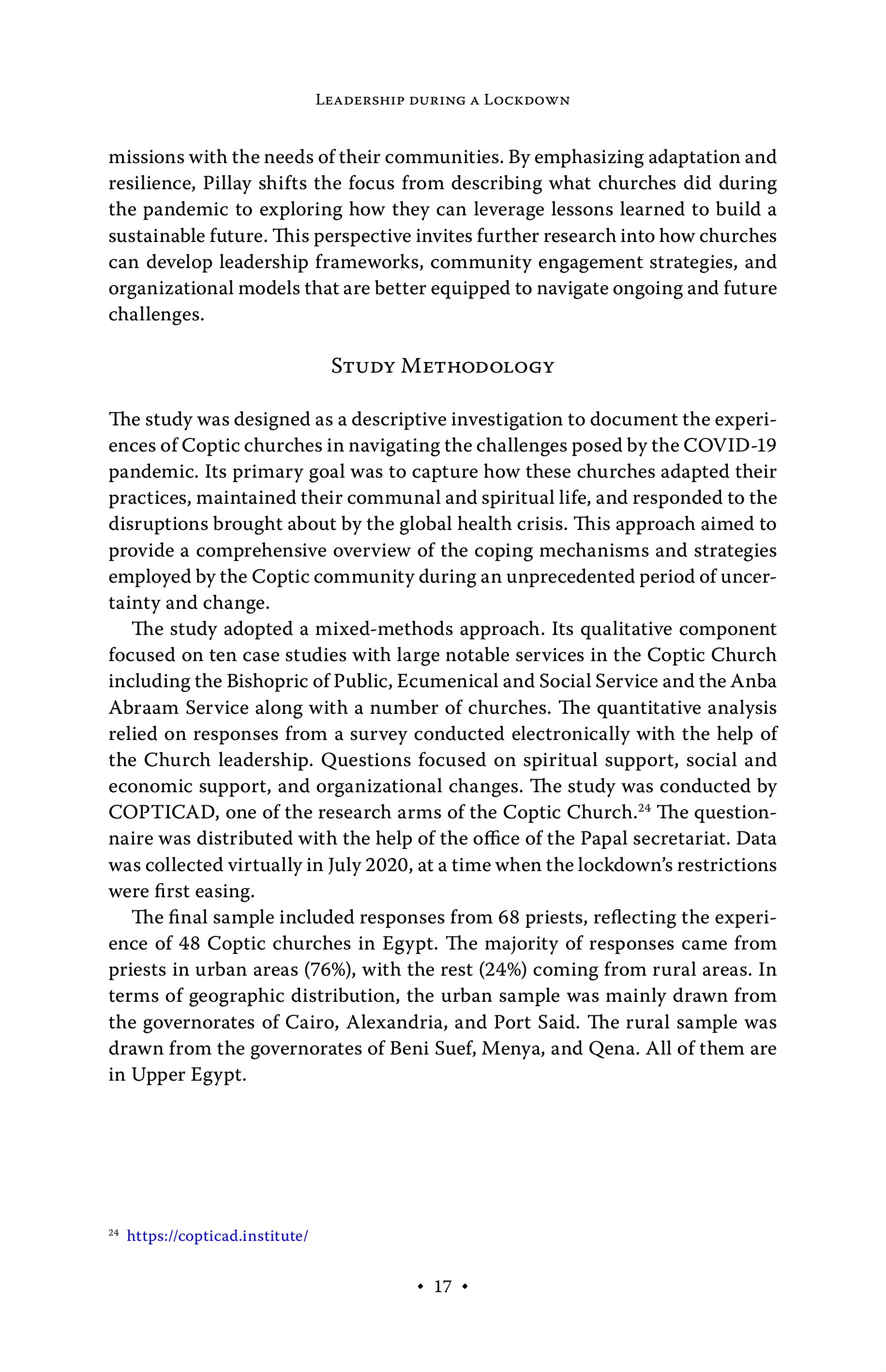 LEADERSHIP DURING A LOCKDOWN missions with the needs of their communities. By emphasizing adaptation and resilience, Pillay shifts the focus from describing what churches did during the pandemic to exploring how they can leverage lessons learned to build a sustainable future. This perspective invites further research into how churches can develop leadership frameworks, community engagement strategies, and organizational models that are better equipped to navigate ongoing and future challenges. STUDY METHODOLOGY The study was designed as a descriptive investigation to document the experiences of Coptic churches in navigating the challenges posed by the COVID-19 pandemic. Its primary goal was to capture how these churches adapted their practices, maintained their communal and spiritual life, and responded to the disruptions brought about by the global health crisis. This approach aimed to provide a comprehensive overview of the coping mechanisms and strategies employed by the Coptic community during an unprecedented period of uncertainty and change. The study adopted a mixed-methods approach. Its qualitative component focused on ten case studies with large notable services in the Coptic Church including the Bishopric of Public, Ecumenical and Social Service and the Anba Abraam Service along with a number of churches. The quantitative analysis relied on responses from a survey conducted electronically with the help of the Church leadership. Questions focused on spiritual support, social and economic support, and organizational changes. The study was conducted by COPTICAD, one of the research arms of the Coptic Church.”* The questionnaire was distributed with the help of the office of the Papal secretariat. Data was collected virtually in July 2020, at a time when the lockdown’s restrictions were first easing. The final sample included responses from 68 priests, reflecting the experience of 48 Coptic churches in Egypt. The majority of responses came from priests in urban areas (76%), with the rest (24%) coming from rural areas. In terms of geographic distribution, the urban sample was mainly drawn from the governorates of Cairo, Alexandria, and Port Said. The rural sample was drawn from the governorates of Beni Suef, Menya, and Qena. All of them are in Upper Egypt. 24 https://copticad.institute/ + 17 »
