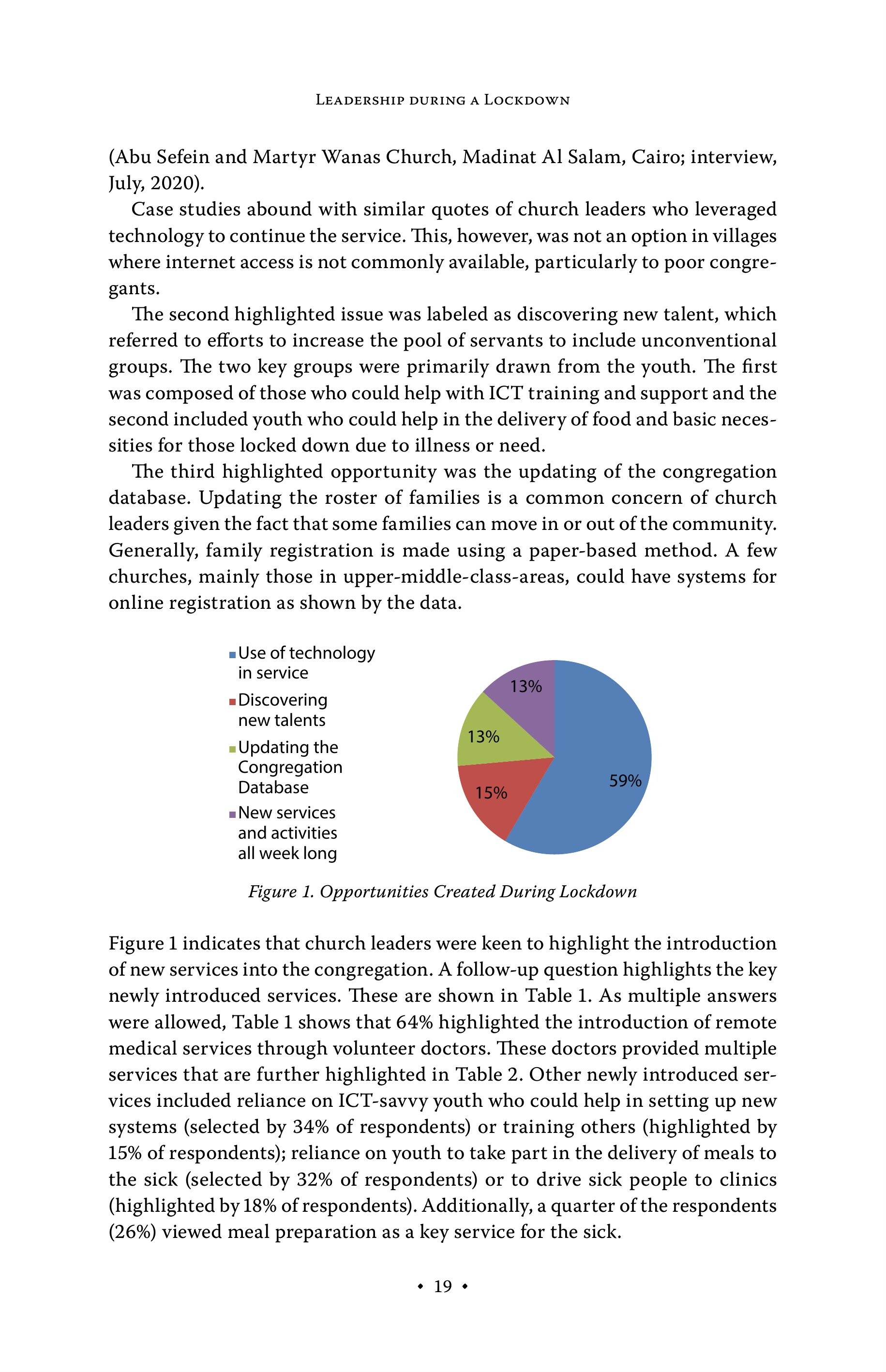 LEADERSHIP DURING A LOCKDOWN (Abu Sefein and Martyr Wanas Church, Madinat Al Salam, Cairo; interview, July, 2020). Case studies abound with similar guotes of church leaders who leveraged technology to continue the service. Ihis, however, was not an option in villages where internet access is not commonly available, particularly to poor congregants. The second highlighted issue was labeled as discovering new talent, which referred to efforts to increase the pool of servants to include unconventional groups. The two key groups were primarily drawn from the youth. The first was composed of those who could help with ICT training and support and the second included youth who could help in the delivery of food and basic necessities for those locked down due to illness or need. The third highlighted opportunity was the updating of the congregation database. Updating the roster of families is a common concern of church leaders given the fact that some families can move in or out of the community. Generally, family registration is made using a paper-based method. A few churches, mainly those in upper-middle-class-areas, could have systems for online registration as shown by the data. a Use of technology in service = Discovering new talents aUpdating the Congregation Database a New services and activities all week long Figure 1. Opportunities Created During Lockdown Figure 1 indicates that church leaders were keen to highlight the introduction of new services into the congregation. A follow-up question highlights the key newly introduced services. These are shown in Table 1. As multiple answers were allowed, Table 1 shows that 64% highlighted the introduction of remote medical services through volunteer doctors. These doctors provided multiple services that are further highlighted in Table 2. Other newly introduced services included reliance on ICT-savvy youth who could help in setting up new systems (selected by 34% of respondents) or training others (highlighted by 15% of respondents); reliance on youth to take part in the delivery of meals to the sick (selected by 32% of respondents) or to drive sick people to clinics (highlighted by 18% of respondents). Additionally, a quarter of the respondents (26%) viewed meal preparation as a key service for the sick. s 19 c