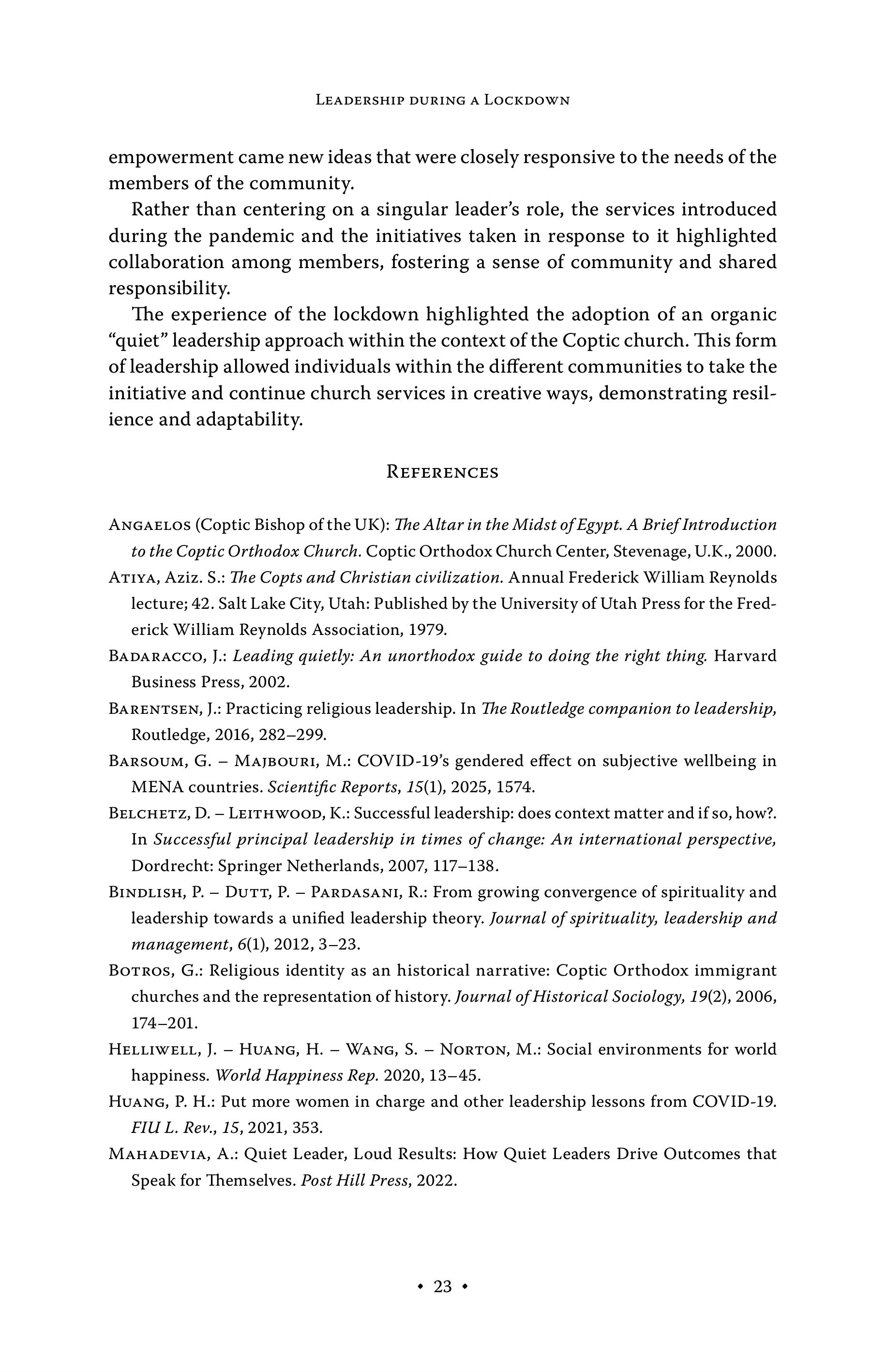 LEADERSHIP DURING A LOCKDOWN empowerment came new ideas that were closely responsive to the needs of the members of the community. Rather than centering on a singular leader’s role, the services introduced during the pandemic and the initiatives taken in response to it highlighted collaboration among members, fostering a sense of community and shared responsibility. The experience of the lockdown highlighted the adoption of an organic “quiet” leadership approach within the context of the Coptic church. This form of leadership allowed individuals within the different communities to take the initiative and continue church services in creative ways, demonstrating resilience and adaptability. REFERENCES ANGAELOS (Coptic Bishop of the UK): The Altar in the Midst of Egypt. A Brief Introduction to the Coptic Orthodox Church. Coptic Orthodox Church Center, Stevenage, U.K., 2000. ATIya, Aziz. S.: The Copts and Christian civilization. Annual Frederick William Reynolds lecture; 42. Salt Lake City, Utah: Published by the University of Utah Press for the Frederick William Reynolds Association, 1979. BADARACCO, J.: Leading quietly: An unorthodox guide to doing the right thing. Harvard Business Press, 2002. BARENTSEN, J.: Practicing religious leadership. In The Routledge companion to leadership, Routledge, 2016, 282-299. BarsouM, G. — Majysourt, M.: COVID-19’s gendered effect on subjective wellbeing in MENA countries. Scientific Reports, 15(1), 2025, 1574. BELCHETZ, D. — LEITHWOOD, K.: Successful leadership: does context matter and if so, how?. In Successful principal leadership in times of change: An international perspective, Dordrecht: Springer Netherlands, 2007, 117-138. BINDLISH, P. — DuTT, P. — PARDASANI, R.: From growing convergence of spirituality and leadership towards a unified leadership theory. Journal of spirituality, leadership and management, 6(1), 2012, 3-23. BoTROS, G.: Religious identity as an historical narrative: Coptic Orthodox immigrant churches and the representation of history. Journal of Historical Sociology, 19(2), 2006, 174-201. HELLIWELL, J. - HUANG, H. — Wana, S. — NorTON, M.: Social environments for world happiness. World Happiness Rep. 2020, 13-45. Huang, P. H.: Put more women in charge and other leadership lessons from COVID-19. FIU L. Rev., 15, 2021, 353. MAHADEVIA, A.: Quiet Leader, Loud Results: How Quiet Leaders Drive Outcomes that Speak for Themselves. Post Hill Press, 2022. .23 +