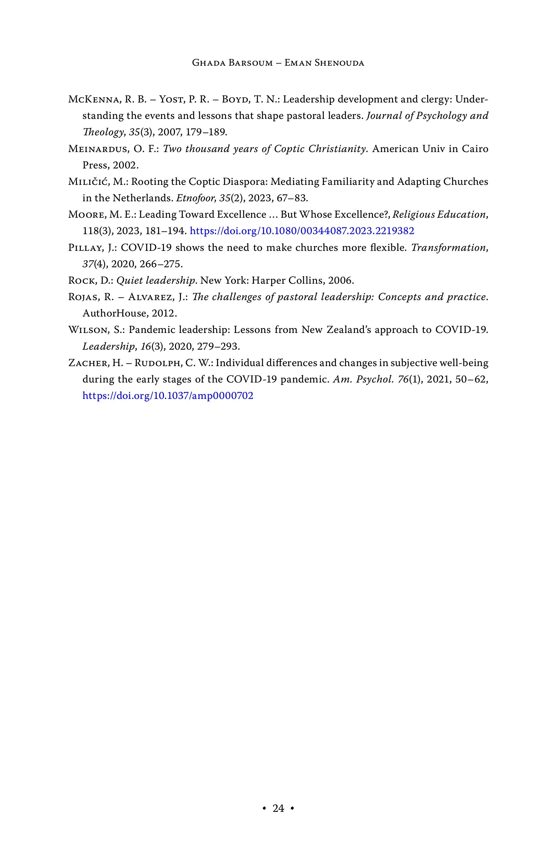 GHADA BARSOUM — EMAN SHENOUDA McKEnna, R. B. — Yost, P. R. — Boyp, T. N.: Leadership development and clergy: Understanding the events and lessons that shape pastoral leaders. Journal of Psychology and Theology, 35(3), 2007, 179-189. MEINARDUS, O. F.: Two thousand years of Coptic Christianity. American Univ in Cairo Press, 2002. MiıLicıc, M.: Rooting the Coptic Diaspora: Mediating Familiarity and Adapting Churches in the Netherlands. Etnofoor, 35(2), 2023, 67-83. Moore, M. E.: Leading Toward Excellence ... But Whose Excellence?, Religious Education, 118(3), 2023, 181-194. https://doi.org/10.1080/00344087.2023.2219382 PILLAY, J.: COVID-19 shows the need to make churches more flexible. Transformation, 37(4), 2020, 266-275. Rock, D.: Quiet leadership. New York: Harper Collins, 2006. Rojas, R. — ALVAREZ, J.: The challenges of pastoral leadership: Concepts and practice. AuthorHouse, 2012. WILSON, S.: Pandemic leadership: Lessons from New Zealand’s approach to COVID-19. Leadership, 16(3), 2020, 279-293. ZACHER, H. — RUDOLPH, C. W.: Individual differences and changes in subjective well-being during the early stages of the COVID-19 pandemic. Am. Psychol. 76(1), 2021, 50-62, https://doi.org/10.1037/amp0000702 s 24 c