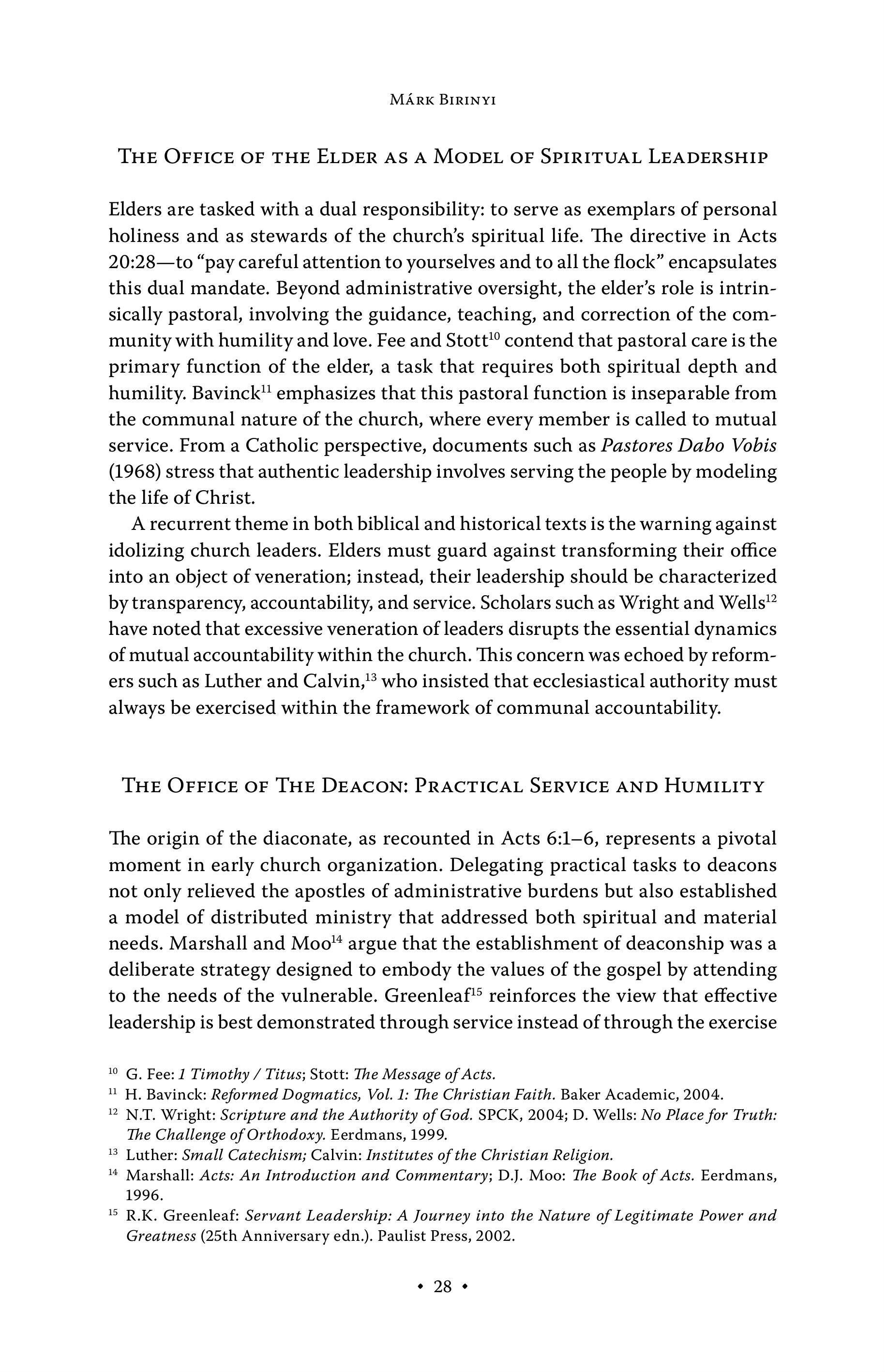 MÁRK BIRINYI THE OFFICE OF THE ELDER AS A MODEL OF SPIRITUAL LEADERSHIP Elders are tasked with a dual responsibility: to serve as exemplars of personal holiness and as stewards of the church’s spiritual life. The directive in Acts 20:28—to “pay careful attention to yourselves and to all the flock” encapsulates this dual mandate. Beyond administrative oversight, the elder’s role is intrinsically pastoral, involving the guidance, teaching, and correction of the community with humility and love. Fee and Stott’® contend that pastoral care is the primary function of the elder, a task that requires both spiritual depth and humility. Bavinck" emphasizes that this pastoral function is inseparable from the communal nature of the church, where every member is called to mutual service. From a Catholic perspective, documents such as Pastores Dabo Vobis (1968) stress that authentic leadership involves serving the people by modeling the life of Christ. A recurrent theme in both biblical and historical texts is the warning against idolizing church leaders. Elders must guard against transforming their office into an object of veneration; instead, their leadership should be characterized by transparency, accountability, and service. Scholars such as Wright and Wells” have noted that excessive veneration of leaders disrupts the essential dynamics of mutual accountability within the church. This concern was echoed by reformers such as Luther and Calvin,” who insisted that ecclesiastical authority must always be exercised within the framework of communal accountability. THE OFFICE OF THE DEACON: PRACTICAL SERVICE AND HUMILITY The origin of the diaconate, as recounted in Acts 6:1—6, represents a pivotal moment in early church organization. Delegating practical tasks to deacons not only relieved the apostles of administrative burdens but also established a model of distributed ministry that addressed both spiritual and material needs. Marshall and Moo” argue that the establishment of deaconship was a deliberate strategy designed to embody the values of the gospel by attending to the needs of the vulnerable. Greenleaf reinforces the view that effective leadership is best demonstrated through service instead of through the exercise 10 G. Fee: 1 Timothy / Titus; Stott: The Message of Acts. 1H. Bavinck: Reformed Dogmatics, Vol. 1: The Christian Faith. Baker Academic, 2004. 2 NT. Wright: Scripture and the Authority of God. SPCK, 2004; D. Wells: No Place for Truth: The Challenge of Orthodoxy. Eerdmans, 1999. 8 Luther: Small Catechism; Calvin: Institutes of the Christian Religion. 4 Marshall: Acts: An Introduction and Commentary; D.J. Moo: The Book of Acts. Eerdmans, 1996. R.K. Greenleaf: Servant Leadership: A Journey into the Nature of Legitimate Power and Greatness (25th Anniversary edn.). Paulist Press, 2002. = 15 + 28 +