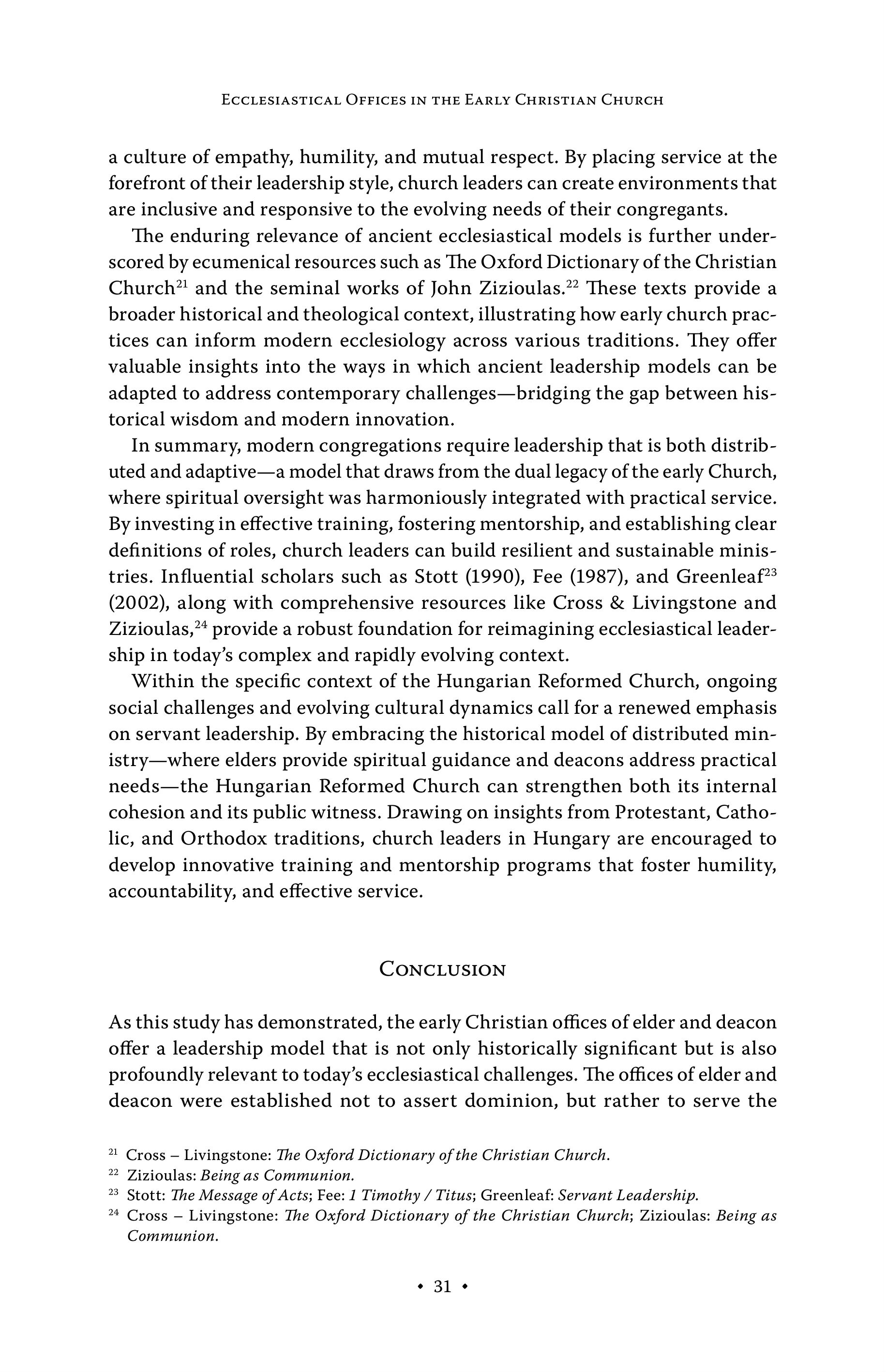 ECCLESIASTICAL OFFICES IN THE EARLY CHRISTIAN CHURCH a culture of empathy, humility, and mutual respect. By placing service at the forefront of their leadership style, church leaders can create environments that are inclusive and responsive to the evolving needs of their congregants. The enduring relevance of ancient ecclesiastical models is further underscored by ecumenical resources such as The Oxford Dictionary of the Christian Church” and the seminal works of John Zizioulas.?? These texts provide a broader historical and theological context, illustrating how early church practices can inform modern ecclesiology across various traditions. They offer valuable insights into the ways in which ancient leadership models can be adapted to address contemporary challenges—bridging the gap between historical wisdom and modern innovation. In summary, modern congregations require leadership that is both distributed and adaptive—a model that draws from the dual legacy of the early Church, where spiritual oversight was harmoniously integrated with practical service. By investing in effective training, fostering mentorship, and establishing clear definitions of roles, church leaders can build resilient and sustainable ministries. Influential scholars such as Stott (1990), Fee (1987), and Greenleaf”? (2002), along with comprehensive resources like Cross & Livingstone and Zizioulas,”* provide a robust foundation for reimagining ecclesiastical leadership in today’s complex and rapidly evolving context. Within the specific context of the Hungarian Reformed Church, ongoing social challenges and evolving cultural dynamics call for a renewed emphasis on servant leadership. By embracing the historical model of distributed ministry—where elders provide spiritual guidance and deacons address practical needs—the Hungarian Reformed Church can strengthen both its internal cohesion and its public witness. Drawing on insights from Protestant, Catholic, and Orthodox traditions, church leaders in Hungary are encouraged to develop innovative training and mentorship programs that foster humility, accountability, and effective service. CONCLUSION As this study has demonstrated, the early Christian offices of elder and deacon offer a leadership model that is not only historically significant but is also profoundly relevant to today’s ecclesiastical challenges. The offices of elder and deacon were established not to assert dominion, but rather to serve the 2 Cross — Livingstone: The Oxford Dictionary of the Christian Church. » Zizioulas: Being as Communion. °3 Stott: The Message of Acts; Fee: 1 Timothy / Titus; Greenleaf: Servant Leadership. 4 Cross — Livingstone: The Oxford Dictionary of the Christian Church; Zizioulas: Being as Communion. .31 +