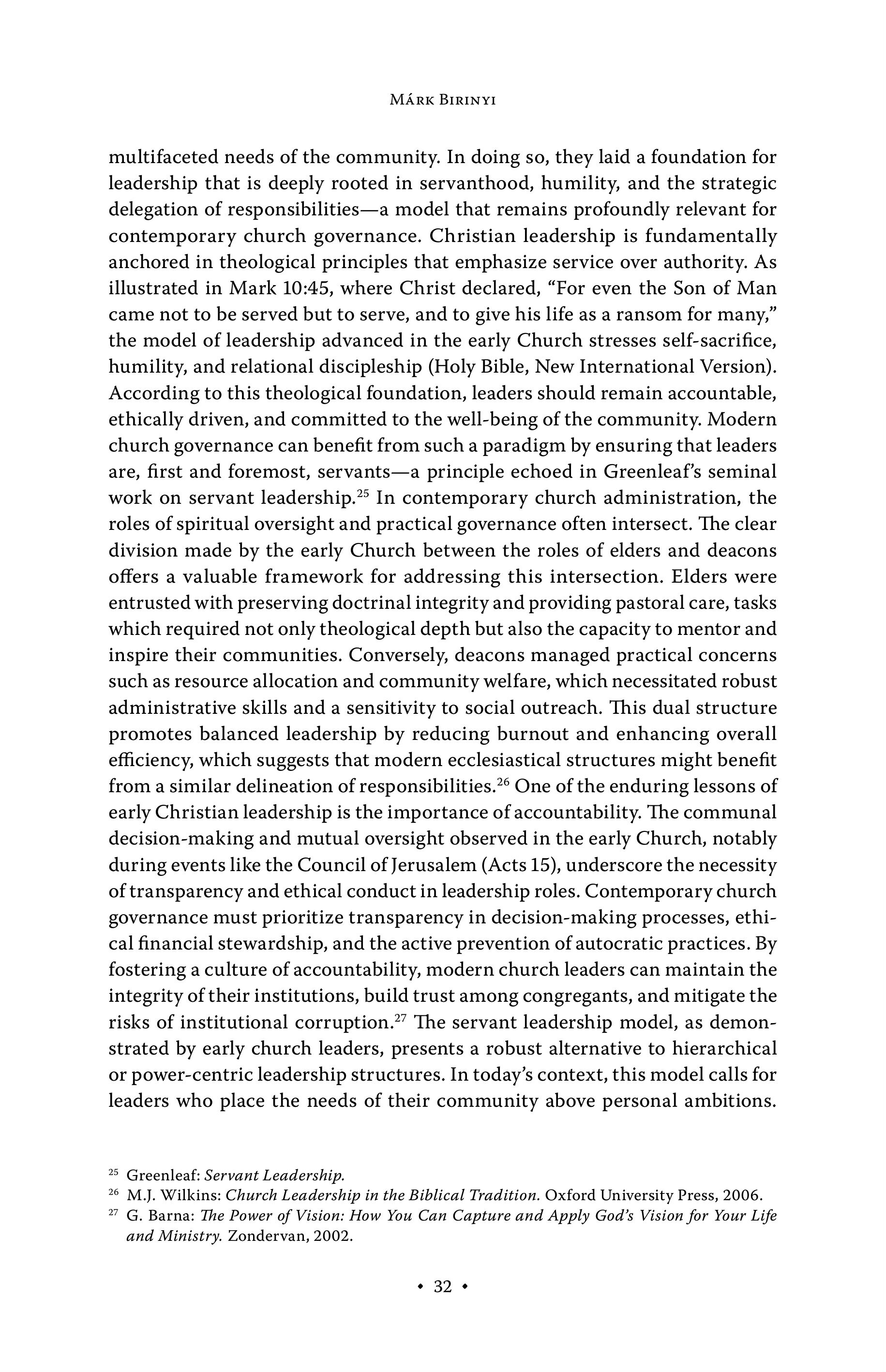 MÁRK BIRINYI multifaceted needs of the community. In doing so, they laid a foundation for leadership that is deeply rooted in servanthood, humility, and the strategic delegation of responsibilities—a model that remains profoundly relevant for contemporary church governance. Christian leadership is fundamentally anchored in theological principles that emphasize service over authority. As illustrated in Mark 10:45, where Christ declared, “For even the Son of Man came not to be served but to serve, and to give his life as a ransom for many,” the model of leadership advanced in the early Church stresses self-sacrifice, humility, and relational discipleship (Holy Bible, New International Version). According to this theological foundation, leaders should remain accountable, ethically driven, and committed to the well-being of the community. Modern church governance can benefit from such a paradigm by ensuring that leaders are, first and foremost, servants—a principle echoed in Greenleaf’s seminal work on servant leadership.” In contemporary church administration, the roles of spiritual oversight and practical governance often intersect. The clear division made by the early Church between the roles of elders and deacons offers a valuable framework for addressing this intersection. Elders were entrusted with preserving doctrinal integrity and providing pastoral care, tasks which required not only theological depth but also the capacity to mentor and inspire their communities. Conversely, deacons managed practical concerns such as resource allocation and community welfare, which necessitated robust administrative skills and a sensitivity to social outreach. This dual structure promotes balanced leadership by reducing burnout and enhancing overall efficiency, which suggests that modern ecclesiastical structures might benefit from a similar delineation of responsibilities. One of the enduring lessons of early Christian leadership is the importance of accountability. The communal decision-making and mutual oversight observed in the early Church, notably during events like the Council of Jerusalem (Acts 15), underscore the necessity of transparency and ethical conduct in leadership roles. Contemporary church governance must prioritize transparency in decision-making processes, ethical financial stewardship, and the active prevention of autocratic practices. By fostering a culture of accountability, modern church leaders can maintain the integrity of their institutions, build trust among congregants, and mitigate the risks of institutional corruption.”’ The servant leadership model, as demonstrated by early church leaders, presents a robust alternative to hierarchical or power-centric leadership structures. In today’s context, this model calls for leaders who place the needs of their community above personal ambitions. °5 Greenleaf: Servant Leadership. 26 M.J. Wilkins: Church Leadership in the Biblical Tradition. Oxford University Press, 2006. ”” G. Barna: The Power of Vision: How You Can Capture and Apply God’s Vision for Your Life and Ministry. Zondervan, 2002. .32 +