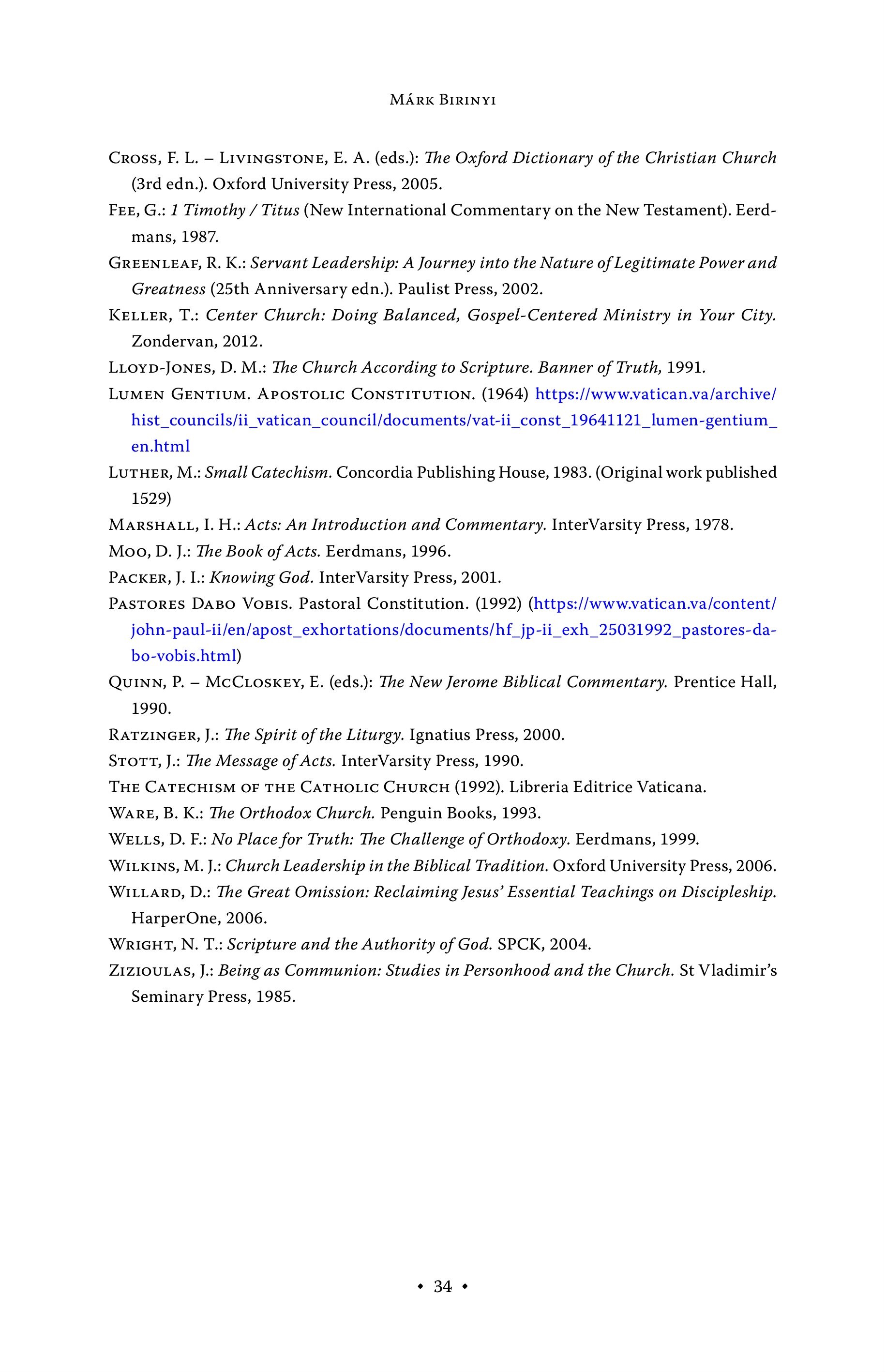 MÁRK BIRINYI CRoss, F. L. — LIVINGSTONE, E. A. (eds.): Ihe Oxford Dictionary of the Christian Church (3rd edn.). Oxford University Press, 2005. FEE, G.: 1 Timothy / Titus (New International Commentary on the New Testament). Eerdmans, 1987. GREENLEAF, R. K.: Servant Leadership: A Journey into the Nature of Legitimate Power and Greatness (25th Anniversary edn.). Paulist Press, 2002. KELLER, T.: Center Church: Doing Balanced, Gospel-Centered Ministry in Your City. Zondervan, 2012. LLoyD-Jones, D. M.: The Church According to Scripture. Banner of Truth, 1991. LUMEN GENTIUM. APOSTOLIC CONSTITUTION. (1964) https://www.vatican.va/archive/ hist_councils/ii_vatican_council/documents/vat-ii_const_19641121_lumen-gentium_ en.html LUTHER, M.: Small Catechism. Concordia Publishing House, 1983. (Original work published 1529) MARSHALL, I. H.: Acts: An Introduction and Commentary. InterVarsity Press, 1978. Moo, D. J.: The Book of Acts. Eerdmans, 1996. PACKER, J. I.: Knowing God. InterVarsity Press, 2001. PAsTORES DABO VoBIS. Pastoral Constitution. (1992) (https://www.vatican.va/content/ john-paul-ii/en/apost_exhortations/documents/hf_jp-ii_exh_25031992_pastores-dabo-vobis.htm]) QUINN, P. - McCLoskey, E. (eds.): The New Jerome Biblical Commentary. Prentice Hall, 1990. RATZINGER, J.: The Spirit of the Liturgy. Ignatius Press, 2000. STOTT, J.: The Message of Acts. InterVarsity Press, 1990. THE CATECHISM OF THE CATHOLIC CHURCH (1992). Libreria Editrice Vaticana. Ware, B. K.: The Orthodox Church. Penguin Books, 1993. WELLS, D. F.: No Place for Truth: The Challenge of Orthodoxy. Eerdmans, 1999. WILKINS, M. J.: Church Leadership in the Biblical Tradition. Oxford University Press, 2006. WILLARD, D.: The Great Omission: Reclaiming Jesus’ Essential Teachings on Discipleship. HarperOne, 2006. WRIGHT, N. T.: Scripture and the Authority of God. SPCK, 2004. ZIZIOULAS, J.: Being as Communion: Studies in Personhood and the Church. St Vladimir’s Seminary Press, 1985. + 34 +