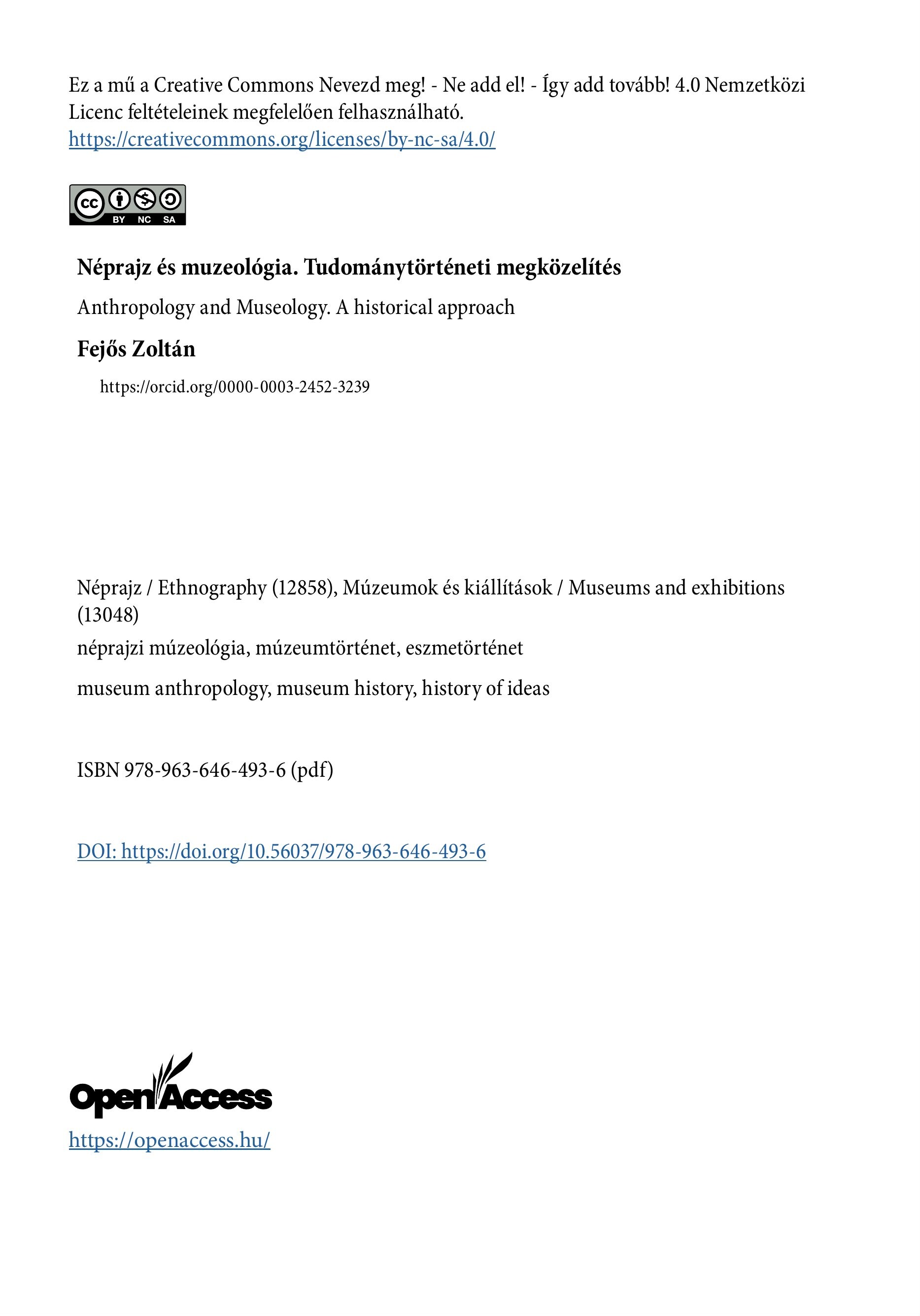 Ez a mű a Creative Commons Nevezd meg! - Ne add el! - Így add tovább! 4.0 Nemzetközi Licenc feltételeinek megfelelően felhasználható. https://creativecommons.org/licenses/by-nc-sa/4.0/ Néprajz és muzeológia. Tudománytörténeti megközelítés Anthropology and Museology. A historical approach Fejős Zoltán https://orcid.org/0000-0003-2452-3239 Néprajz / Ethnography (12858), Muzeumok és kiallitasok / Museums and exhibitions (13048) néprajzi müzeolögia, müzeumtörtenet, eszmetörtenet museum anthropology, museum history, history of ideas ISBN 978-963-646-493-6 (pdf) DOL: https://doi.org/10.56037/978-963-646-493-6 OpenlAccess https://openaccess.hu/