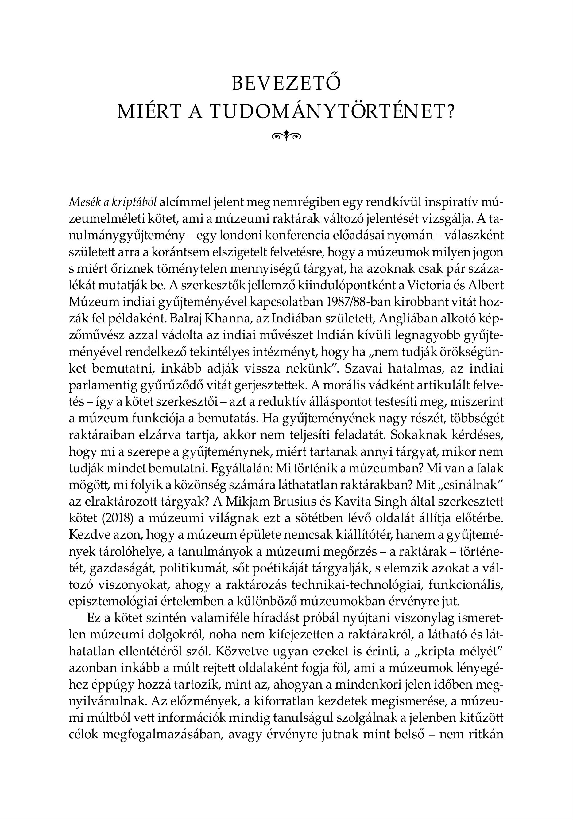 BEVEZETŐ MIÉRT A TUDOMÁNYTÖRTÉNET? ove Mesék a kriptából alcímmel jelent meg nemrégiben egy rendkívül inspiratív múzeumelméleti kötet, ami a múzeumi raktárak változó jelentését vizsgálja. A tanulmánygyűjtemény - egy londoni konferencia előadásai nyomán - válaszként született arra a korántsem elszigetelt felvetésre, hogy a múzeumok milyen jogon s miért őriznek töménytelen mennyiségű tárgyat, ha azoknak csak pár százalékát mutatják be. A szerkesztők jellemző kiindulópontként a Victoria és Albert Múzeum indiai gyűjteményével kapcsolatban 1987/88-ban kirobbant vitát hozzák fel példaként. Balraj Khanna, az Indiában született, Angliában alkotó képzőművész azzal vádolta az indiai művészet Indián kívüli legnagyobb gyűjteményével rendelkező tekintélyes intézményt, hogy ha , nem tudják örökségünket bemutatni, inkább adják vissza nekünk". Szavai hatalmas, az indiai parlamentig gyűrűződő vitát gerjesztettek. A morális vádként artikulált felvetés — így a kötet szerkesztői — azt a reduktív álláspontot testesíti meg, miszerint a múzeum funkciója a bemutatás. Ha gyűjteményének nagy részét, többségét raktáraiban elzárva tartja, akkor nem teljesíti feladatát. Sokaknak kérdéses, hogy mi a szerepe a gyűjteménynek, miért tartanak annyi tárgyat, mikor nem tudják mindet bemutatni. Egyáltalán: Mi történik amúzeumban? Mi van a falak mögött, mi folyik a közönség számára láthatatlan raktárakban? Mit , csinálnak" az elraktározott tárgyak? A Mikjam Brusius és Kavita Singh által szerkesztett kötet (2018) a múzeumi világnak ezt a sötétben lévő oldalát állítja előtérbe. Kezdve azon, hogy a múzeum épülete nemcsak kiállítótér, hanem a gyűjtemények tárolóhelye, a tanulmányok a múzeumi megőrzés - a raktárak — torténetét, gazdaságát, politikumát, sőt poétikáját tárgyalják, s elemzik azokat a változó viszonyokat, ahogy a raktározás technikai-technológiai, funkcionális, episztemológiai értelemben a különböző múzeumokban érvényre jut. Ez a kötet szintén valamiféle híradást próbál nyújtani viszonylag ismeretlen múzeumi dolgokról, noha nem kifejezetten a raktárakról, a látható és láthatatlan ellentétéről szól. Közvetve ugyan ezeket is érinti, a , kripta mélyét" azonban inkább a múlt rejtett oldalaként fogja föl, ami a múzeumok lényegéhez éppúgy hozzá tartozik, mint az, ahogyan a mindenkori jelen időben megnyilvánulnak. Az előzmények, a kiforratlan kezdetek megismerése, a múzeumi múltból vett információk mindig tanulságul szolgálnak a jelenben kitűzött célok megfogalmazásában, avagy érvényre jutnak mint belső - nem ritkán