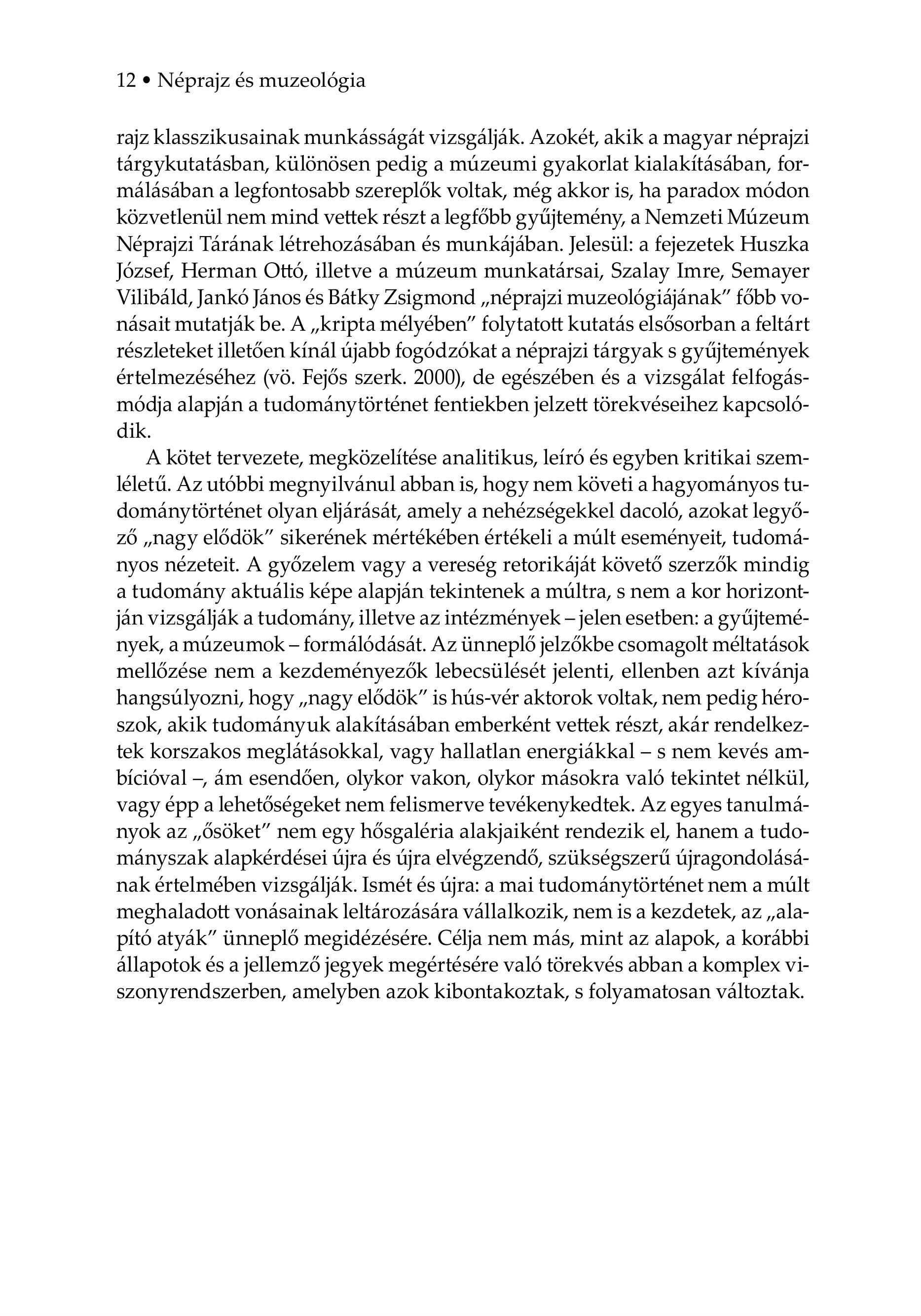 12 9 Néprajz és muzeológia rajz klasszikusainak munkásságát vizsgálják. Azokét, akik a magyar néprajzi tárgykutatásban, különösen pedig a múzeumi gyakorlat kialakításában, formálásában a legfontosabb szereplők voltak, még akkor is, ha paradox módon közvetlenül nem mind vettek részt a legfőbb gyűjtemény, a Nemzeti Múzeum Néprajzi Tárának létrehozásában és munkájában. Jelesül: a fejezetek Huszka József, Herman Ottó, illetve a múzeum munkatársai, Szalay Imre, Semayer Vilibáld, Jankó János és Bátky Zsigmond , néprajzi muzeológiájának" főbb vonásait mutatják be. A , kripta mélyében" folytatott kutatás elsősorban a feltárt részleteket illetően kínál újabb fogódzókat a néprajzi tárgyak s gyűjtemények értelmezéséhez (vö. Fejős szerk. 2000), de egészében és a vizsgálat felfogásmódja alapján a tudománytörténet fentiekben jelzett törekvéseihez kapcsolódik. A kötet tervezete, megközelítése analitikus, leíró és egyben kritikai szemléletű. Az utóbbi megnyilvánul abban is, hogy nem követi a hagyományos tudománytörténet olyan eljárását, amely a nehézségekkel dacoló, azokat legyőző ,nagy elődök" sikerének mértékében értékeli a múlt eseményeit, tudományos nézeteit. A győzelem vagy a vereség retorikáját követő szerzők mindig a tudomány aktuális képe alapján tekintenek a múltra, s nem a kor horizontján vizsgálják a tudomány, illetve az intézmények - jelen esetben: a gyűjtemények, a múzeumok - formálódását. Az ünneplő jelzőkbe csomagolt méltatások mellőzése nem a kezdeményezők lebecsülését jelenti, ellenben azt kívánja hangsúlyozni, hogy , nagy elődök" is hús-vér aktorok voltak, nem pedig héroszok, akik tudományuk alakításában emberként vettek részt, akár rendelkeztek korszakos meglátásokkal, vagy hallatlan energiákkal - s nem kevés ambiciöval —, am esendően, olykor vakon, olykor másokra való tekintet nélkül, vagy épp a lehetőségeket nem felismerve tevékenykedtek. Az egyes tanulmányok az ,dsdket” nem egy hösgaleria alakjaikent rendezik el, hanem a tudományszak alapkérdései újra és újra elvégzendő, szükségszerű újragondolásának értelmében vizsgálják. Ismét és újra: a mai tudománytörténet nem a múlt meghaladott vonásainak leltározására vállalkozik, nem is a kezdetek, az , alapító atyák" ünneplő megidézésére. Célja nem más, mint az alapok, a korábbi állapotok és a jellemző jegyek megértésére való törekvés abban a komplex viszonyrendszerben, amelyben azok kibontakoztak, s folyamatosan változtak.