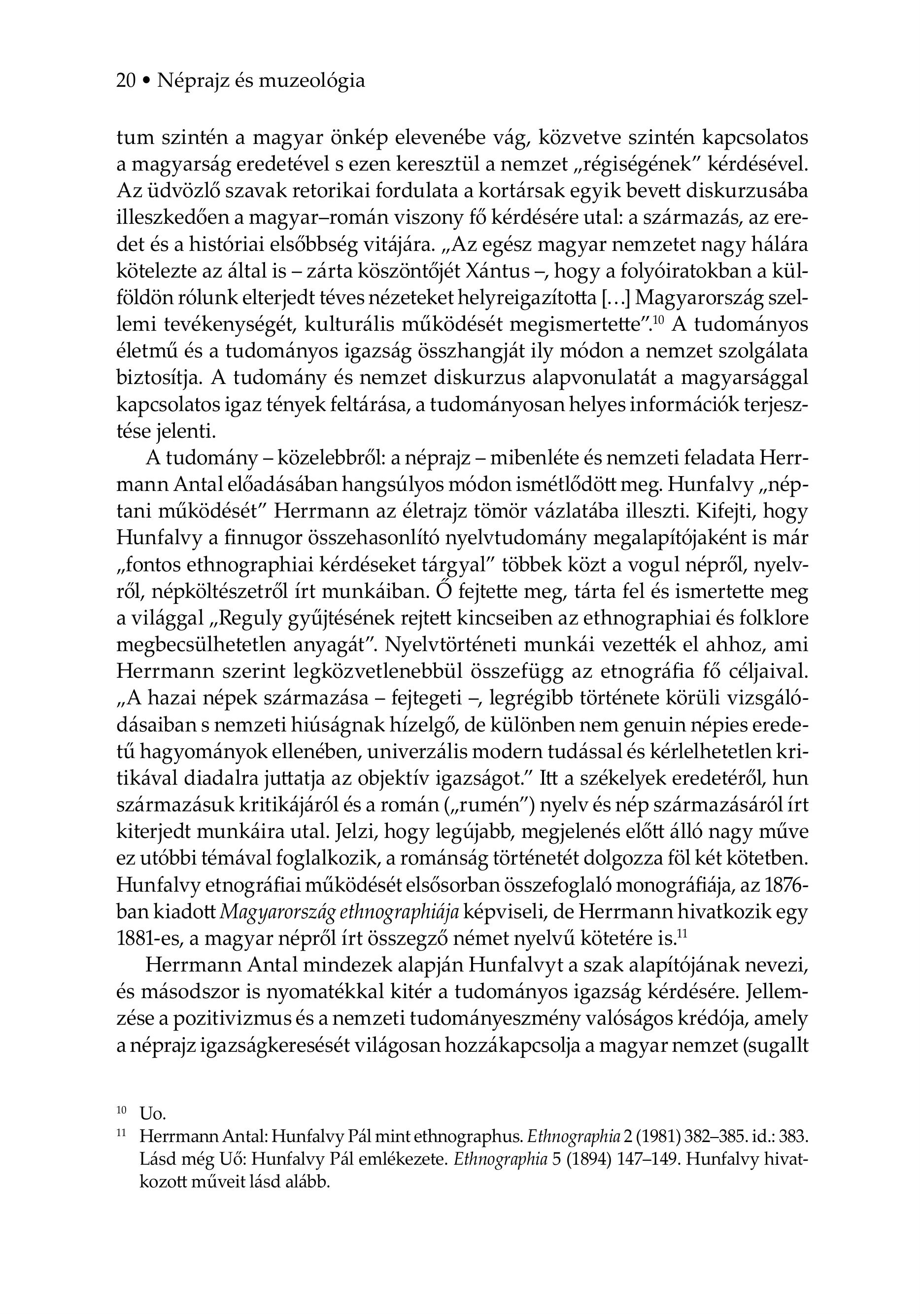 20 9 Néprajz és muzeológia tum szintén a magyar önkép elevenébe vág, közvetve szintén kapcsolatos a magyarság eredetével s ezen keresztül a nemzet , régiségének" kérdésével. Az üdvözlő szavak retorikai fordulata a kortársak egyik bevett diskurzusába illeszkedően a magyar-román viszony fő kérdésére utal: a származás, az eredet és a históriai elsőbbség vitájára. , Az egész magyar nemzetet nagy hálára kötelezte az által is — zárta köszöntőjét Xántus —, hogy a folyóiratokban a külföldön rólunk elterjedt téves nézeteket helyreigazította [...] Magyarország szellemi tevékenységét, kulturális működését megismertette"." A tudományos életmű és a tudományos igazság összhangját ily módon a nemzet szolgálata biztosítja. A tudomány és nemzet diskurzus alapvonulatát a magyarsággal kapcsolatos igaz tények feltárása, atudományosan helyes információk terjesztése jelenti. A tudomány - közelebbről: a néprajz — mibenléte és nemzeti feladata Herrmann Antal előadásában hangsúlyos módon ismétlődött meg. Hunfalvy , néptani működését" Herrmann az életrajz tömör vázlatába illeszti. Kifejti, hogy Hunfalvy a finnugor összehasonlító nyelvtudomány megalapítójaként is már ,ftontos ethnographiai kérdéseket tárgyal" többek közt a vogul népről, nyelvről, népköltészetről írt munkáiban. Ő fejtette meg, tárta fel és ismertette meg a világgal , Reguly gyűjtésének rejtett kincseiben az ethnographiai és folklore megbecsülhetetlen anyagát". Nyelvtörténeti munkái vezették el ahhoz, ami Herrmann szerint legközvetlenebbül összefügg az etnográfia fő céljaival. , À hazai népek származása - fejtegeti —, legrégibb története körüli vizsgálódásaiban s nemzeti hiúságnak hízelgő, de különben nem genuin népies eredetű hagyományok ellenében, univerzális modern tudással és kérlelhetetlen kritikával diadalra juttatja az objektív igazságot." Itt a székelyek eredetéről, hun származásuk kritikájáról és a román (, rumén") nyelv és nép származásáról írt kiterjedt munkáira utal. Jelzi, hogy legújabb, megjelenés előtt álló nagy műve ez utóbbi témával foglalkozik, a románság történetét dolgozza föl két kötetben. Hunfalvy etnográfiai működését elsősorban összefoglaló monográfiája, az 1876ban kiadott Magyarország ethnographiája képviseli, de Herrmann hivatkozik egy 1881-es, a magyar népről írt összegző német nyelvű kötetére is." Herrmann Antal mindezek alapján Hunfalvyt a szak alapítójának nevezi, és másodszor is nyomatékkal kitér a tudományos igazság kérdésére. Jellemzése a pozitivizmus és a nemzeti tudományeszmény valóságos krédója, amely a néprajz igazságkeresését világosan hozzákapcsolja a magyar nemzet (sugallt 1 Uo. 2° Herrmann Antal: Hunfalvy Päl mint ethnographus. Ethmographia 2 (1981) 382-385. id.: 383. Läsd még U6: Hunfalvy Pál emlékezete. Ethnographia 5 (1894) 147-149. Hunfalvy hivatkozott műveit lásd alább.