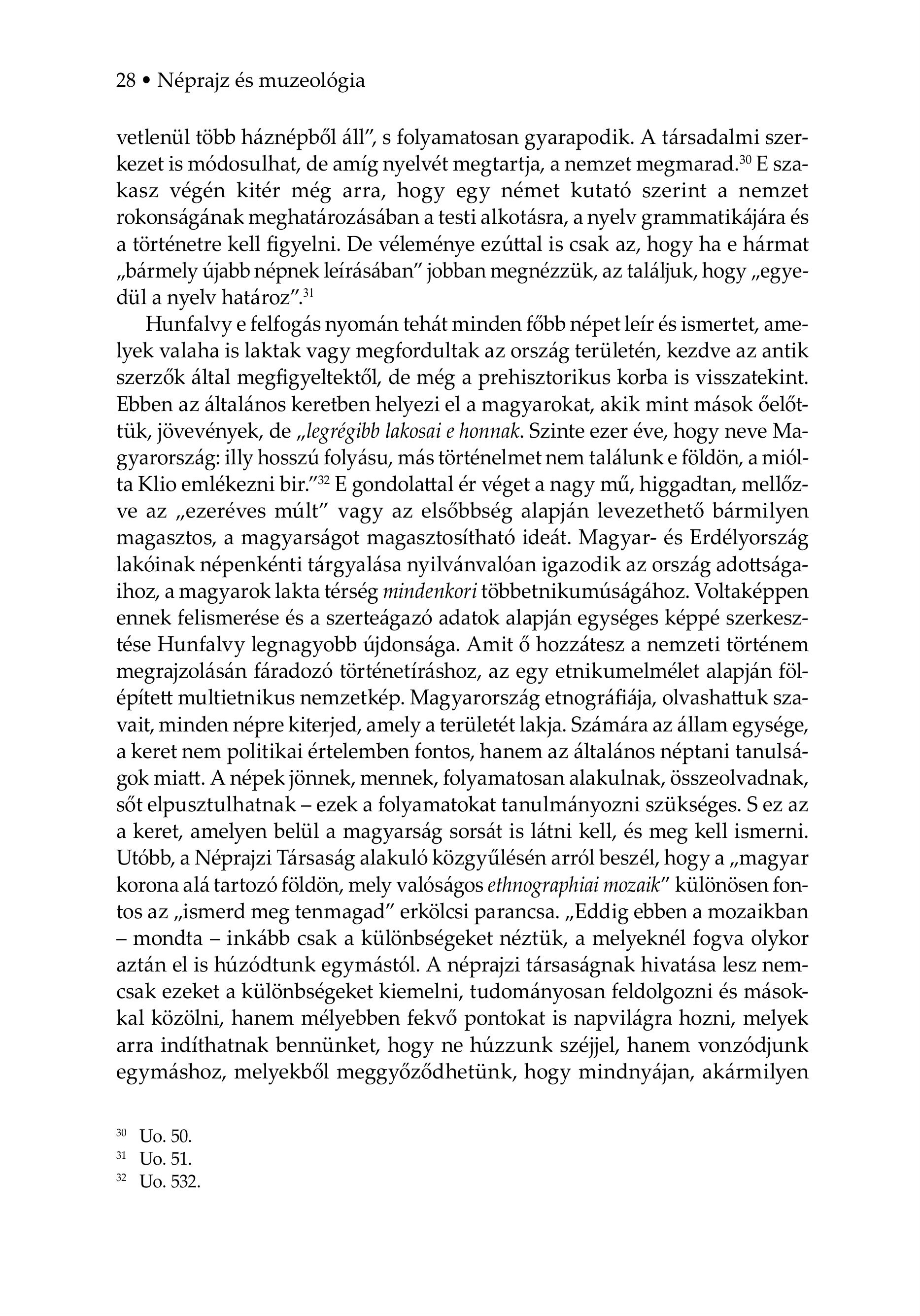 28 9 Néprajz és muzeológia vetlenül több háznépből áll" s folyamatosan gyarapodik. A társadalmi szerkezet is módosulhat, de amíg nyelvét megtartja, a nemzet megmarad." E szakasz végén kitér még arra, hogy egy német kutató szerint a nemzet rokonságának meghatározásában a testi alkotásra, a nyelv grammatikájára és a történetre kell figyelni. De véleménye ezúttal is csak az, hogy ha e hármat ,barmely újabb népnek leírásában" jobban megnézzük, az találjuk, hogy ,egyedül a nyelv határoz". Hunfalvy e felfogás nyomán tehát minden főbb népet leír és ismertet, amelyek valaha is laktak vagy megfordultak az ország területén, kezdve az antik szerzők által megfigyeltektől, de még a prehisztorikus korba is visszatekint. Ebben az általános keretben helyezi el a magyarokat, akik mint mások őelőttük, jövevények, de , legrégibb lakosai e honnak. Szinte ezer éve, hogy neve Magyarország: illy hosszú folyásu, más történelmet nem találunk e földön, a miólta Klio emlékezni bir."? E gondolattal ér véget a nagy mű, higgadtan, mellőzve az ,ezeréves múlt" vagy az elsőbbség alapján levezethető bármilyen magasztos, a magyarságot magasztosítható ideát. Magyar- és Erdélyország lakóinak népenkénti tárgyalása nyilvánvalóan igazodik az ország adottságaihoz, a magyarok lakta térség mindenkori többetnikumúságához. Voltaképpen ennek felismerése és a szerteágazó adatok alapján egységes képpé szerkesztése Hunfalvy legnagyobb újdonsága. Amit ő hozzátesz a nemzeti történem megrajzolásán fáradozó történetíráshoz, az egy etnikumelmélet alapján fölépített multietnikus nemzetkép. Magyarország etnográfiája, olvashattuk szavait, minden népre kiterjed, amely a területét lakja. Számára az állam egysége, a keret nem politikai értelemben fontos, hanem az általános néptani tanulságok miatt. A népek jönnek, mennek, folyamatosan alakulnak, összeolvadnak, sőt elpusztulhatnak - ezek a folyamatokat tanulmányozni szükséges. S ez az a keret, amelyen belül a magyarság sorsát is látni kell, és meg kell ismerni. Utóbb, a Néprajzi Társaság alakuló közgyűlésén arról beszél, hogy a , magyar korona alá tartozó földön, mely valóságos ethnographiai mozaik" különösen fontos az ,ismerd meg tenmagad" erkölcsi parancsa. , Eddig ebben a mozaikban — mondta - inkább csak a különbségeket néztük, a melyeknél fogva olykor aztán el is húzódtunk egymástól. A néprajzi társaságnak hivatása lesz nemcsak ezeket a különbségeket kiemelni, tudományosan feldolgozni és másokkal közölni, hanem mélyebben fekvő pontokat is napvilágra hozni, melyek arra indíthatnak bennünket, hogy ne húzzunk széjjel, hanem vonzódjunk egymáshoz, melyekből meggyőződhetünk, hogy mindnyájan, akármilyen 30 Uo. 50. 31 Uo. 51. 2 Uo. 532.