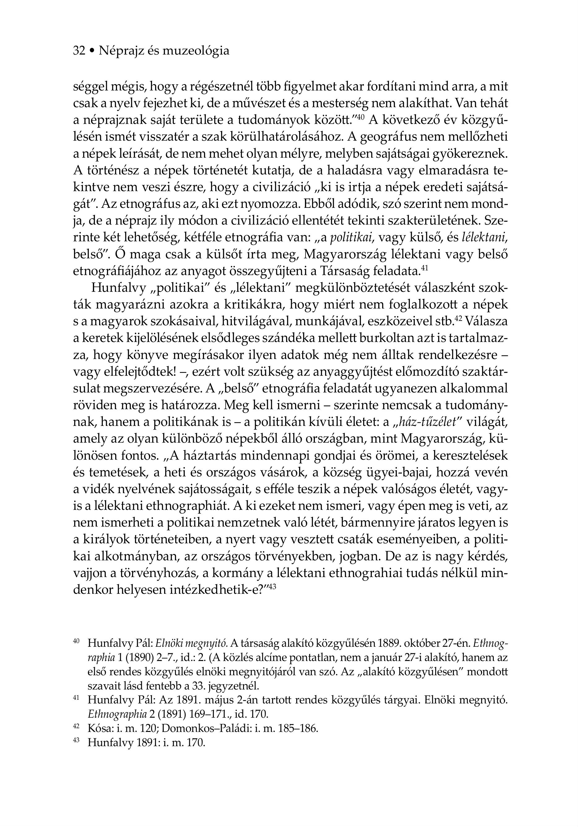 32 9 Néprajz és muzeológia séggel mégis, hogy a régészetnél több figyelmet akar fordítani mind arra, a mit csak a nyelv fejezhet ki, de a művészet és a mesterség nem alakíthat. Van tehát a néprajznak saját területe a tudományok között." A következő év közgyűlésén ismét visszatér a szak körülhatárolásához. A geográfus nem mellőzheti a népek leírását, de nem mehet olyan mélyre, melyben sajátságai gyökereznek. A történész a népek történetét kutatja, de a haladásra vagy elmaradásra tekintve nem veszi észre, hogy a civilizáció , ki is irtja a népek eredeti sajátságát". Az etnográfus az, aki ezt nyomozza. Ebből adódik, szó szerint nem mondja, de a néprajz ily módon a civilizáció ellentétét tekinti szakterületének. Szerinte két lehetőség, kétféle etnográfia van: ,,a politikai, vagy külső, és lélektani, belső". Ő maga csak a külsőt írta meg, Magyarország lélektani vagy belső etnográfiájához az anyagot összegyűjteni a Társaság feladata." Hunfalvy , politikai" és , lélektani" megkülönböztetését válaszként szokták magyarázni azokra a kritikákra, hogy miért nem foglalkozott a népek s a magyarok szokásaival, hitvilágával, munkájával, eszközeivel stb.? Válasza a keretek kijelölésének elsődleges szándéka mellett burkoltan azt is tartalmazza, hogy könyve megírásakor ilyen adatok még nem álltak rendelkezésre — vagy elfelejtődtek! —, ezért volt szükség az anyaggyűjtést előmozdító szaktársulat megszervezésére. A , belső" etnográfia feladatát ugyanezen alkalommal röviden meg is határozza. Meg kell ismerni — szerinte nemcsak a tudománynak, hanem a politikának is - a politikán kívüli életet: a , ház-tűzélet" világát, amely az olyan különböző népekből álló országban, mint Magyarország, különösen fontos. , A háztartás mindennapi gondjai és örömei, a keresztelések és temetések, a heti és országos vásárok, a község ügyei-bajai, hozzá vevén a vidék nyelvének sajátosságait, s efféle teszik a népek valóságos életét, vagyis a lelektani ethnographiät. A ki ezeket nem ismeri, vagy épen meg is veti, az nem ismerheti a politikai nemzetnek való létét, bármennyire járatos legyen is a királyok történeteiben, a nyert vagy vesztett csaták eseményeiben, a politikai alkotmányban, az országos törvényekben, jogban. De az is nagy kérdés, vajjon a törvényhozás, a kormány a lélektani ethnograhiai tudás nélkül mindenkor helyesen intezkedhetik-e?”" “ Hunfalvy Päl: Elnöki megnyitö. A társaság alakító közgyűlésén 1889. október 27-én. Ethnographia 1 (1890) 2-7. id.: 2. (A közlés alcíme pontatlan, nem a január 27-i alakító, hanem az első rendes közgyűlés elnöki megnyitójáról van szó. Az , alakító közgyűlésen" mondott szavait lásd fentebb a 33. jegyzetnél. 4 Hunfalvy Pal: Az 1891. május 2-án tartott rendes közgyűlés tárgyai. Elnöki megnyitó. Ethnographia 2 (1891) 169-171., id. 170. #2 Kösa: i. m. 120; Domonkos-Palädi: i. m. 185-186. ® Hunfalvy 1891: i. m. 170.