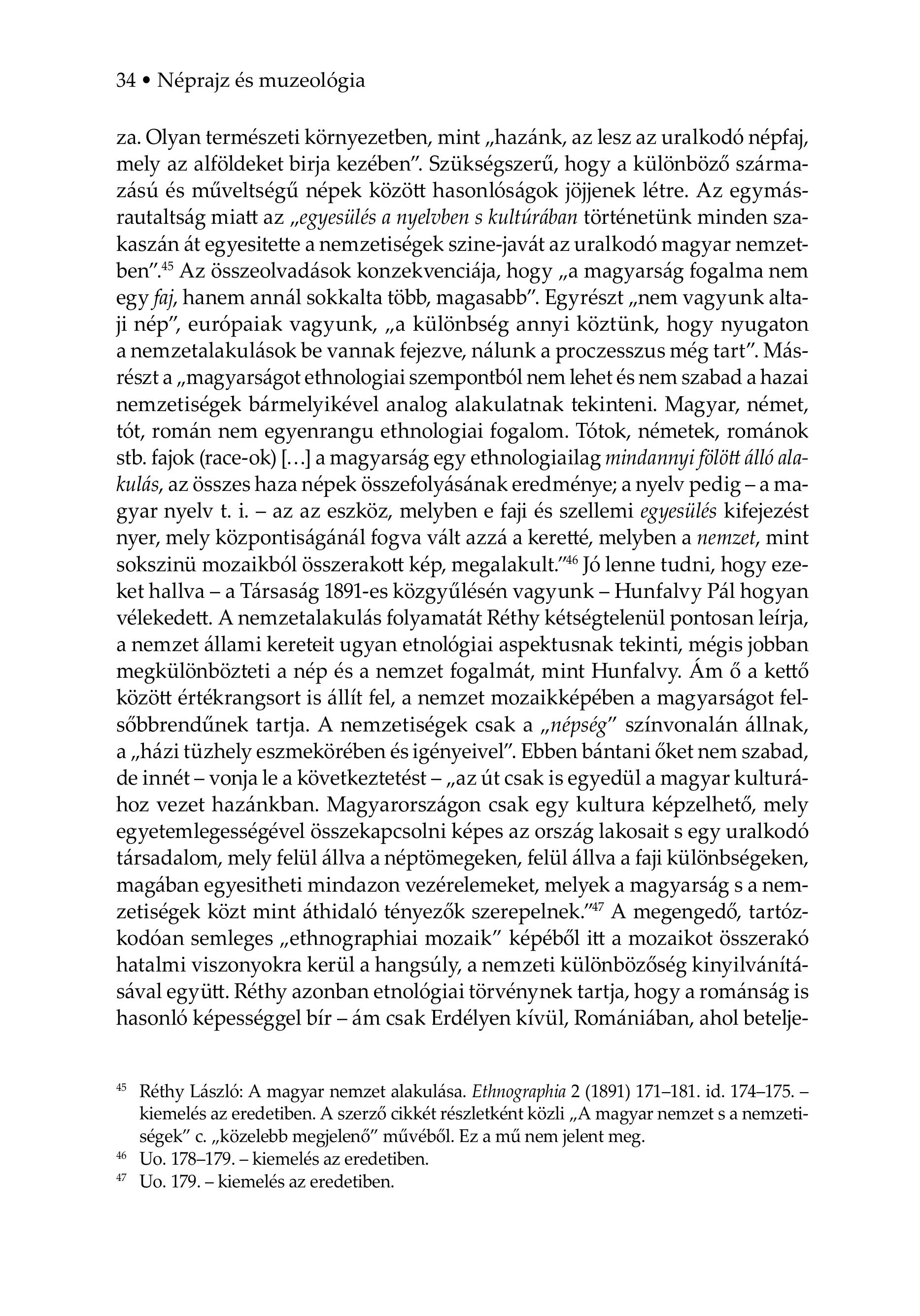 34 9 Néprajz és muzeológia za. Olyan természeti környezetben, mint , hazánk, az lesz az uralkodó népfaj, mely az alföldeket birja kezében". Szükségszerű, hogy a különböző származású és műveltségű népek között hasonlóságok jöjjenek létre. Az egymásrautaltság miatt az , egyesülés a nyelvben s kultúrában történetünk minden szakaszán át egyesitette a nemzetiségek szine-javát az uralkodó magyar nemzetben”. Az összeolvadások konzekvenciája, hogy ,a magyarság fogalma nem egy faj, hanem annál sokkalta több, magasabb". Egyrészt , nem vagyunk altaji nép", európaiak vagyunk, ,,a különbség annyi köztünk, hogy nyugaton a nemzetalakulások be vannak fejezve, nálunk a proczesszus még tart". Másrészt a , nagyarságot ethnologiai szempontból nem lehet és nem szabad a hazai nemzetiségek bármelyikével analog alakulatnak tekinteni. Magyar, német, tót, román nem egyenrangu ethnologiai fogalom. Tótok, németek, románok stb. fajok (race-ok) [...] a magyarság egy ethnologiailag mindannyi fölött álló alakulás, az összes haza népek összefolyásának eredménye; a nyelv pedig — a magyar nyelv t. i. — az az eszköz, melyben e faji és szellemi egyesülés kifejezést nyer, mely központiságánál fogva vált azzá a keretté, melyben a nemzet, mint sokszinü mozaikból összerakott kép, megalakult." Jó lenne tudni, hogy ezeket hallva - a Társaság 1891-es közgyűlésén vagyunk - Hunfalvy Pál hogyan vélekedett. A nemzetalakulás folyamatát Réthy kétségtelenül pontosan leírja, a nemzet állami kereteit ugyan etnológiai aspektusnak tekinti, mégis jobban megkülönbözteti a nép és a nemzet fogalmát, mint Hunfalvy. Ám ő a kettő között értékrangsort is állít fel, a nemzet mozaikképében a magyarságot felsőbbrendűnek tartja. A nemzetiségek csak a , népség" színvonalán állnak, a , házi tüzhely eszmekörében és igényeivel". Ebben bántani őket nem szabad, de innét - vonja le a következtetést - , az út csak is egyedül a magyar kulturához vezet hazánkban. Magyarországon csak egy kultura képzelhető, mely egyetemlegességével összekapcsolni képes az ország lakosait s egy uralkodó társadalom, mely felül állva a néptömegeker, felül állva a faji különbségeken, magában egyesitheti mindazon vezérelemeket, melyek a magyarság s a nemzetiségek közt mint áthidaló tényezők szerepelnek."" A megengedő, tartózkodóan semleges , ethnographiai mozaik" képéből itt a mozaikot összerakó hatalmi viszonyokra kerül a hangsúly, a nemzeti különbözőség kinyilvánításával együtt. Réthy azonban etnológiai törvénynek tartja, hogy a románság is hasonló képességgel bír — ám csak Erdélyen kívül, Romániában, ahol betelje5 Réthy László: A magyar nemzet alakulása. Ethnographia 2 (1891) 171-181. id. 174-175. kiemelés az eredetiben. A szerző cikkét részletként közli , A magyar nemzet s a nemzetiségek" c. ,közelebb megjelenő" művéből. Ez a mű nem jelent meg. 16 Uo. 178-179. — kiemelés az eredetiben. 47 Uo. 179. —kiemelés az eredetiben.