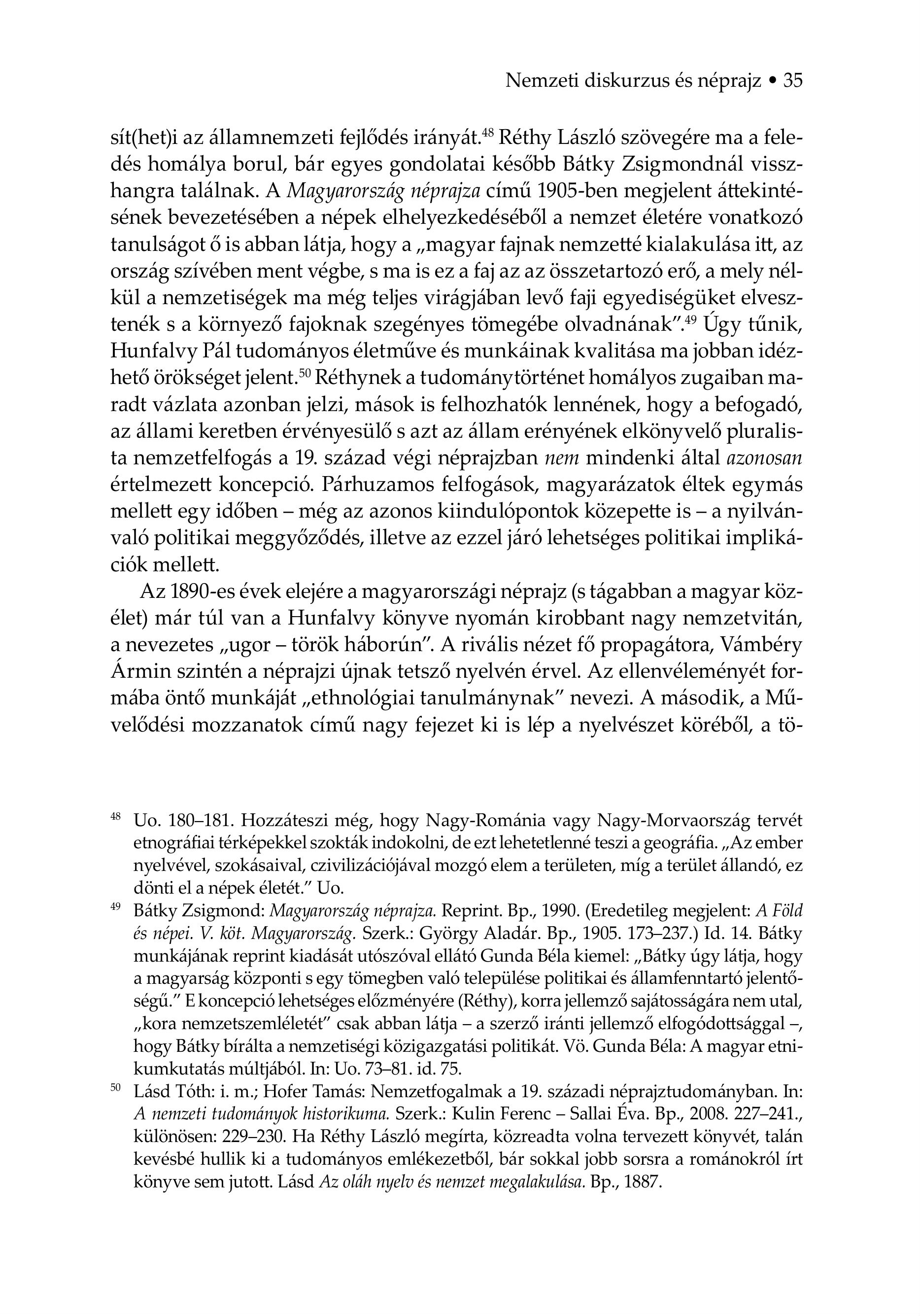 Nemzeti diskurzus és néprajz ? 35 sit(het)i az államnemzeti fejlődés irányát." Réthy László szövegére ma a feledés homálya borul, bár egyes gondolatai később Bátky Zsigmondnál visszhangra találnak. A Magyarország néprajza című 1905-ben megjelent áttekintésének bevezetésében a népek elhelyezkedéséből a nemzet életére vonatkozó tanulságot ő is abban látja, hogy a , magyar fajnak nemzetté kialakulása itt, az ország szívében ment végbe, s ma is ez a faj az az összetartozó erő, a mely nélkül a nemzetiségek ma még teljes virágjában levő faji egyediségüket elvesztenék s a környező fajoknak szegényes tömegébe olvadnának".9 Úgy tűnik, Hunfalvy Pál tudományos életműve és munkáinak kvalitása ma jobban idézhető örökséget jelent." Réthynek a tudománytörténet homályos zugaiban maradt vázlata azonban jelzi, mások is felhozhatók lennének, hogy a befogadó, az állami keretben érvényesülő s azt az állam erényének elkönyvelő pluralista nemzetfelfogás a 19. század végi néprajzban nem mindenki által azonosan értelmezett koncepció. Párhuzamos felfogások, magyarázatok éltek egymás mellett egy időben - meg az azonos kiindulöpontok közepette is — a nyilvánvaló politikai meggyőződés, illetve az ezzel járó lehetséges politikai implikációk mellett. Az 1890-es évek elejére a magyarországi néprajz (s tágabban a magyar közélet) már túl van a Hunfalvy könyve nyomán kirobbant nagy nemzetvitán, a nevezetes , ugor — török háborún". A rivális nézet fő propagátora, Vámbéry Ármin szintén a néprajzi újnak tetsző nyelvén érvel. Az ellenvéleményét formába öntő munkáját , ethnológiai tanulmánynak" nevezi. A második, a Művelődési mozzanatok című nagy fejezet ki is lép a nyelvészet köréből, a tö48 Uo. 180-181. Hozzáteszi még, hogy Nagy-Románia vagy Nagy-Morvaország tervét etnográfiai térképekkel szokták indokolni, de ezt lehetetlenné teszi a geográfia. , Az ember nyelvével, szokásaival, czivilizációjával mozgó elem a területen, míg a terület állandó, ez dönti el a népek életét." Uo. Bátky Zsigmond: Magyarország néprajza. Reprint. Bp., 1990. (Eredetileg megjelent: A Föld és népei. V. köt. Magyarország. Szerk.: Gyérgy Aladar. Bp., 1905. 173-237.) Id. 14. Batky munkájának reprint kiadását utószóval ellátó Gunda Béla kiemel: , Bátky úgy látja, hogy a magyarság központi s egy tömegben való települése politikai és államfenntartó jelentőségű." E koncepció lehetséges előzményére (Réthy), korra jellemző sajátosságára nem utal, „kora nemzetszemléletét" csak abban látja — a szerző iránti jellemzö elfogödottsäggal -, hogy Bátky bírálta a nemzetiségi közigazgatási politikát. Vö. Gunda Béla: A magyar etnikumkutatás múltjából. In: Uo. 73-81. id. 75. Lásd Tóth: i. m.; Hofer Tamas: Nemzetfogalmak a 19. szazadi néprajztudomanyban. In: A nemzeti tudományok historikuma. Szerk.: Kulin Ferenc — Sallai Eva. Bp., 2008. 227-241., különösen: 229-230. Ha Réthy László megírta, közreadta volna tervezett könyvét, talán kevésbé hullik ki a tudományos emlékezetből, bár sokkal jobb sorsra a románokról írt könyve sem jutott. Lásd Az oláh nyelv és nemzet megalakulása. Bp., 1887. 49 50