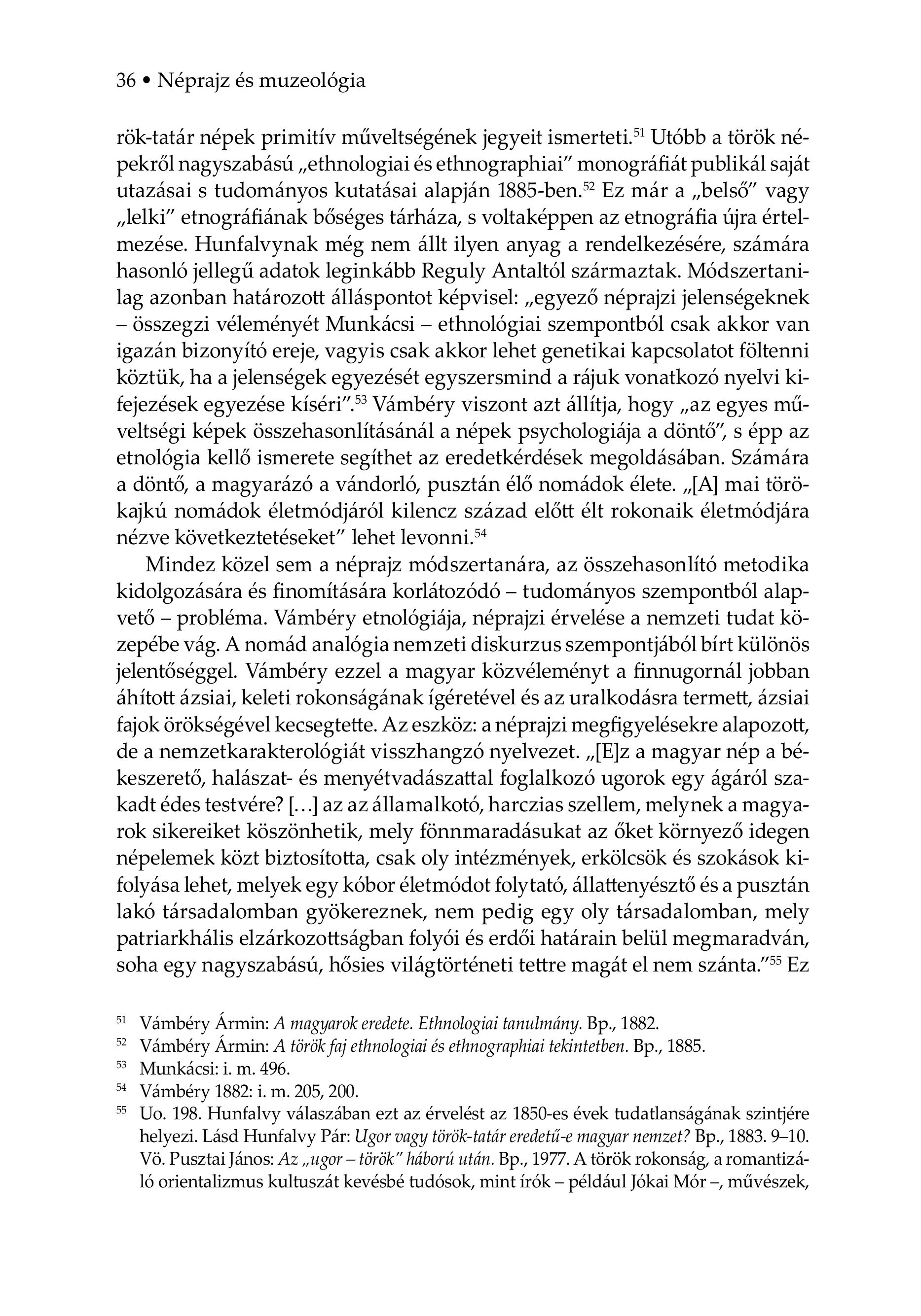 36 " Néprajz és muzeológia rök-tatár népek primitív műveltségének jegyeit ismerteti." Utóbb a török népekről nagyszabású , ethnologiai és ethnographiai" monográfiát publikál saját utazásai s tudományos kutatásai alapján 1885-ben.? Ez már a , belső" vagy lelki" etnográfiának bőséges tárháza, s voltaképpen az etnográfia újra értelmezése. Hunfalvynak még nem állt ilyen anyag a rendelkezésére, számára hasonló jellegű adatok leginkább Reguly Antaltól származtak. Módszertanilag azonban határozott álláspontot képvisel: ,egyező néprajzi jelenségeknek - összegzi véleményét Munkácsi - ethnológiai szempontból csak akkor van igazán bizonyító ereje, vagyis csak akkor lehet genetikai kapcsolatot föltenni köztük, ha a jelenségek egyezését egyszersmind a rájuk vonatkozó nyelvi kifejezések egyezése kíséri".? Vámbéry viszont azt állítja, hogy , az egyes műveltségi képek összehasonlításánál a népek psychologiája a döntő" s épp az etnológia kellő ismerete segíthet az eredetkérdések megoldásában. Számára a döntő, a magyarázó a vándorló, pusztán élő nomádok élete. , [A] mai törökajkú nomádok életmódjáról kilencz század előtt élt rokonaik életmódjára nézve következtetéseket" lehet levonni." Mindez közel sem a néprajz módszertanára, az összehasonlító metodika kidolgozására és finomítására korlátozódó — tudományos szempontból alapvető - probléma. Vámbéry etnológiája, néprajzi érvelése a nemzeti tudat közepébe vág. A nomád analógia nemzeti diskurzus szempontjából bírt különös jelentőséggel. Vámbéry ezzel a magyar közvéleményt a finnugornál jobban áhított ázsiai, keleti rokonságának ígéretével és az uralkodásra termett, ázsiai fajok örökségével kecsegtette. Az eszköz: a néprajzi megfigyelésekre alapozott, de a nemzetkarakterológiát visszhangzó nyelvezet. , [Elz a magyar nép a békeszerető, halászat- és menyétvadászattal foglalkozó ugorok egy ágáról szakadt édes testvére? [...] az az államalkotó, harczias szellem, melynek a magyarok sikereiket köszönhetik, mely fönnmaradásukat az őket környező idegen népelemek közt biztosította, csak oly intézmények, erkölcsök és szokások kifolyása lehet, melyek egy kóbor életmódot folytató, állattenyésztő és a pusztán lakó társadalomban gyökereznek, nem pedig egy oly társadalomban, mely patriarkhális elzárkozottságban folyói és erdői határain belül megmaradván, soha egy nagyszabású, hősies világtörténeti tettre magát el nem szánta."? Ez 51 Vámbéry Ármin: A magyarok eredete. Ethnologiai tanulmány. Bp., 1882. 52 Vámbéry Ármin: A török faj ethnologiai és ethnographiai tekintetben. Bp., 1885. 53 Munkacsi: i. m. 496. 5 Vámbéry 1882: i. m. 205, 200. 5 Uo. 198. Hunfalvy válaszában ezt az érvelést az 1850-es évek tudatlanságának szintjére helyezi. Lásd Hunfalvy Pár: LIgor vagy török-tatár eredetű-e magyar nemzet? Bp., 1883. 9-10. Vö. Pusztai János: Az , ugor — török" háború után. Bp., 1977. A török rokonság, a romantizáló orientalizmus kultuszát kevésbé tudósok, mint írók — például Jókai Mór —, művészek,
