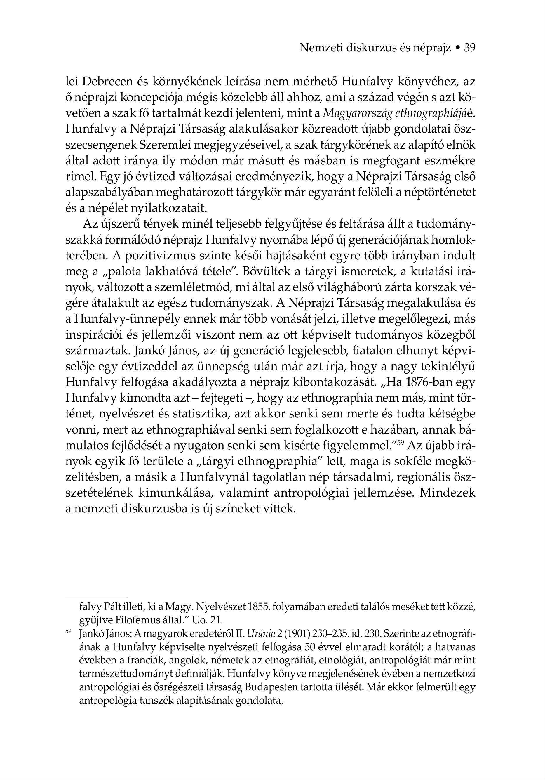 Nemzeti diskurzus és néprajz ? 39 lei Debrecen és környékének leírása nem mérhető Hunfalvy könyvéhez, az ő néprajzi koncepciója mégis közelebb áll ahhoz, ami a század végén s azt követően a szak fő tartalmát kezdi jelenteni, mint a Magyarország ethnographiájáé. Hunfalvy a Néprajzi Társaság alakulásakor közreadott újabb gondolatai öszszecsengenek Szeremlei megjegyzéseivel, a szak tárgykörének az alapító elnök által adott iránya ily módon már másutt és másban is megfogant eszmékre rímel. Egy jó évtized változásai eredményezik, hogy a Néprajzi Társaság első alapszabályában meghatározott tárgykör már egyaránt felöleli a néptörténetet és a népélet nyilatkozatait. Az újszerű tények minél teljesebb felgyűjtése és feltárása állt atudományszakká formálódó néprajz Hunfalvy nyomába lépő új generációjának homlokterében. A pozitivizmus szinte késői hajtásaként egyre több irányban indult meg a , palota lakhatóvá tétele". Bővültek a tárgyi ismeretek, a kutatási irányok, változott a szemléletmód, mi által az első világháború zárta korszak végére átalakult az egész tudományszak. A Néprajzi Társaság megalakulása és a Hunfalvy-ünnepély ennek már több vonását jelzi, illetve megelőlegezi, más inspirációi és jellemzői viszont nem az ott képviselt tudományos közegből származtak. Jankó János, az új generáció legjelesebb, fiatalon elhunyt képviselője egy évtizeddel az ünnepség után már azt írja, hogy a nagy tekintélyű Hunfalvy felfogása akadályozta a néprajz kibontakozását. , Ha 1876-ban egy Hunfalvy kimondta azt - fejtegeti — hogy az ethnographia nem más, mint történet, nyelvészet és statisztika, azt akkor senki sem merte és tudta kétségbe vonni, mert az ethnographiával senki sem foglalkozott e hazában, annak bámulatos fejlődését a nyugaton senki sem kisérte figyelemmel." Az újabb irányok egyik fő területe a , tárgyi ethnogpraphia" lett, maga is sokféle megközelítésben, a másik a Hunfalvynál tagolatlan nép társadalmi, regionális öszszetételének kimunkálása, valamint antropológiai jellemzése. Mindezek a nemzeti diskurzusba is új színeket vittek. falvy Páltilleti, kia Magy. Nyelvészet 1855. folyamában eredeti találós meséket tett közzé, gyüjtve Filofemus által." Uo. 21. "2 Jankó János: A magyarok eredetéről II. Uránia 2 (1901) 230-235. id. 230. Szerinte az etnográfiának a Hunfalvy képviselte nyelvészeti felfogása 50 évvel elmaradt korától; a hatvanas években a franciák, angolok, németek az etnográfiát, etnológiát, antropológiát már mint természettudományt definiálják. Hunfalvy könyve megjelenésének évében a nemzetközi antropológiai és ősrégészeti társaság Budapesten tartotta ülését. Már ekkor felmerült egy antropológia tanszék alapításának gondolata.