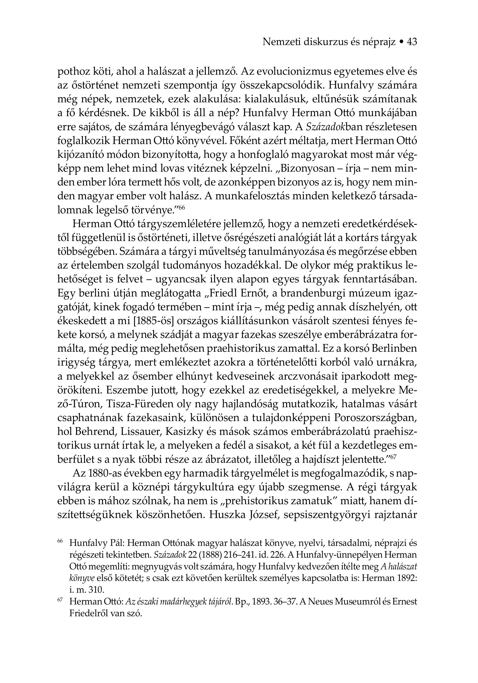 Nemzeti diskurzus és néprajz ? 43 pothoz köti, ahol a halászat a jellemző. Az evolucionizmus egyetemes elve és az őstörténet nemzeti szempontja így összekapcsolódik. Hunfalvy számára még népek, nemzetek, ezek alakulása: kialakulásuk, eltűnésük számítanak a fő kérdésnek. De kikből is áll a nép? Hunfalvy Herman Ottó munkájában erre sajátos, de számára lényegbevágó választ kap. A Századokban részletesen foglalkozik Herman Ottó könyvével. Főként azért méltatja, mert Herman Ottó kijózanító módon bizonyította, hogy a honfoglaló magyarokat most már végképp nem lehet mind lovas vitéznek képzelni. , Bizonyosan - írja -— nem minden ember lóra termett hős volt, de azonképpen bizonyos az is, hogy nem minden magyar ember volt halász. A munkafelosztás minden keletkező társadalomnak legelső törvénye." Herman Ottó tárgyszemléletére jellemző, hogy a nemzeti eredetkérdésektől függetlenül is őstörténeti, illetve ősrégészeti analógiát lát a kortárs tárgyak többségében. Számára a tárgyi műveltség tanulmányozása és megőrzése ebben az értelemben szolgál tudományos hozadékkal. De olykor még praktikus lehetőséget is felvet — ugyancsak ilyen alapon egyes tárgyak fenntartásában. Egy berlini útján meglátogatta , Friedl Ernőt, a brandenburgi múzeum igazgatóját, kinek fogadó termében - mint írja — még pedig annak díszhelyén, ott ékeskedett a mi [1885-ös] országos kiállításunkon vásárolt szentesi fényes fekete korsó, a melynek szádját a magyar fazekas szeszélye emberábrázatra formálta, még pedig meglehetősen praehistorikus zamattal. Ez a korsó Berlinben irigység tárgya, mert emlékeztet azokra a történetelőtti korból való urnákra, a melyekkel az ősember elhúnyt kedveseinek arczvonásait iparkodott megörökíteni. Eszembe jutott, hogy ezekkel az eredetiségekkel, a melyekre Mező-Túron, Tisza-Füreden oly nagy hajlandóság mutatkozik, hatalmas vásárt csaphatnának fazekasaink, különösen a tulajdonképpeni Poroszországban, hol Behrend, Lissauer, Kasizky és mások számos emberábrázolatú praehisztorikus urnát írtak le, a melyeken a fedél a sisakot, a két fül a kezdetleges emberfület s a nyak többi része az ábrázatot, illetőleg a hajdíszt jelentette." Az 1880-as években egy harmadik tárgyelmélet is megfogalmazódik, s napvilágra kerül a köznépi tárgykultúra egy újabb szegmense. A régi tárgyak ebben is mához szólnak, ha nem is , prehistorikus zamatuk" miatt, hanem díszitettsegüknek köszönhetöen. Huszka Jözsef, sepsiszentgyörgyi rajztanar 6 Hunfalvy Pál: Herman Ottónak magyar halászat könyve, nyelvi, társadalmi, néprajzi és régészeti tekintetben. Szäzadok 22 (1888) 216-241. id. 226. A Hunfalvy-ünnepelyen Herman Ottó megemlíti: megnyugvás volt számára, hogy Hunfalvy kedvezően ítélte meg A halászat könyve első kötetét; s csak ezt követően kerültek személyes kapcsolatba is: Herman 1892: i. m. 310. §7 Herman Ottó: Az északi madárhegyek tájáról. Bp., 1893. 36-37. A Neues Museumról és Ernest Friedelről van szó.