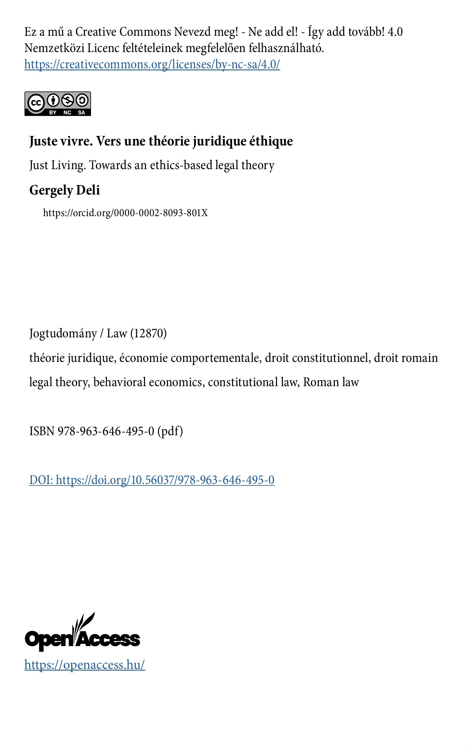 Ez a mű a Creative Commons Nevezd meg! - Ne add el! - Így add tovább! 4.0 Nemzetközi Licenc feltételeinek megfelelően felhasználható. https://creativecommons.org/licenses/by-nc-sa/4.0/ ©0989 Juste vivre. Vers une théorie juridique éthique Just Living. Towards an ethics-based legal theory Gergely Deli https://orcid.org/0000-0002-8093-801X Jogtudomäny / Law (12870) théorie juridique, économie comportementale, droit constitutionnel, droit romain legal theory, behavioral economics, constitutional law, Roman law ISBN 978-963-646-495-0 (pdf) DOE: https://doi.org/10.56037/978-963-646-495-0 OpenAocess https://openaccess.hu/