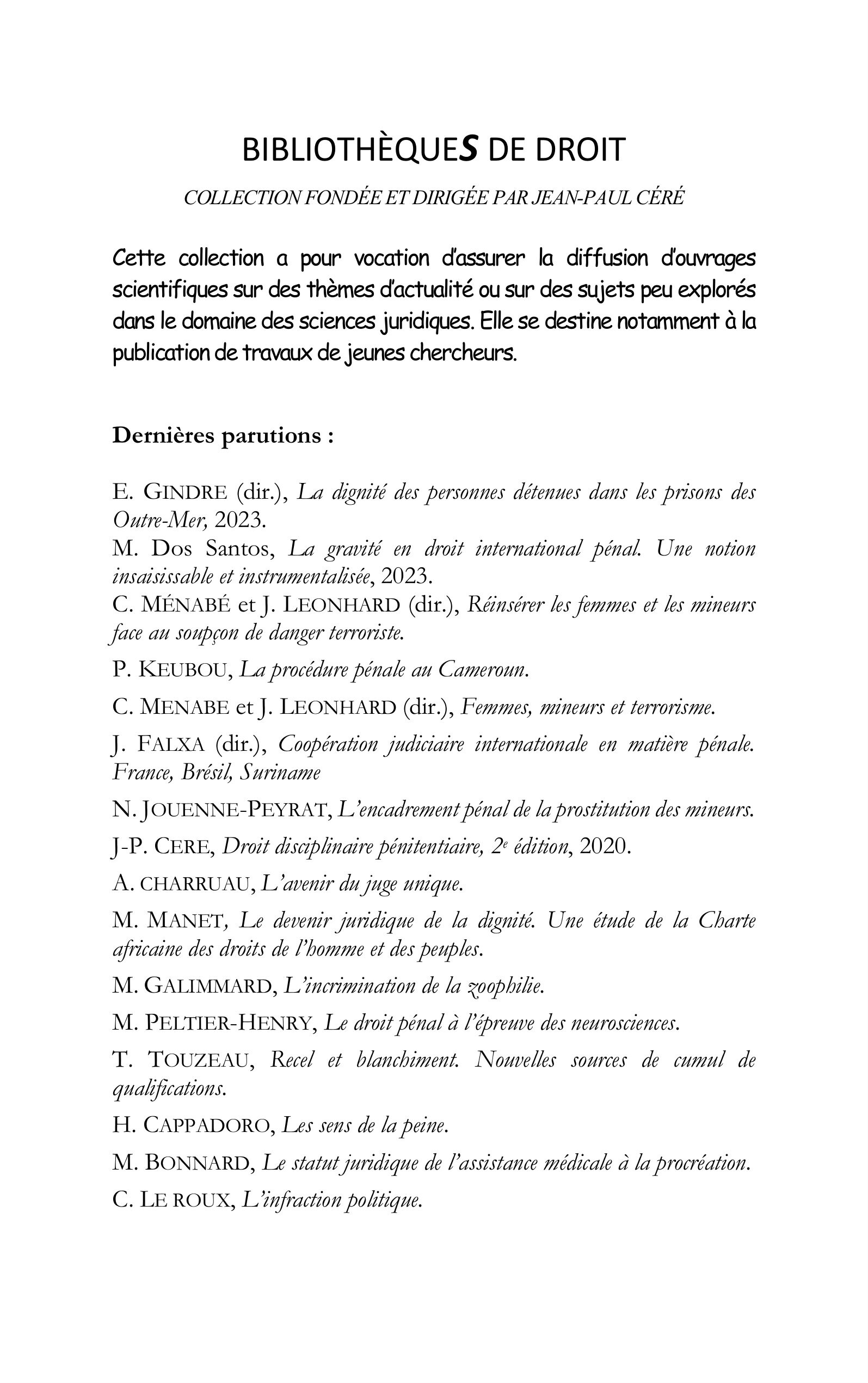 BIBLIOTHEQUES DE DROIT COLLECTION FONDEE ET DIRIGEE PAR JEAN-PAUL CERE Cette collection a pour vocation dassurer la diffusion douvrages scientifiques sur des themes dactualité ou sur des sujets peu explorés dans le domaine des sciences juridiques. Elle se destine notamment à la publication de travaux de jeunes chercheurs. Dernières parutions : E. GINDRE (dir.), La dignité des personnes détenues dans les prisons des Outre-Mer, 2023. M. Dos Santos, La gravité en droit international pénal. Une notion insaisissable et instrumentalisée, 2023. C. MENABE et J. LEONHARD (dir.), Rénsérer les femmes et les mineurs face au soupcon de danger terroriste. P. KEUBOU, La procédure pénale au Cameroun. C. MENABE et J. LEONHARD (dir.), Femmes, mineurs et terrorisme. J- FALXA (dir.), Cooperation judiciaire internationale en matière pénale. France, Brésil, Suriname N. JOUENNE-PEYRAT, L’encadrement penal de la prostitution des mineurs. J-P. CERE, Droit disciplinaire pénitentiaire, 2: édition, 2020. À. CHARRUAU, L'avenir du juge unique. M. MANET, Le devenir juridique de la dignité. Une étude de la Charte africaine des droits de l'homme et des peuples. M. GALIMMARD, Lincrimination de la zoophilie. M. PELTIER-HENRY, Le droit pénal a l’éprenve des neurosciences. T. TOUZEAU, Rece/ et blanchiment. Nouvelles sources de cumul de qualifications. H. CAPPADORO, Les sens de la peine. M. BONNARD, Le statut juridique de l'assistance médicale à la procréation. C. LE ROUX, L énfraction politique.