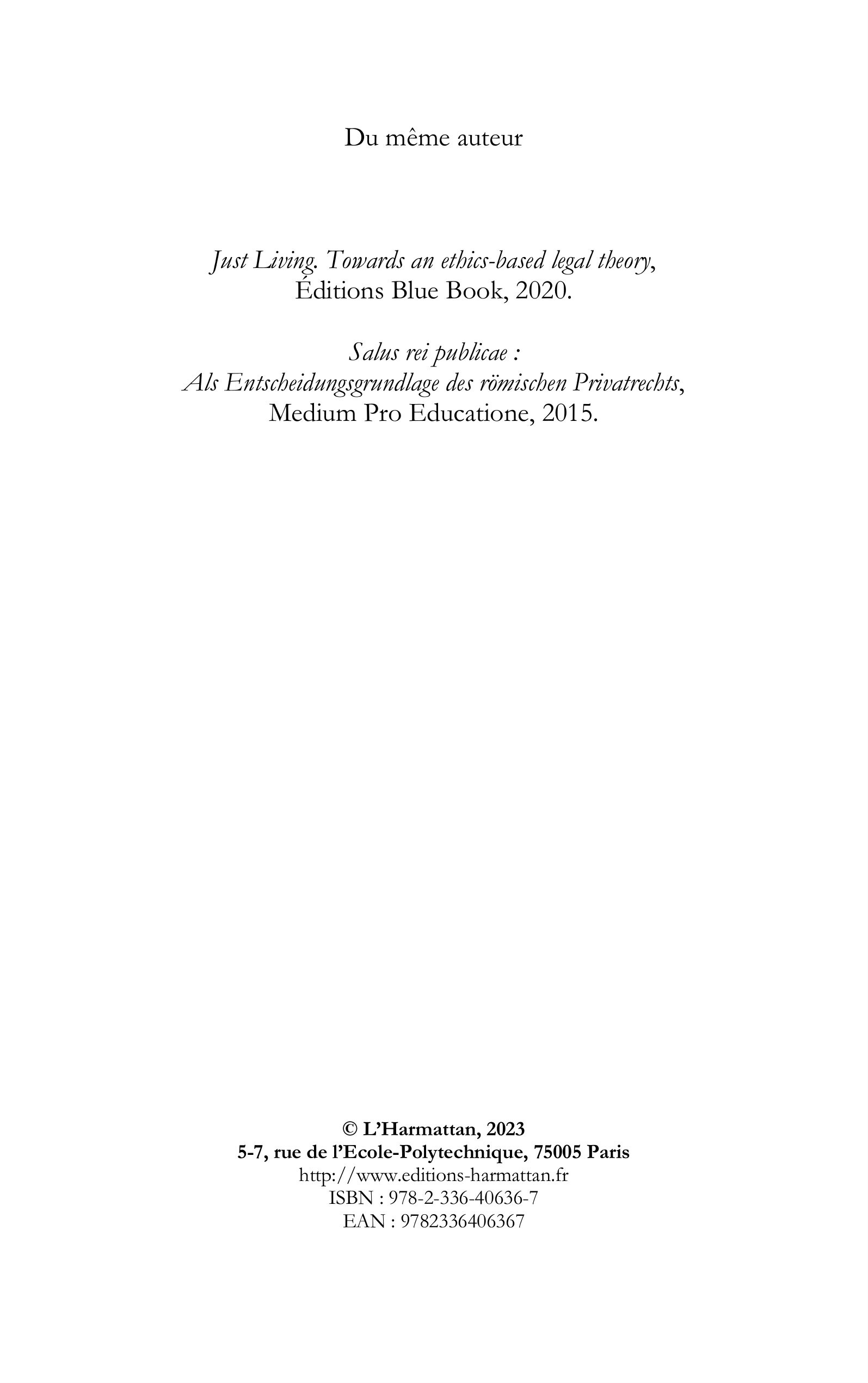 Du même auteur Just Living. Towards an ethics-based legal theory, Editions Blue Book, 2020. Salus rei publicae : Als Entscheidungsgrundlage des römischen Privatrechts, Medium Pro Educatione, 2015. © L’Harmattan, 2023 5-7, rue de l’Ecole-Polytechnique, 75005 Paris http://www.editions-harmattan.fr ISBN : 978-2-336-40636-7 EAN : 9782336406367