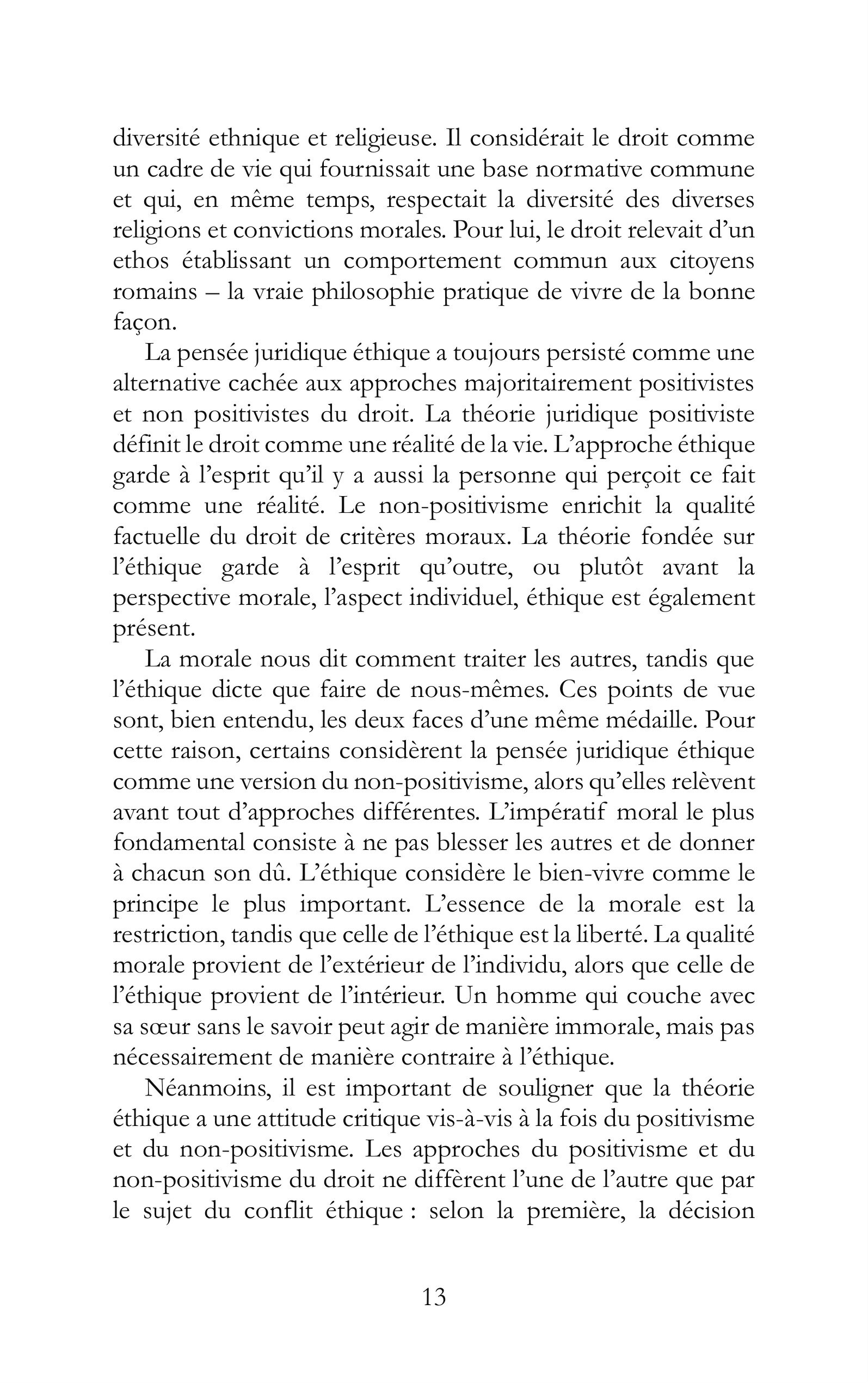 diversité ethnique et religieuse. Il considérait le droit comme un cadre de vie qui fournissait une base normative commune et qui, en même temps, respectait la diversité des diverses religions et convictions morales. Pour lui, le droit relevait d’un ethos établissant un comportement commun aux citoyens romains — la vraie philosophie pratique de vivre de la bonne façon. La pensée juridique éthique a toujours persisté comme une alternative cachée aux approches majoritairement positivistes et non positivistes du droit. La théorie juridique positiviste définit le droit comme une réalité de la vie. L’approche éthique garde à l'esprit qu’il y a aussi la personne qui perçoit ce fait comme une réalité. Le non-positivisme enrichit la qualité factuelle du droit de critères moraux. La théorie fondée sur l'éthique garde à lesprit qu’outre, ou plutôt avant la perspective morale, aspect individuel, éthique est également présent. La morale nous dit comment traiter les autres, tandis que léthique dicte que faire de nous-mêmes. Ces points de vue sont, bien entendu, les deux faces d’une même médaille. Pour cette raison, certains considèrent la pensée juridique éthique comme une version du non-positivisme, alors qu’elles relèvent avant tout d’approches différentes. L’impératif moral le plus fondamental consiste à ne pas blesser les autres et de donner a chacun son du. L’éthique considère le bien-vivre comme le principe le plus important. L’essence de la morale est la restriction, tandis que celle de l'éthique est la liberté. La qualité morale provient de l’extérieur de Pindividu, alors que celle de l'éthique provient de l’intérieur. Un homme qui couche avec sa sœur sans le savoir peut agir de manière immorale, mais pas nécessairement de manière contraire à l'éthique. Néanmoins, il est important de souligner que la théorie éthique a une attitude critique vis-à-vis à la fois du positivisme et du non-positivisme. Les approches du positivisme et du non-positivisme du droit ne diffèrent l’une de l’autre que par le sujet du conflit éthique : selon la première, la décision 13