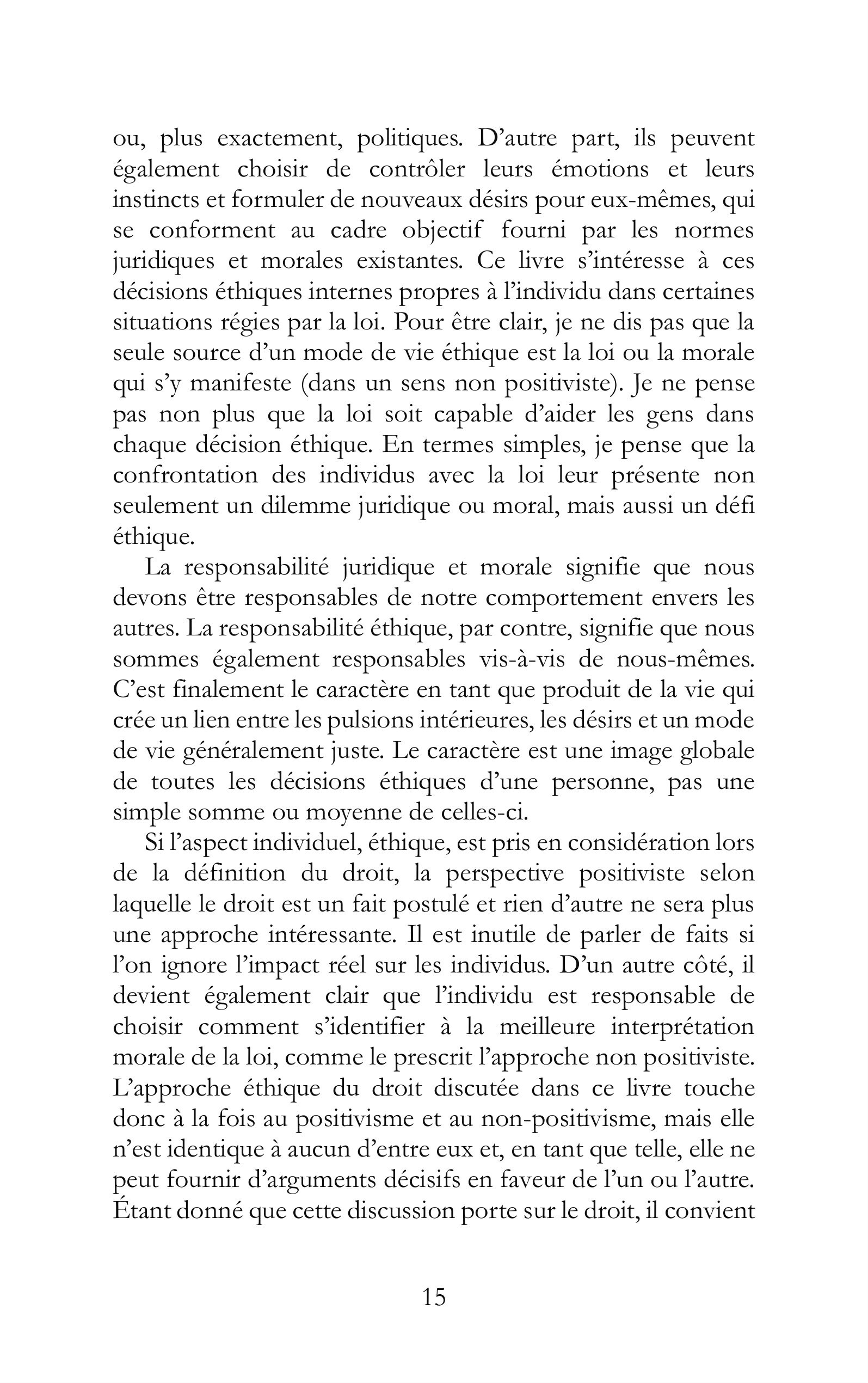ou, plus exactement, politiques. D’autre part, ils peuvent également choisir de contrôler leurs émotions et leurs instincts et formuler de nouveaux désirs pour eux-mêmes, qui se conforment au cadre objectif fourni par les normes juridiques et morales existantes. Ce livre s'intéresse a ces décisions éthiques internes propres à l’individu dans certaines situations régies par la loi. Pour être clair, je ne dis pas que la seule source d’un mode de vie éthique est la loi ou la morale qui s’y manifeste (dans un sens non positiviste). Je ne pense pas non plus que la loi soit capable d’aider les gens dans chaque décision éthique. En termes simples, je pense que la confrontation des individus avec la loi leur présente non seulement un dilemme juridique ou moral, mais aussi un défi éthique. La responsabilité juridique et morale signifie que nous devons être responsables de notre comportement envers les autres. La responsabilité éthique, par contre, signifie que nous sommes également responsables vis-à-vis de nous-mêmes. C’est finalement le caractère en tant que produit de la vie qui crée un lien entre les pulsions intérieures, les désirs et un mode de vie généralement juste. Le caractère est une image globale de toutes les décisions éthiques d’une personne, pas une simple somme ou moyenne de celles-ci. Si l'aspect individuel, éthique, est pris en considération lors de la définition du droit, la perspective positiviste selon laquelle le droit est un fait postulé et rien d’autre ne sera plus une approche intéressante. Il est inutile de parler de faits si lon ignore l’impact réel sur les individus. D'un autre côté, il devient également clair que l'individu est responsable de choisir comment s'identifier à la meilleure interpretation morale de la loi, comme le prescrit l’approche non positiviste. L'approche éthique du droit discutée dans ce livre touche donc à la fois au positivisme et au non-positivisme, mais elle n’est identique à aucun d’entre eux et, en tant que telle, elle ne peut fournir d'arguments décisifs en faveur de l’un ou l’autre. Étant donné que cette discussion porte sur le droit, il convient 15
