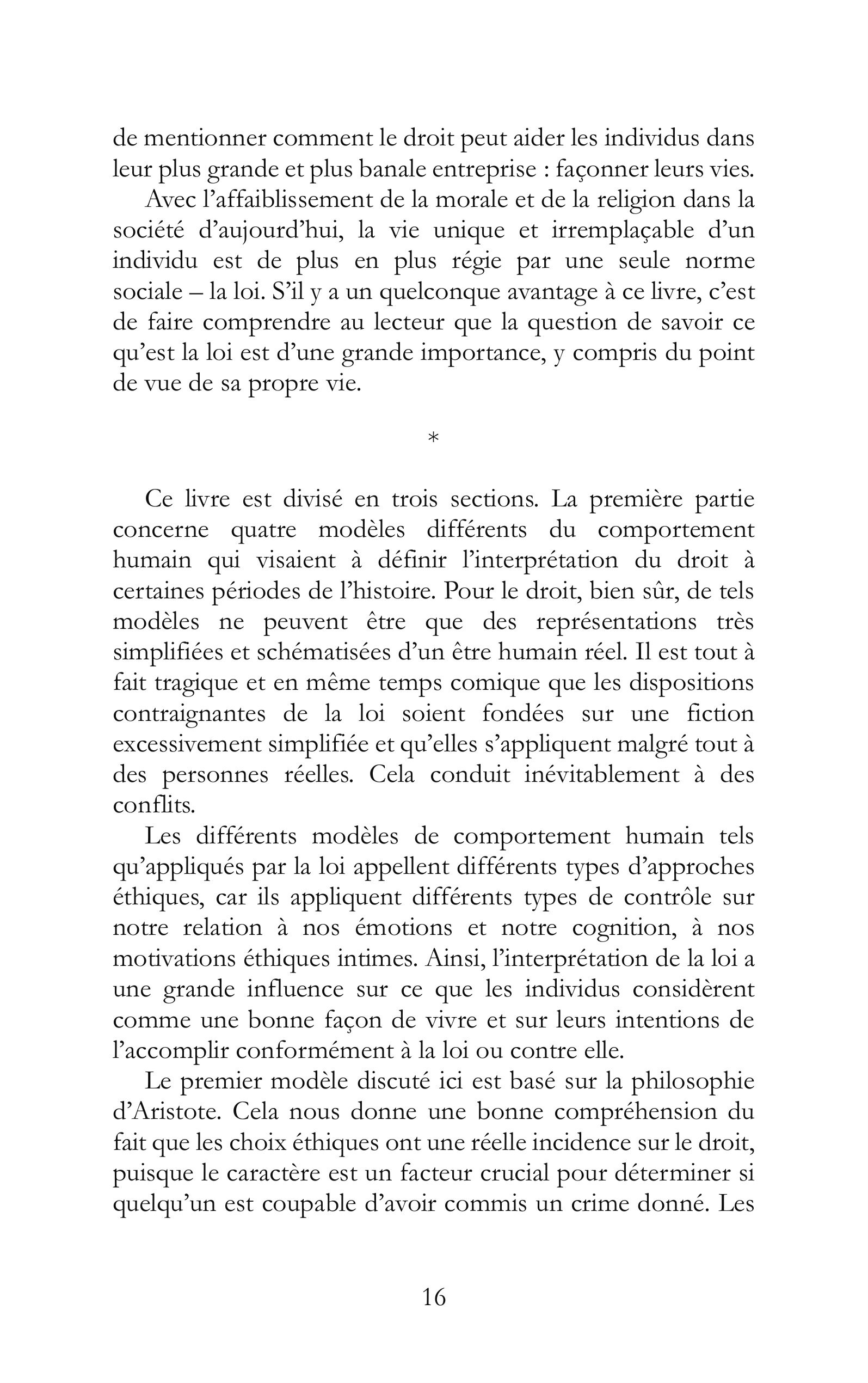 de mentionner comment le droit peut aider les individus dans leur plus grande et plus banale entreprise : façonner leurs vies. Avec l’affaiblissement de la morale et de la religion dans la société d’aujourd’hui, la vie unique et irremplaçable d’un individu est de plus en plus régie par une seule norme sociale — la loi. S’il y a un quelconque avantage à ce livre, c’est de faire comprendre au lecteur que la question de savoir ce qu'est la loi est d’une grande importance, y compris du point de vue de sa propre vie. Ce livre est divisé en trois sections. La première partie concerne quatre modèles différents du comportement humain qui visaient à définir l'interprétation du droit à certaines périodes de l’histoire. Pour le droit, bien sûr, de tels modèles ne peuvent être que des représentations très simplifiées et schématisées d’un être humain réel. Il est tout à fait tragique et en même temps comique que les dispositions contraignantes de la loi soient fondées sur une fiction excessivement simplifiée et qu’elles s'appliquent malgré tout à des personnes réelles. Cela conduit inévitablement à des conflits. Les différents modèles de comportement humain tels qu’appliques par la loi appellent différents types d’approches éthiques, car ils appliquent différents types de contrôle sur notre relation à nos émotions et notre cognition, à nos motivations éthiques intimes. Ainsi, l’interprétation de la loi a une grande influence sur ce que les individus considèrent comme une bonne façon de vivre et sur leurs intentions de Paccomplir conformément a la loi ou contre elle. Le premier modèle discuté ici est basé sur la philosophie d’Aristote. Cela nous donne une bonne compréhension du fait que les choix éthiques ont une réelle incidence sur le droit, puisque le caractère est un facteur crucial pour déterminer si quelqu'un est coupable d’avoir commis un crime donné. Les 16