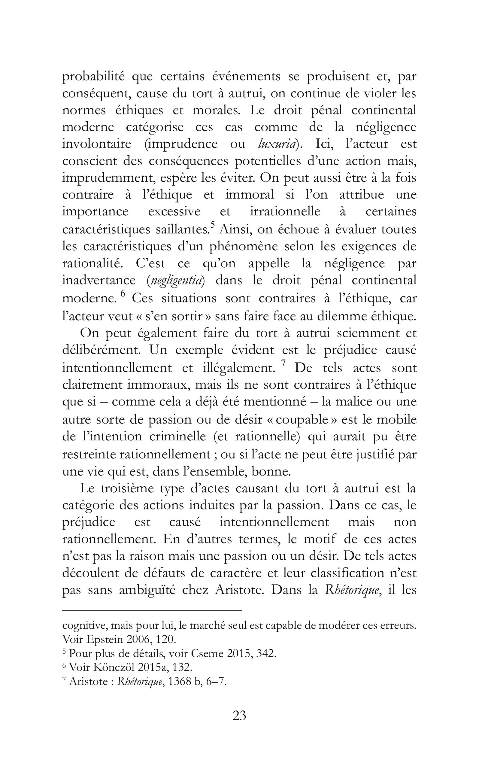 probabilité que certains événements se produisent et, par conséquent, cause du tort à autrui, on continue de violer les normes éthiques et morales. Le droit pénal continental moderne catégorise ces cas comme de la négligence involontaire (imprudence ou /wxuria). Ici, Vacteur est conscient des conséquences potentielles d’une action mais, imprudemment, espère les éviter. On peut aussi être à la fois contraire à léthique et immoral si l’on attribue une importance excessive et irrationnelle à certaines caractéristiques saillantes.” Ainsi, on échoue à évaluer toutes les caractéristiques d’un phénomène selon les exigences de rationalité. C’est ce qu’on appelle la négligence par inadvertance (neglgentia) dans le droit pénal continental moderne. ° Ces situations sont contraires à Péthique, car Pacteur veut « s’en sortir » sans faire face au dilemme éthique. On peut également faire du tort à autrui sciemment et délibérément. Un exemple évident est le préjudice causé intentionnellement et illégalement. T De tels actes sont clairement immoraux, mais ils ne sont contraires à l’éthique que si — comme cela a déjà été mentionné — la malice ou une autre sorte de passion ou de désir «coupable » est le mobile de l’intention criminelle (et rationnelle) qui aurait pu être restreinte rationnellement ; ou si l’acte ne peut être justifié par une vie qui est, dans l’ensemble, bonne. Le troisième type d’actes causant du tort à autrui est la catégorie des actions induites par la passion. Dans ce cas, le préjudice est causé intentionnellement mais non rationnellement. En d’autres termes, le motif de ces actes n’est pas la raison mais une passion ou un désir. De tels actes découlent de défauts de caractère et leur classification n’est pas sans ambiguïté chez Aristote. Dans la Rhétoriqne, il les cognitive, mais pour lui, le marché seul est capable de modérer ces erreurs. Voir Epstein 2006, 120. > Pour plus de détails, voir Cseme 2015, 342. 6 Voir Könczöl 2015a, 132. 7 Aristote : Rhétorique, 1368 b, 6-7. 23