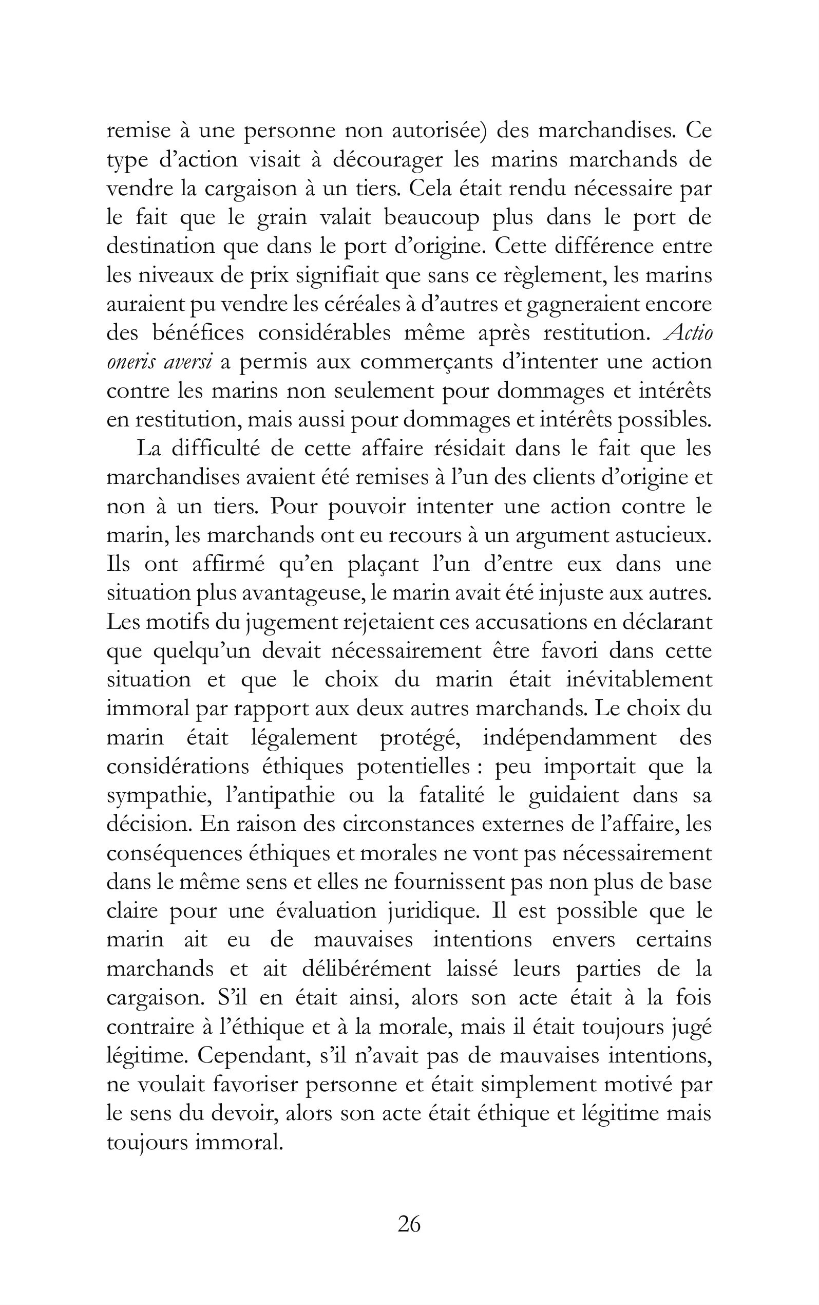 temise a une personne non autorisée) des marchandises. Ce type d’action visait à décourager les marins marchands de vendre la cargaison à un tiers. Cela était rendu nécessaire par le fait que le grain valait beaucoup plus dans le port de destination que dans le port d’origine. Cette différence entre les niveaux de prix signifiait que sans ce règlement, les marins auraient pu vendre les céréales à d’autres et gagneraient encore des bénéfices considérables même après restitution. Aciio oneris aversi a permis aux commerçants d’intenter une action contre les marins non seulement pour dommages et intérêts en restitution, mais aussi pour dommages et intérêts possibles. La difficulté de cette affaire résidait dans le fait que les marchandises avaient été remises à l’un des clients d’origine et non à un tiers. Pour pouvoir intenter une action contre le marin, les marchands ont eu recours à un argument astucieux. Ils ont affirmé qu’en plaçant l’un d’entre eux dans une situation plus avantageuse, le marin avait été injuste aux autres. Les motifs du jugement rejetaient ces accusations en déclarant que quelqu'un devait nécessairement être favori dans cette situation et que le choix du marin était inévitablement immoral par rapport aux deux autres marchands. Le choix du matin était légalement protégé, indépendamment des considérations éthiques potentielles : peu importait que la sympathie, lantipathie ou la fatalité le guidaient dans sa décision. En raison des circonstances externes de l'affaire, les conséquences éthiques et morales ne vont pas nécessairement dans le même sens et elles ne fournissent pas non plus de base claire pour une évaluation juridique. Il est possible que le matin ait eu de mauvaises intentions envers certains marchands et ait délibérément laissé leurs parties de la cargaison. S'il en était ainsi, alors son acte était à la fois contraire à l’éthique et à la morale, mais il était toujours jugé légitime. Cependant, s’il n’avait pas de mauvaises intentions, ne voulait favoriser personne et était simplement motivé par le sens du devoir, alors son acte était éthique et légitime mais toujours immoral. 26