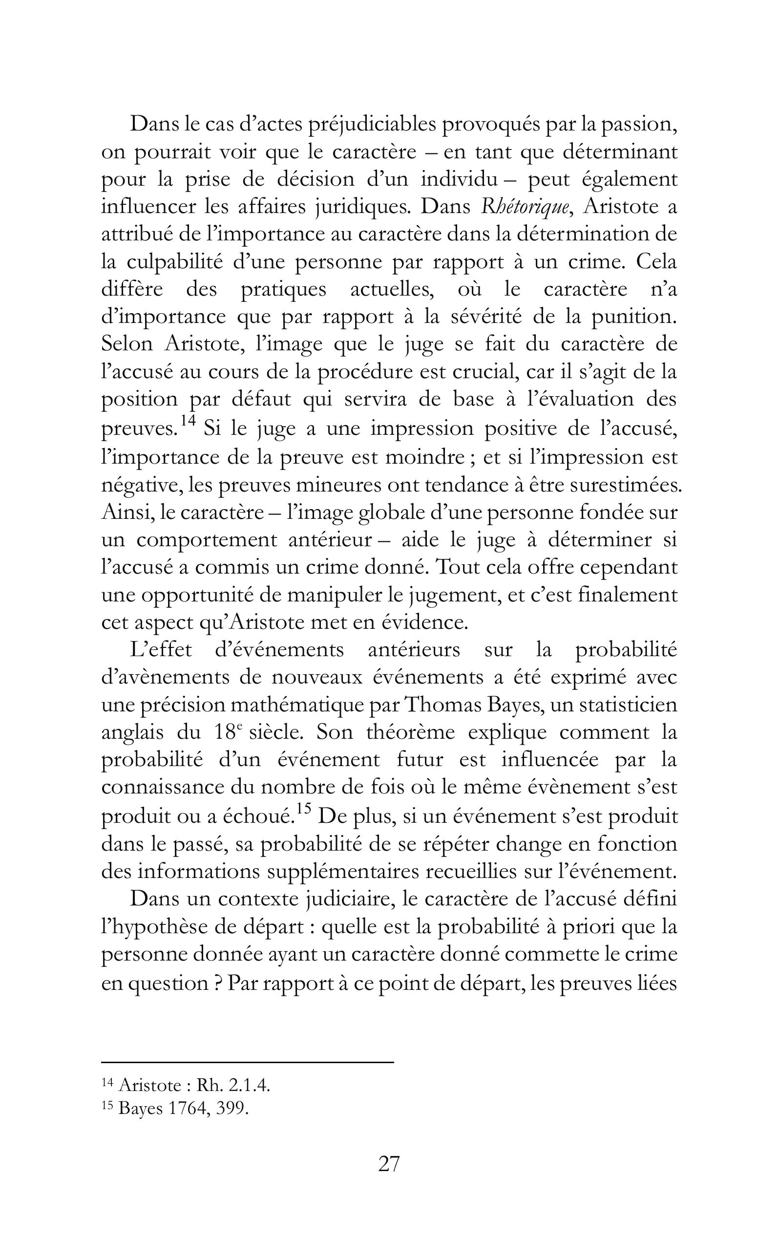 Dans le cas d’actes préjudiciables provoqués par la passion, on pourrait voir que le caractère — en tant que déterminant pour la prise de décision d’un individu — peut également influencer les affaires juridiques. Dans Rhéforique, Aristote a attribué de l’importance au caractère dans la détermination de la culpabilité d’une personne par rapport à un crime. Cela diffère des pratiques actuelles, où le caractère n’a d'importance que par rapport à la sévérité de la punition. Selon Aristote, l’image que le juge se fait du caractère de Paccusé au cours de la procédure est crucial, car il s’agit de la position par défaut qui servira de base à l’évaluation des preuves. l* Si le juge à une impression positive de l'accusé, Pimportance de la preuve est moindre ; et si ’impression est négative, les preuves mineures ont tendance à être surestimées. Ainsi, le caractère — l’image globale d’une personne fondée sur un comportement antérieur — aide le juge à déterminer si Paccusé a commis un crime donné. Tout cela offre cependant une opportunité de manipuler le jugement, et c’est finalement cet aspect qu’Aristote met en évidence. L'effet d'événements antérieurs sur la probabilité d’avènements de nouveaux événements a été exprimé avec une précision mathématique par Thomas Bayes, un statisticien anglais du 18° siècle. Son théorème explique comment la probabilité d’un événement futur est influencée par la connaissance du nombre de fois où le même évènement s’est produit ou a échoué. ! De plus, si un événement s’est produit dans le passé, sa probabilité de se répéter change en fonction des informations supplémentaires recueillies sur l'événement. Dans un contexte judiciaire, le caractère de l’accusé défini l'hypothèse de départ : quelle est la probabilité à priori que la personne donnée ayant un caractère donné commette le crime en question ? Par rapport à ce point de départ, les preuves liées 14 Aristote : Rh. 2.1.4. 15 Bayes 1764, 399. 27