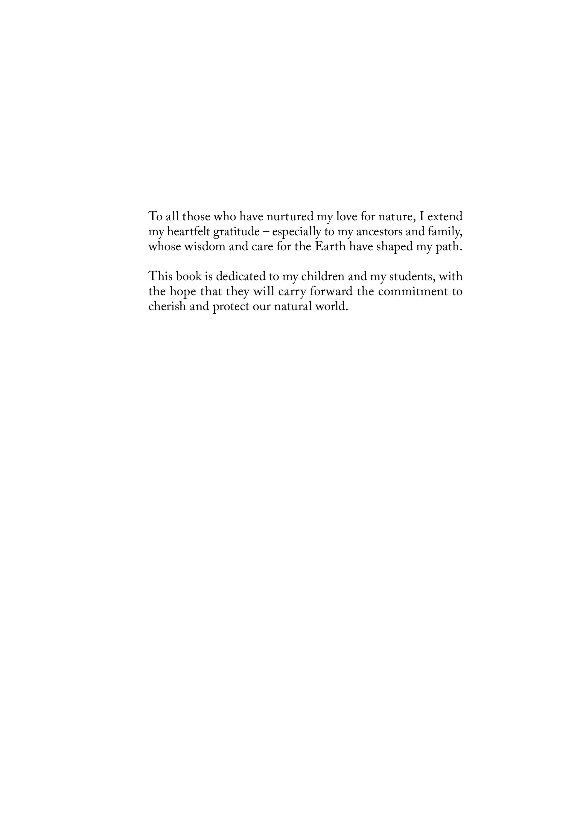 "10 all those who have nurtured my love for nature, I extend my heartfelt gratitude — especially to my ancestors and family, whose wisdom and care for the Earth have shaped my path. This book is dedicated to my children and my students, with the hope that they will carry forward the commitment to cherish and protect our natural world.