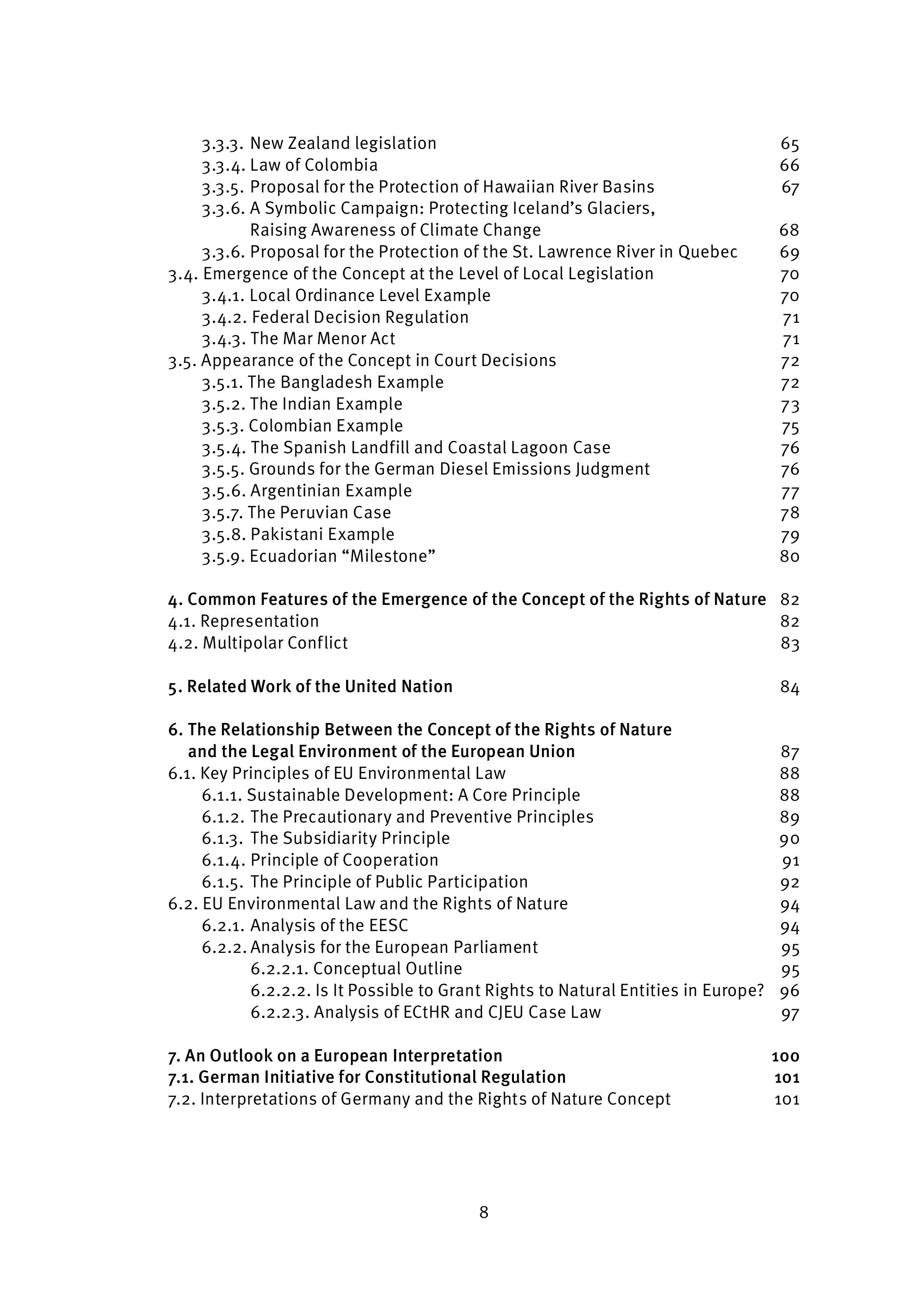 3.3.3. New Zealand legislation 65 3.3.4. Law of Colombia 66 3.3.5. Proposal for the Protection of Hawaiian River Basins 67 3.3.6. A Symbolic Campaign: Protecting Iceland’s Glaciers, Raising Awareness of Climate Change 68 3.3.6. Proposal for the Protection of the St. Lawrence River in Quebec 69 3.4. Emergence of the Concept at the Level of Local Legislation 70 3.4.1. Local Ordinance Level Example 70 3.4.2. Federal Decision Regulation 71 3.4.3. The Mar Menor Act 71 3.5. Appearance of the Concept in Court Decisions 72 3.5.1. The Bangladesh Example 72 3.5.2. The Indian Example 73 3.5.3. Colombian Example 75 3.5.4. The Spanish Landfill and Coastal Lagoon Case 76 3.5.5. Grounds for the German Diesel Emissions Judgment 76 3.5.6. Argentinian Example 77 3.5.7. The Peruvian Case 78 3.5.8. Pakistani Example 79 3.5.9. Ecuadorian “Milestone” 80 4. Common Features of the Emergence of the Concept of the Rights of Nature 82 4.1. Representation 82 4.2. Multipolar Conflict 83 5. Related Work of the United Nation 84 6. The Relationship Between the Concept of the Rights of Nature and the Legal Environment of the European Union 87 6.1. Key Principles of EU Environmental Law 88 6.1.1. Sustainable Development: A Core Principle 88 6.1.2. The Precautionary and Preventive Principles 89 6.1.3. The Subsidiarity Principle 90 6.1.4. Principle of Cooperation 91 6.1.5. The Principle of Public Participation 92 6.2. EU Environmental Law and the Rights of Nature 94 6.2.1. Analysis of the EESC 94 6.2.2. Analysis for the European Parliament 95 6.2.2.1. Conceptual Outline 95 6.2.2.2. Is It Possible to Grant Rights to Natural Entities in Europe? 96 6.2.2.3. Analysis of ECtHR and CJEU Case Law 97 7. An Outlook on a European Interpretation 100 7.1. German Initiative for Constitutional Regulation 101 7.2. Interpretations of Germany and the Rights of Nature Concept 101