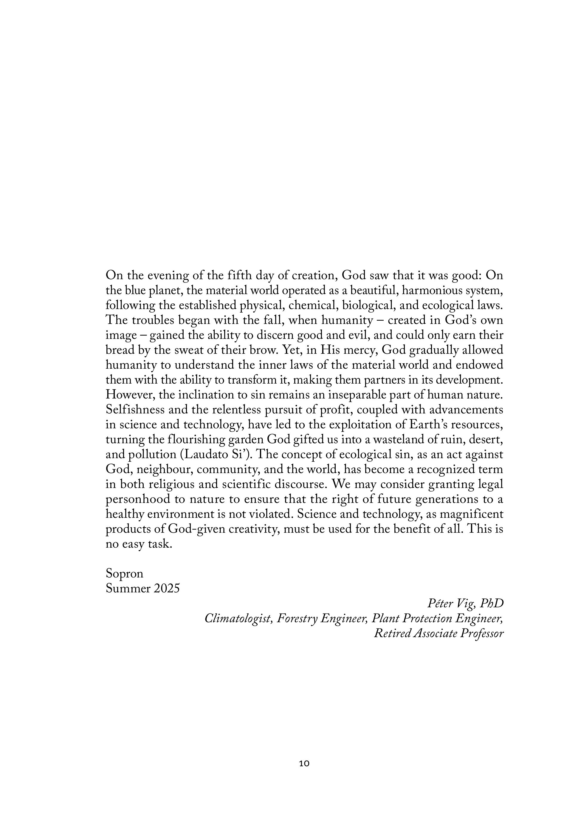 On the evening of the fifth day of creation, God saw that it was good: On the blue planet, the material world operated as a beautiful, harmonious system, following the established physical, chemical, biological, and ecological laws. The troubles began with the fall, when humanity — created in Gods own image — gained the ability to discern good and evil, and could only earn their bread by the sweat of their brow. Yet, in His mercy, God gradually allowed humanity to understand the inner laws of the material world and endowed them with the ability to transform it, making them partners in its development. However, the inclination to sin remains an inseparable part of human nature. Selfishness and the relentless pursuit of profit, coupled with advancements in science and technology, have led to the exploitation of Earth’s resources, turning the flourishing garden God gifted us into a wasteland of ruin, desert, and pollution (Laudato Si’). The concept of ecological sin, as an act against God, neighbour, community, and the world, has become a recognized term in both religious and scientific discourse. We may consider granting legal personhood to nature to ensure that the right of future generations to a healthy environment is not violated. Science and technology, as magnificent products of God-given creativity, must be used for the benefit of all. This is no easy task. Sopron Summer 2025 Péter Vig, PhD Climatologist, Forestry Engineer, Plant Protection Engineer, Retired Associate Professor 10