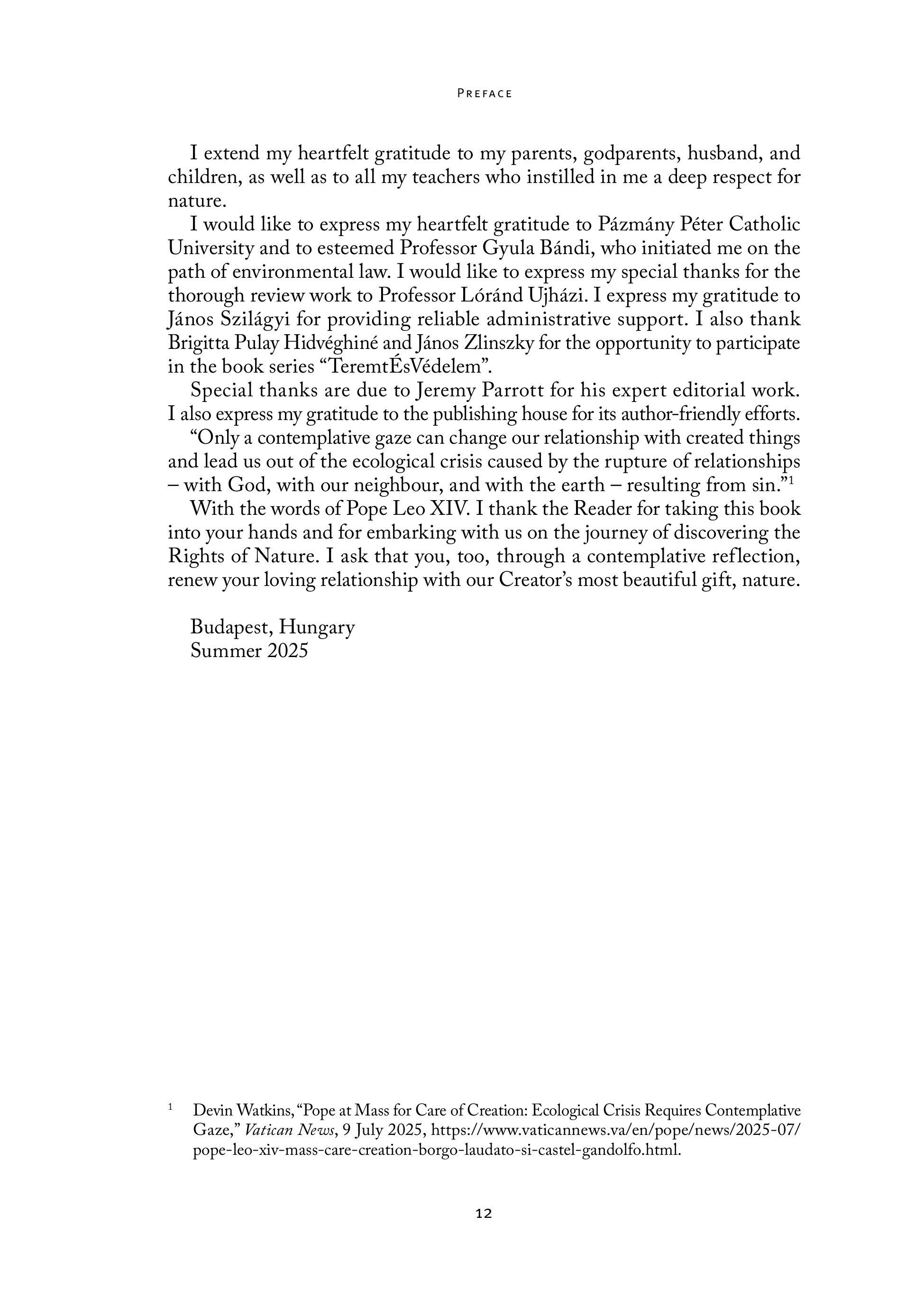 PREFACE I extend my heartfelt gratitude to my parents, godparents, husband, and children, as well as to all my teachers who instilled in me a deep respect for nature. I would like to express my heartfelt gratitude to Pázmány Péter Catholic University and to esteemed Professor Gyula Bándi, who initiated me on the path of environmental law. I would like to express my special thanks for the thorough review work to Professor Lóránd Ujházi. I express my gratitude to János Szilágyi for providing reliable administrative support. I also thank Brigitta Pulay Hidvéghiné and János Zlinszky for the opportunity to participate in the book series “TeremtEsVedelem”. Special thanks are due to Jeremy Parrott for his expert editorial work. I also express my gratitude to the publishing house for its author-friendly efforts. “Onlya contemplative gaze can change our relationship with created things and lead us out ofthe ecological crisis caused by the rupture of relationships — with God, with our neighbour, and with the earth — resulting from sin.”! With the words of Pope Leo XIV. I thank the Reader for taking this book into your hands and for embarking with us on the journey of discovering the Rights of Nature. I ask that you, too, through a contemplative reflection, renew your loving relationship with our Creator’s most beautiful gift, nature. Budapest, Hungary Summer 2025 1 Devin Watkins, “Pope at Mass for Care of Creation: Ecological Crisis Requires Contemplative Gaze,” Vatican News, 9 July 2025, https://www.vaticannews.va/en/pope/news/2025-07/ pope-leo-xiv-mass-care-creation-borgo-laudato-si-castel-gandolfo.html. 12
