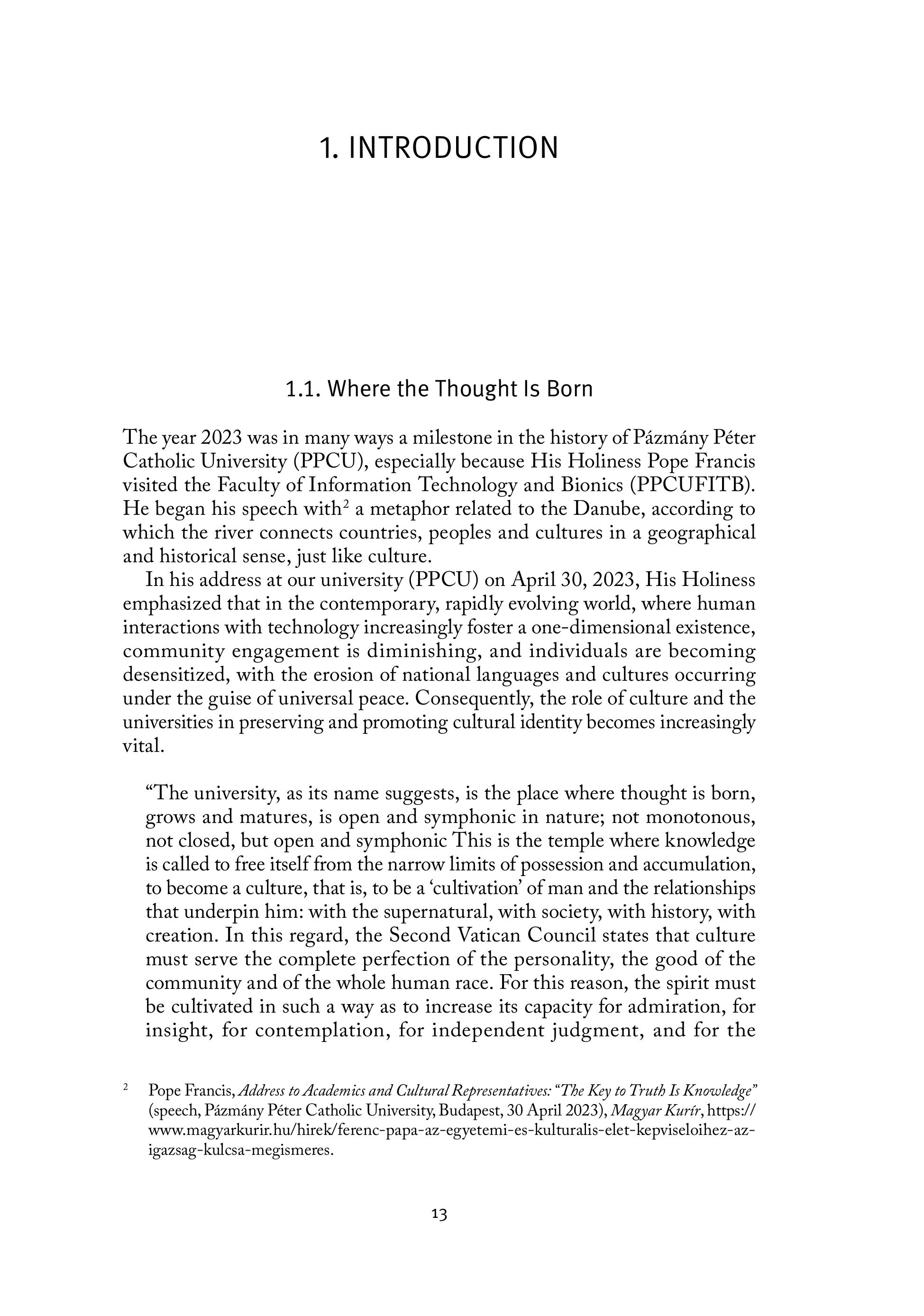 1. INTRODUCTION 1.1. Where the Thought Is Born The year 2023 was in many ways a milestone in the history of Pázmány Péter Catholic University (PPCU), especially because His Holiness Pope Francis visited the Faculty of Information Technology and Bionics (PPCUFITB). He began his speech with’ a metaphor related to the Danube, according to which the river connects countries, peoples and cultures in a geographical and historical sense, just like culture. In his address at our university (PPCU) on April 30, 2023, His Holiness emphasized that in the contemporary, rapidly evolving world, where human interactions with technology increasingly foster a one-dimensional existence, community engagement is diminishing, and individuals are becoming desensitized, with the erosion of national languages and cultures occurring under the guise of universal peace. Consequently, the role of culture and the universities in preserving and promoting cultural identity becomes increasingly vital. “The university, as its name suggests, is the place where thought is born, grows and matures, is open and symphonic in nature; not monotonous, not closed, but open and symphonic This is the temple where knowledge is called to free itself from the narrow limits of possession and accumulation, to become a culture, that is, to be a ‘cultivation’ of man and the relationships that underpin him: with the supernatural, with society, with history, with creation. In this regard, the Second Vatican Council states that culture must serve the complete perfection of the personality, the good of the community and of the whole human race. For this reason, the spirit must be cultivated in such a way as to increase its capacity for admiration, for insight, for contemplation, for independent judgment, and for the > Pope Francis, Address to Academics and Cultural Representatives: “The Key to Truth Is Knowledge” (speech, Pazmany Péter Catholic University, Budapest, 30 April 2023), Magyar Kurir, https:// www.magyarkurir. hu/hirek/ferenc-papa-az-egyetemi-es-kulturalis-elet-kepviseloihez-azigazsag-kulcsa-megismeres. 13